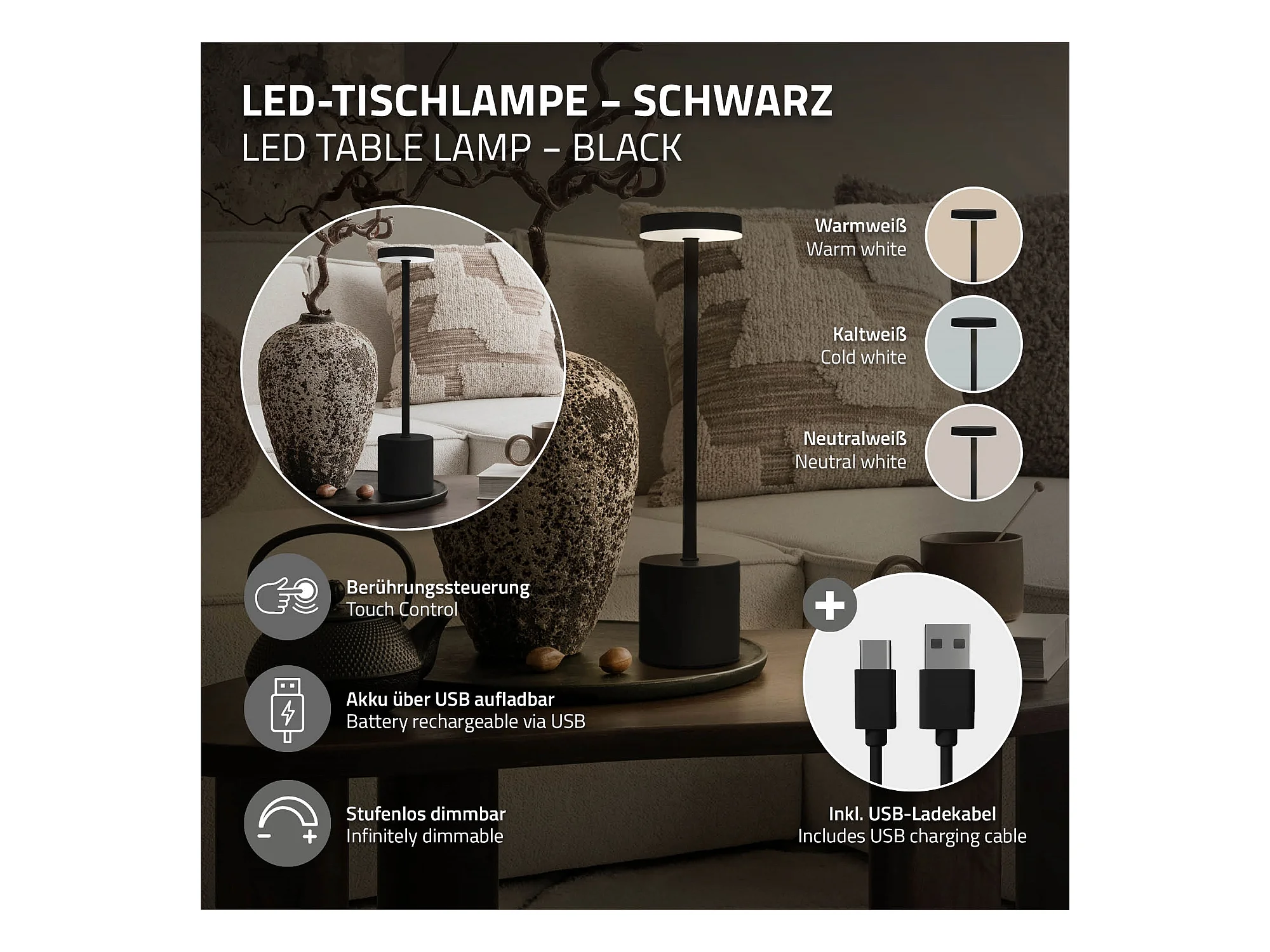 Lampe de table LED Ø8x34,5cm noire 3 couleurs d'intensité réglables capteur tactile batterie rechargeable USB-C éclairage de bureau autonomie longue