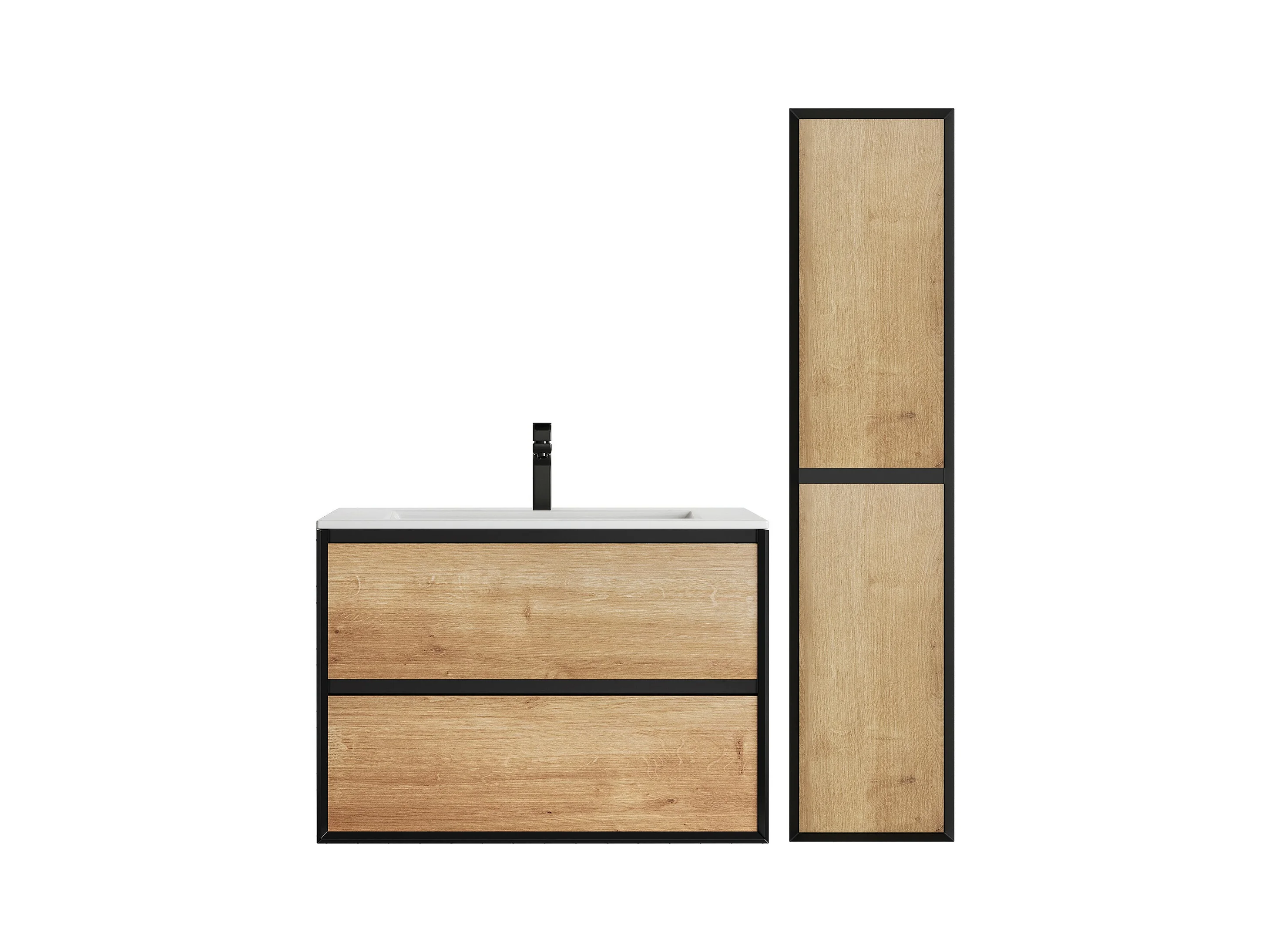 Meuble de salle de bain suspendu avec vasque à encastrer et colonne - Coloris naturel clair et noir - 80 cm - LANNICK