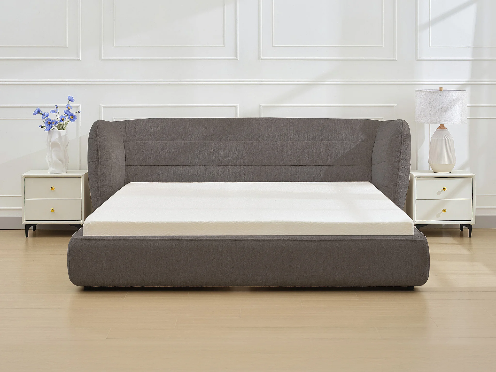 Lit 140 x 200 cm avec tête de lit incurvée - Tissu bouclette - Gris + Matelas - LARUMO de Maison Céphy