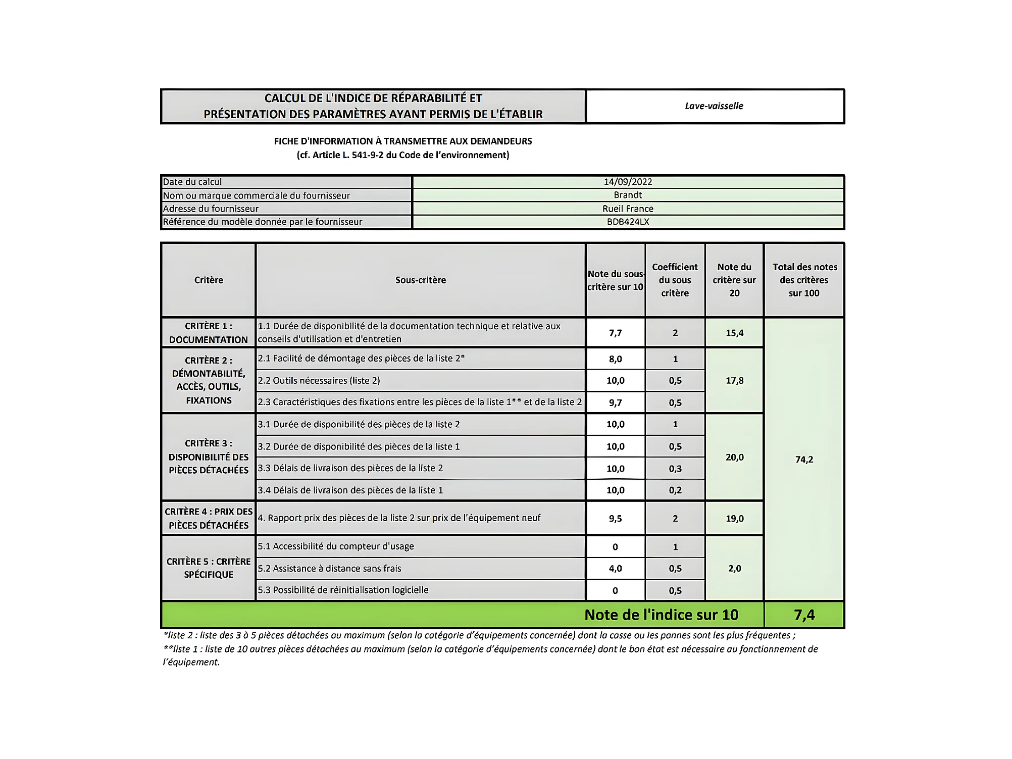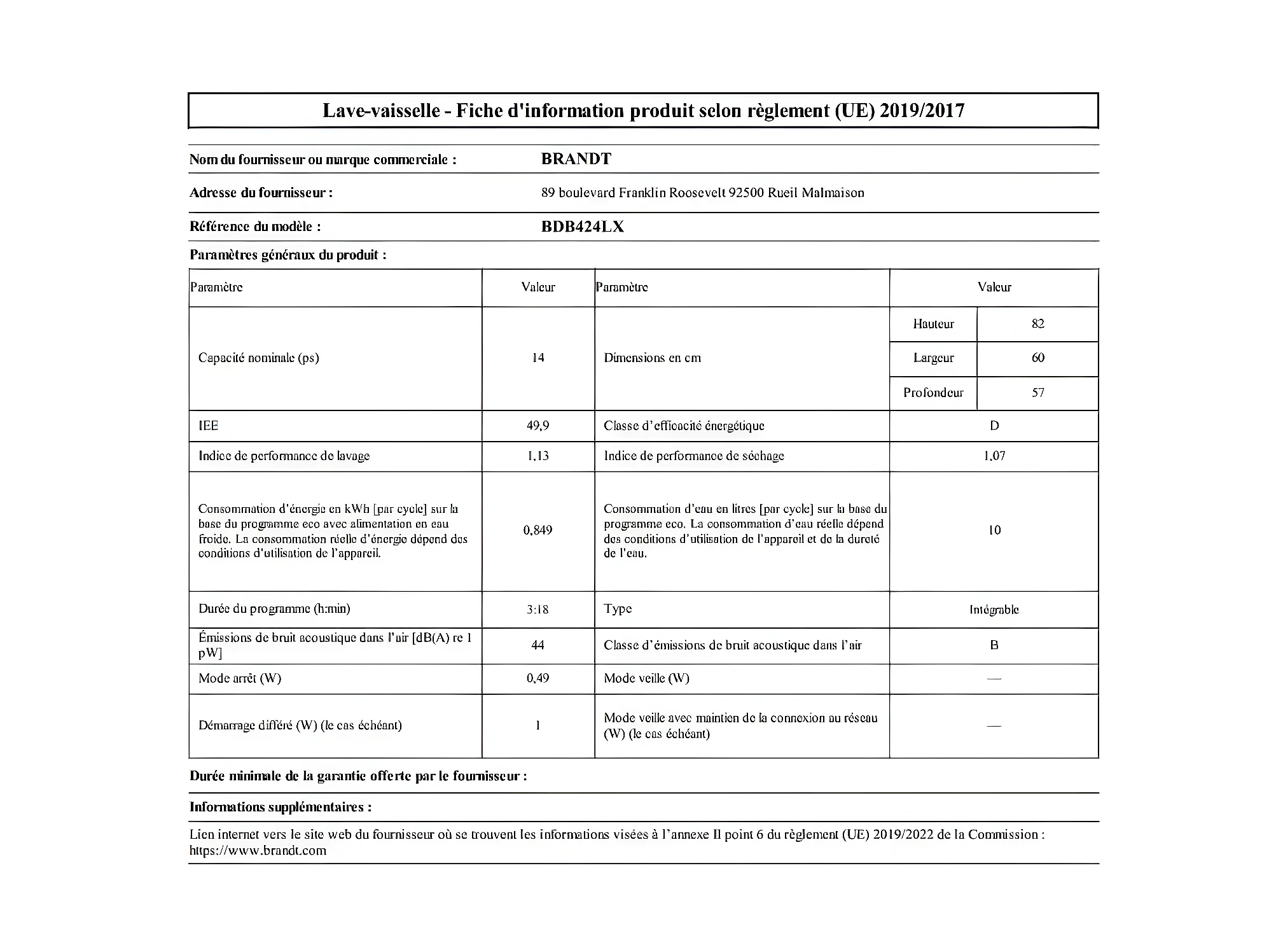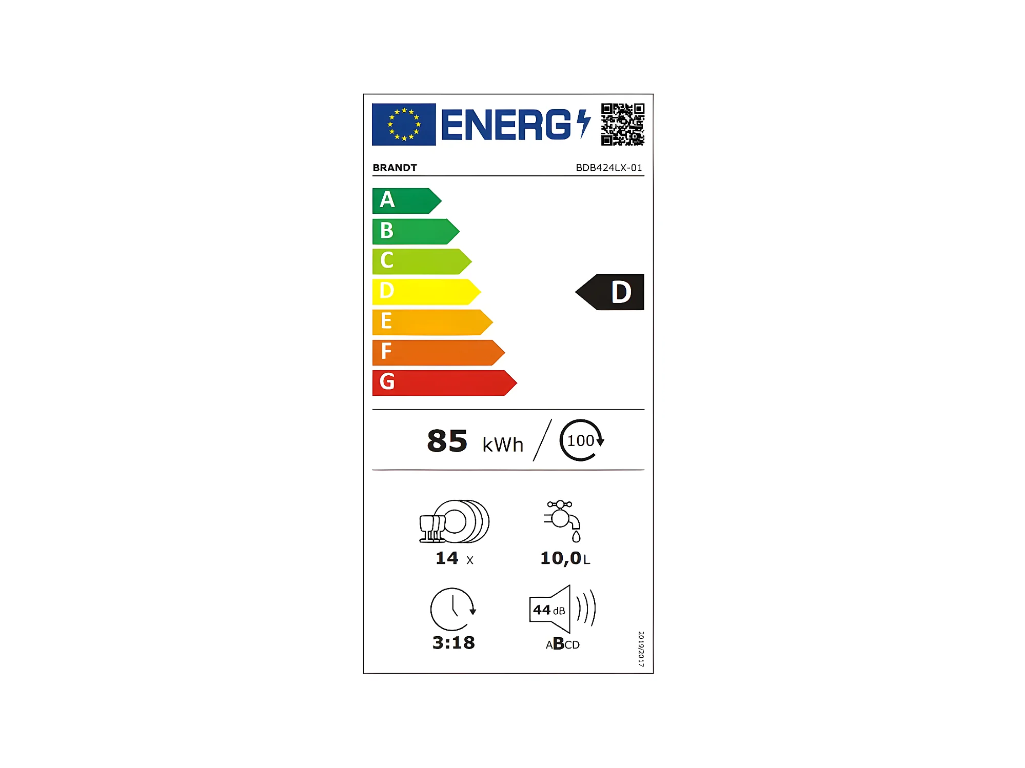 Lave-vaisselle encastrable BRANDT 14 Couverts 59.8cm D, BDB424LX