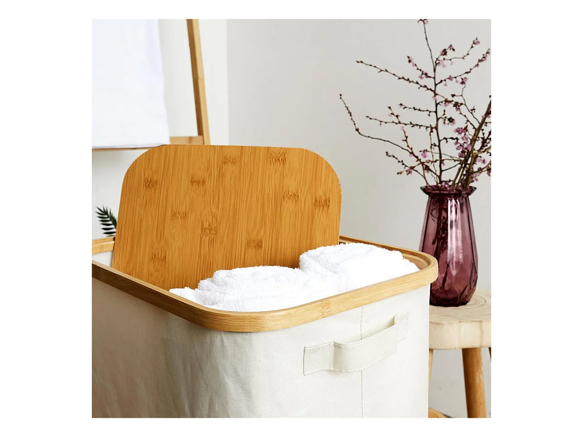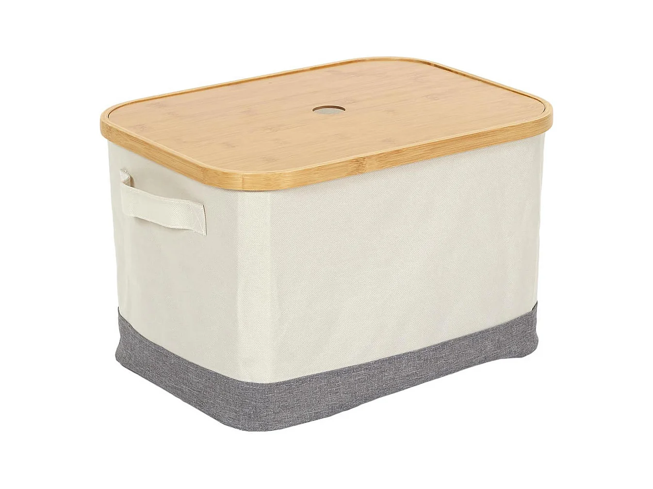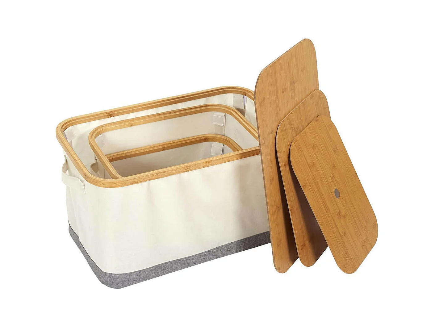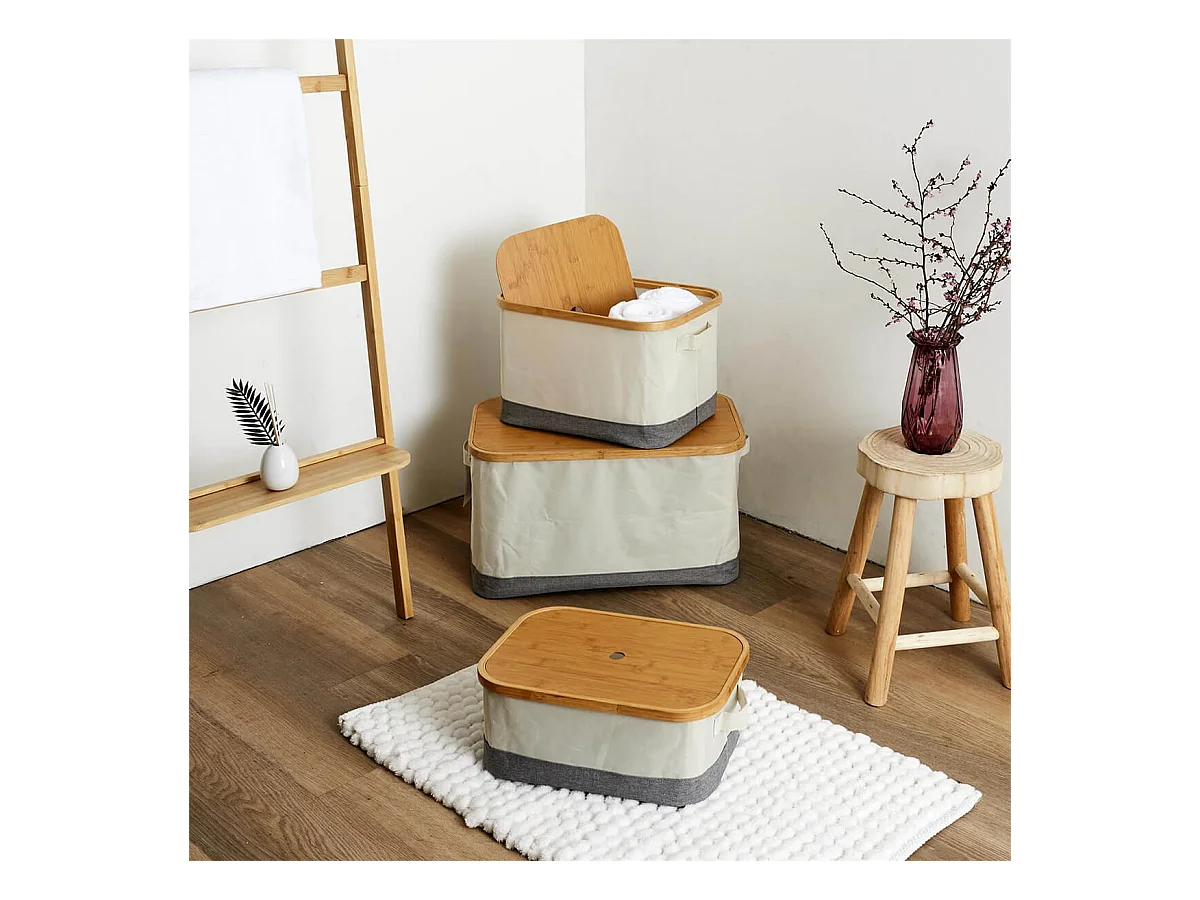 LAZEN - Lot de 3 Panières Bambou avec Couvercle Tissu Blanc et Gris