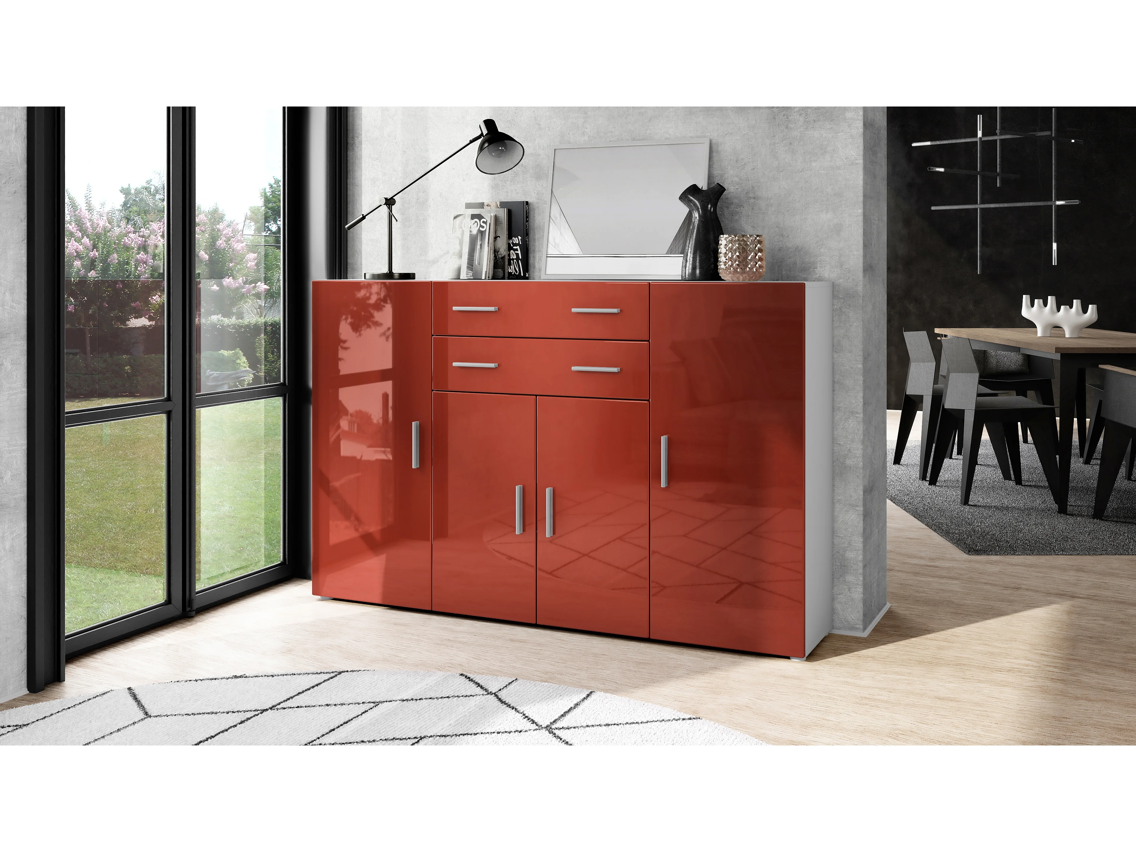 Le Buffet Haut Aron bahut avec 2 tiroirs et 4 portes avec un total de 8 compartiments derrière, blanc mat/bordeaux haute brillance (166,5 x 106,5 x 35 cm)