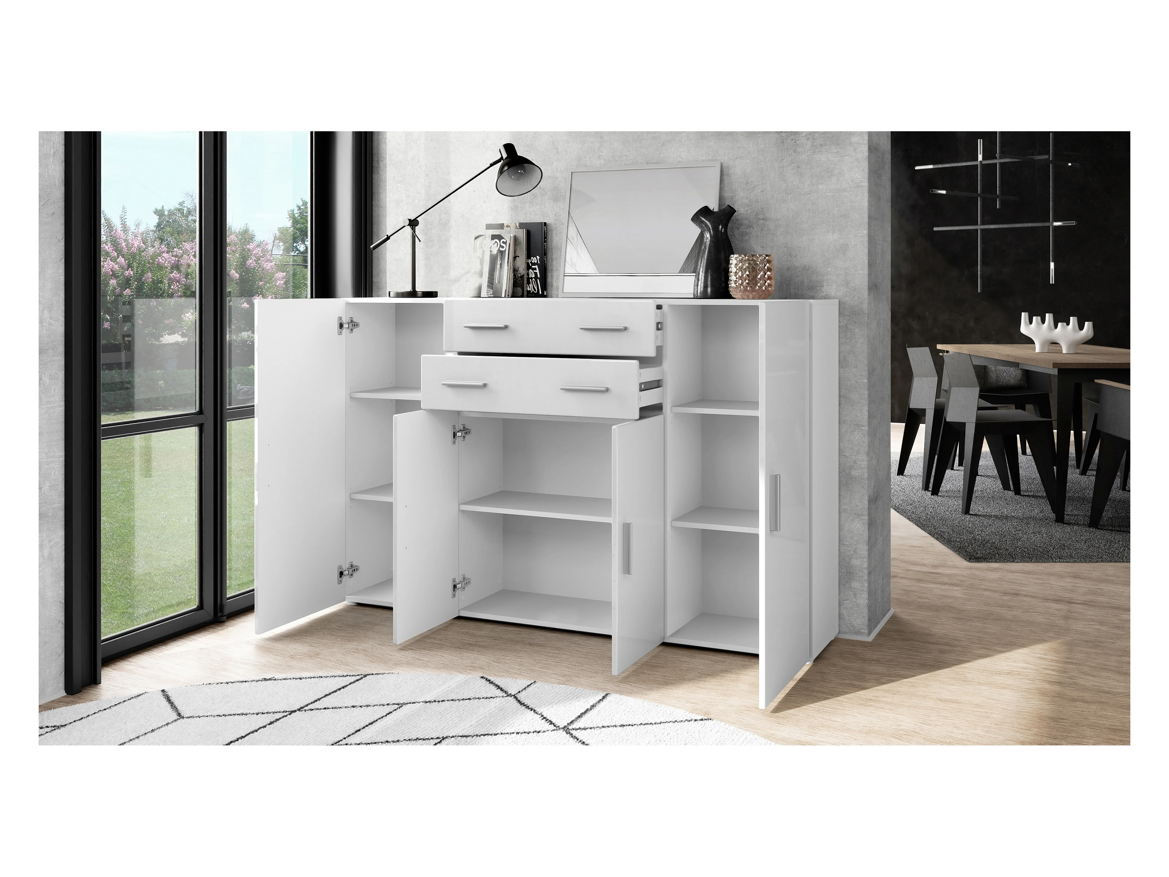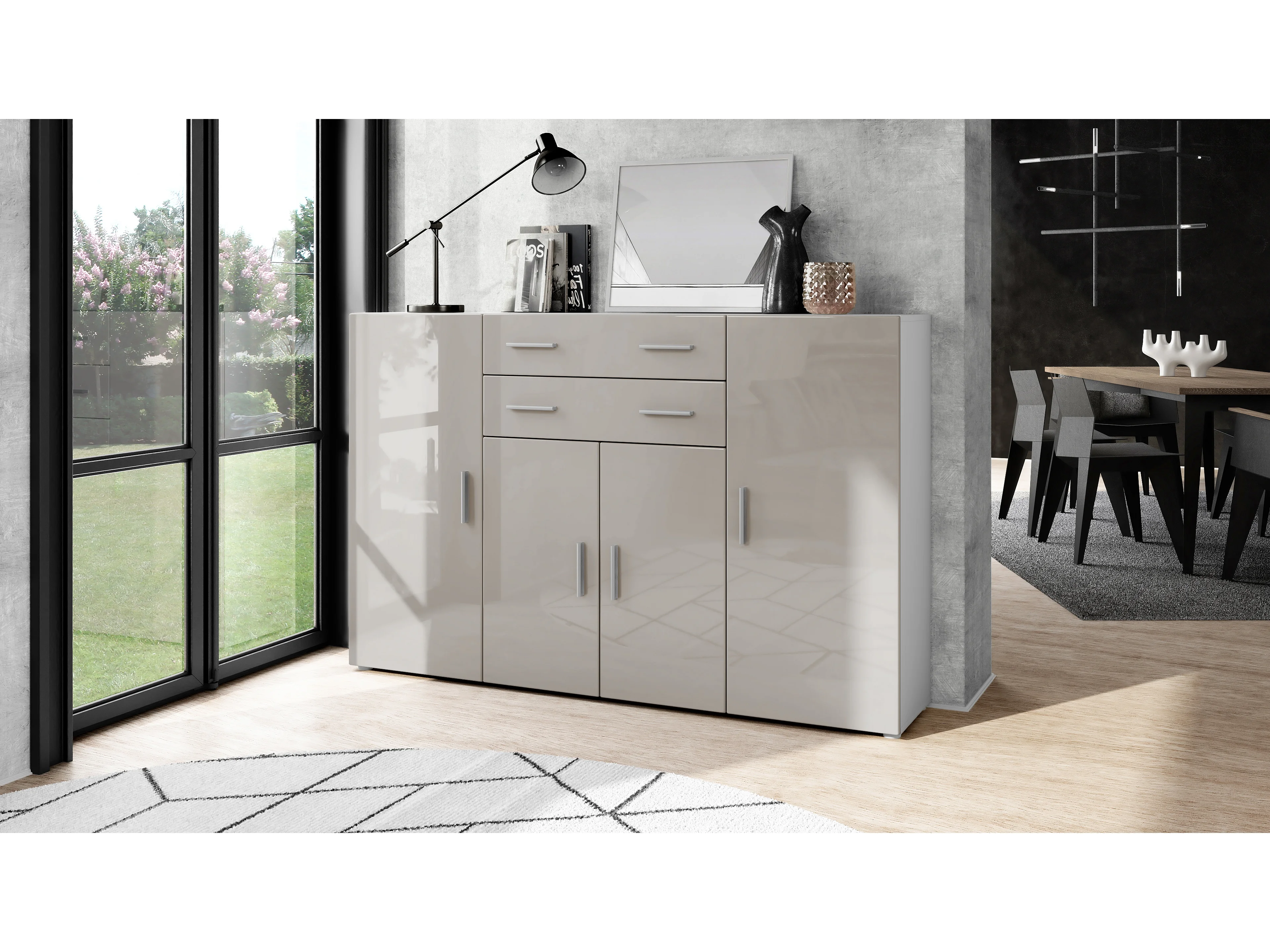 Le Buffet Haut Aron bahut avec 2 tiroirs et 4 portes avec un total de 8 compartiments derrière, blanc mat/gris sable haute brillance (166,5 x 106,5 x 35 cm)
