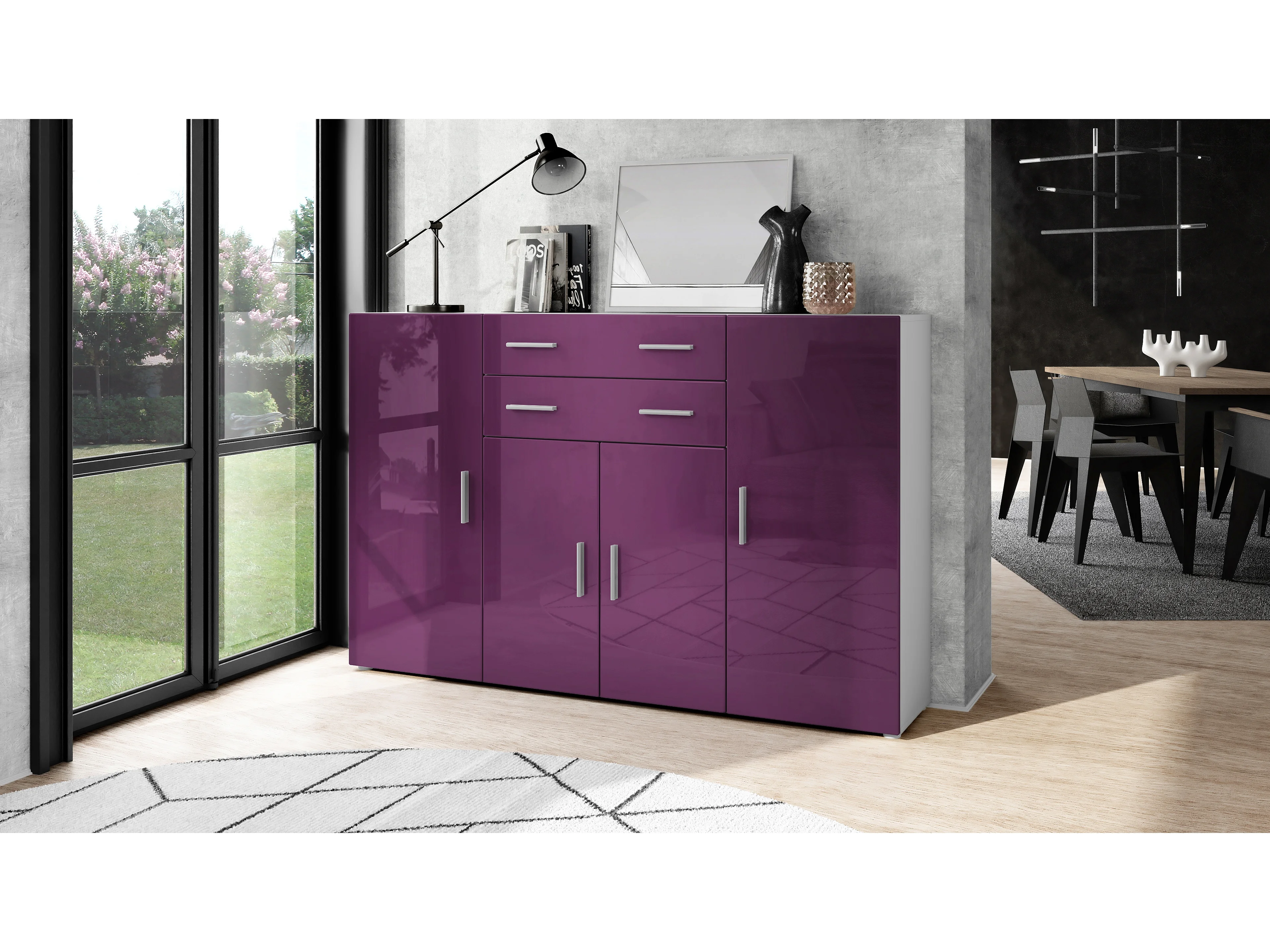 Le Buffet Haut Aron bahut avec 2 tiroirs et 4 portes avec un total de 8 compartiments derrière, blanc mat/mûre haute brillance (166,5 x 106,5 x 35 cm)