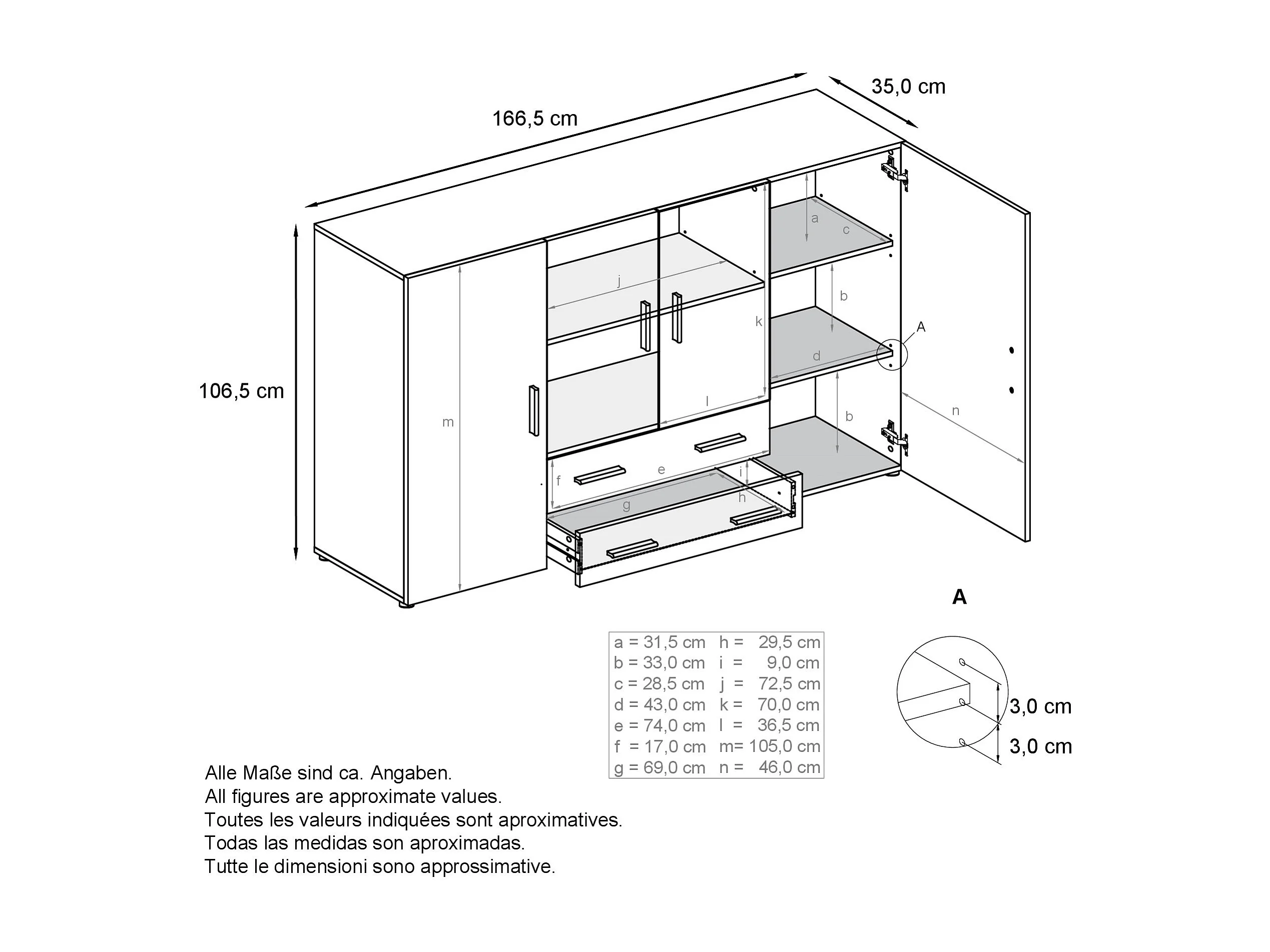 Le Buffet Haut Nora bahut avec 2 tiroirs et 4 portes avec un total de 8 compartiments derrière, anthracite mat/bordeaux haute brillance (166,5 x 106,5 x 35 cm)