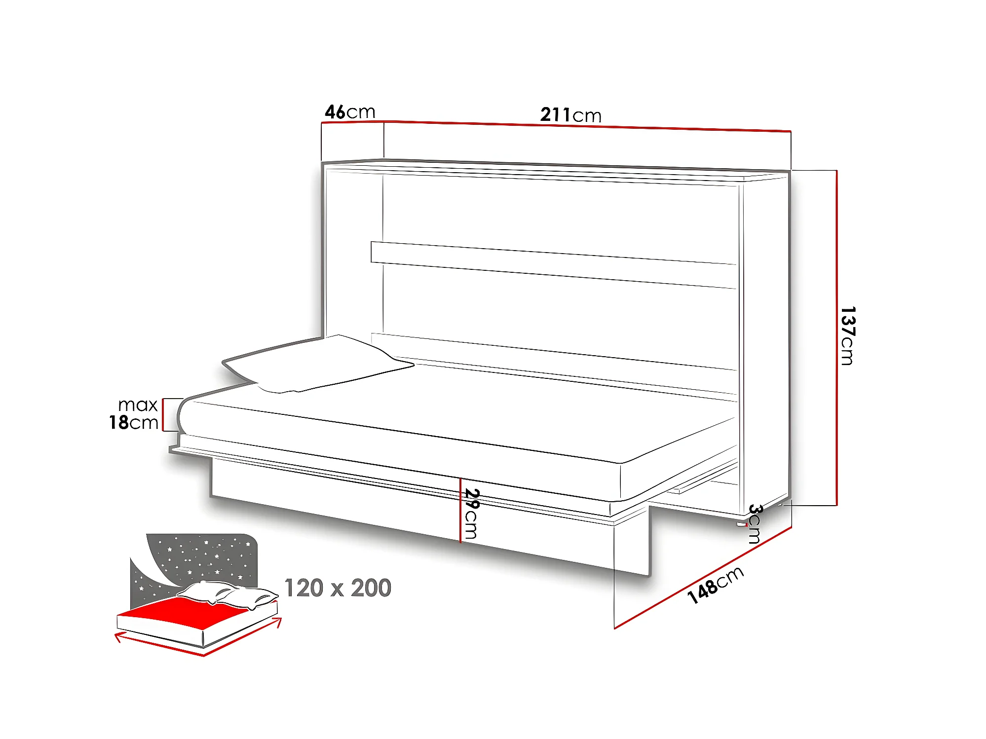 Lenart Lit escamotable MATELAS inclus Horizontal 120x200cm Chêne artisan Lit Rabattable"Consus"