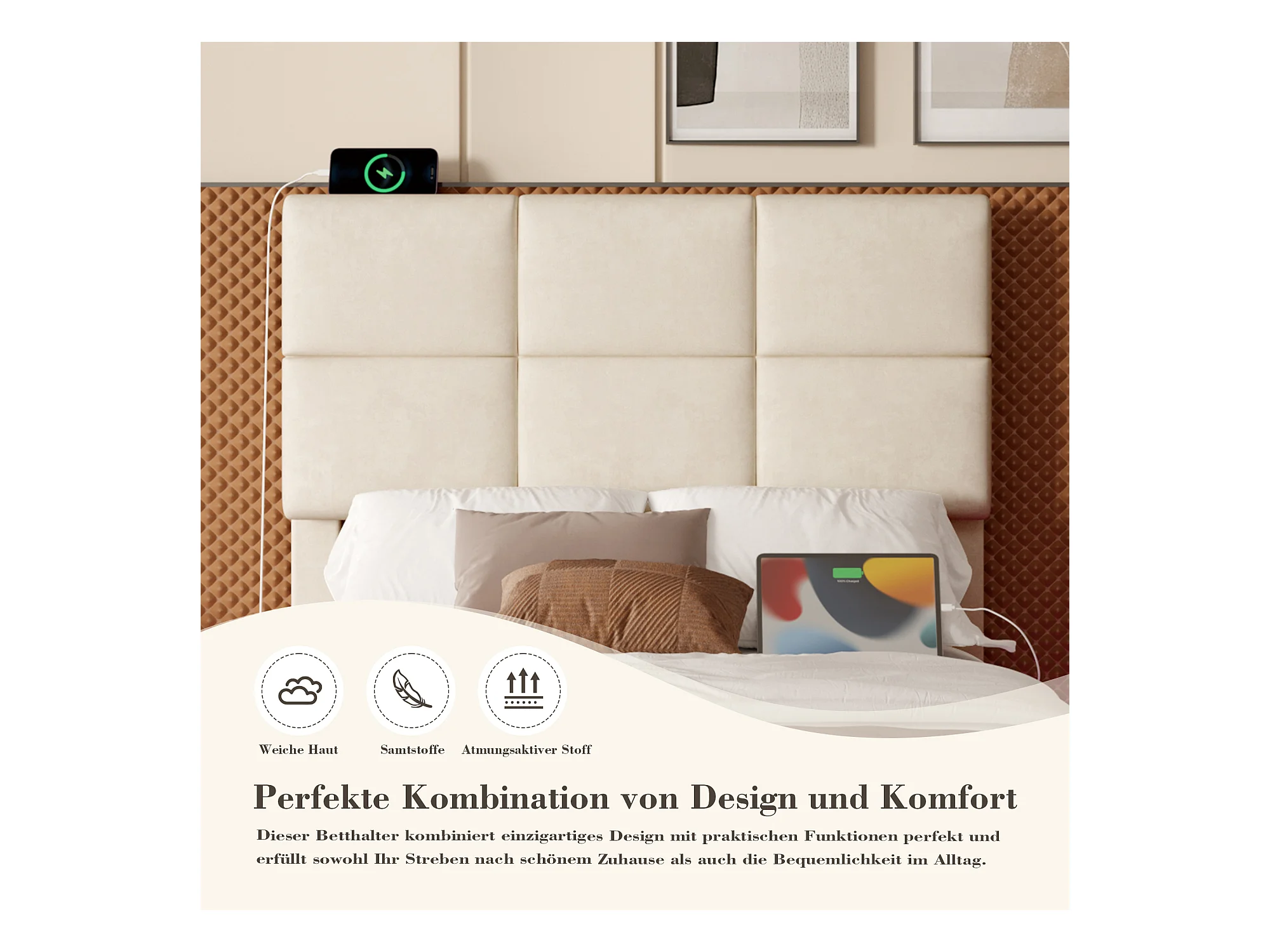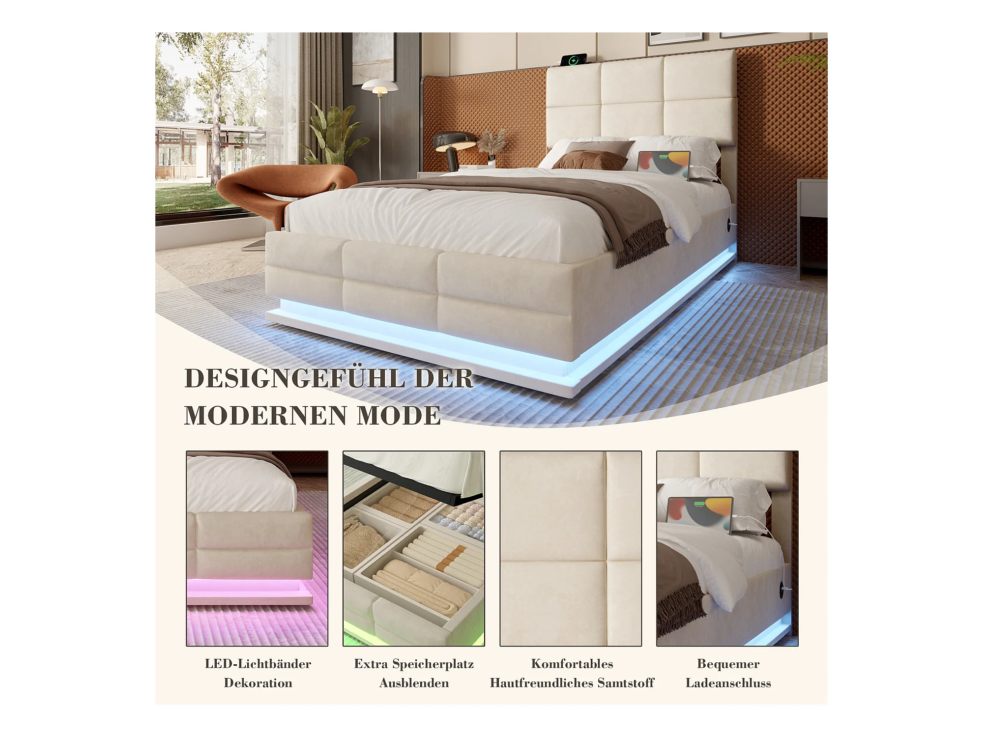 Lit Coffre 90×200 cm Velours Beige - Lit Rembourré – LED Télécommandé + Port USB – Rangement Hydraulique – Style Moderne avec Motif Matelassé