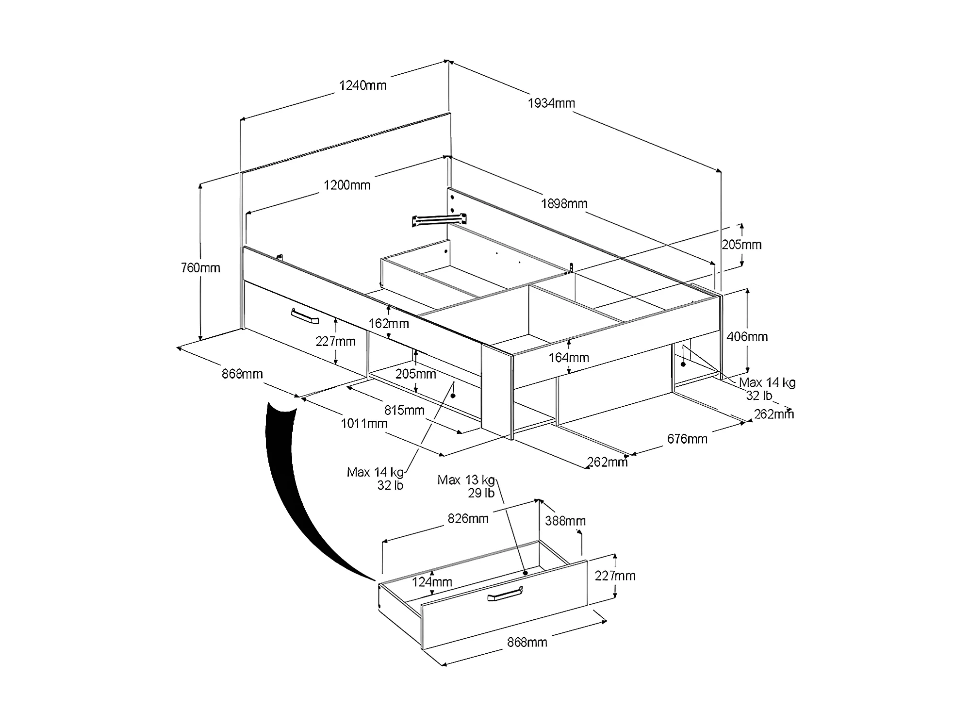 Lit simple en bois - avec tiroir N01 Noir / Chêne Naturel 120x200