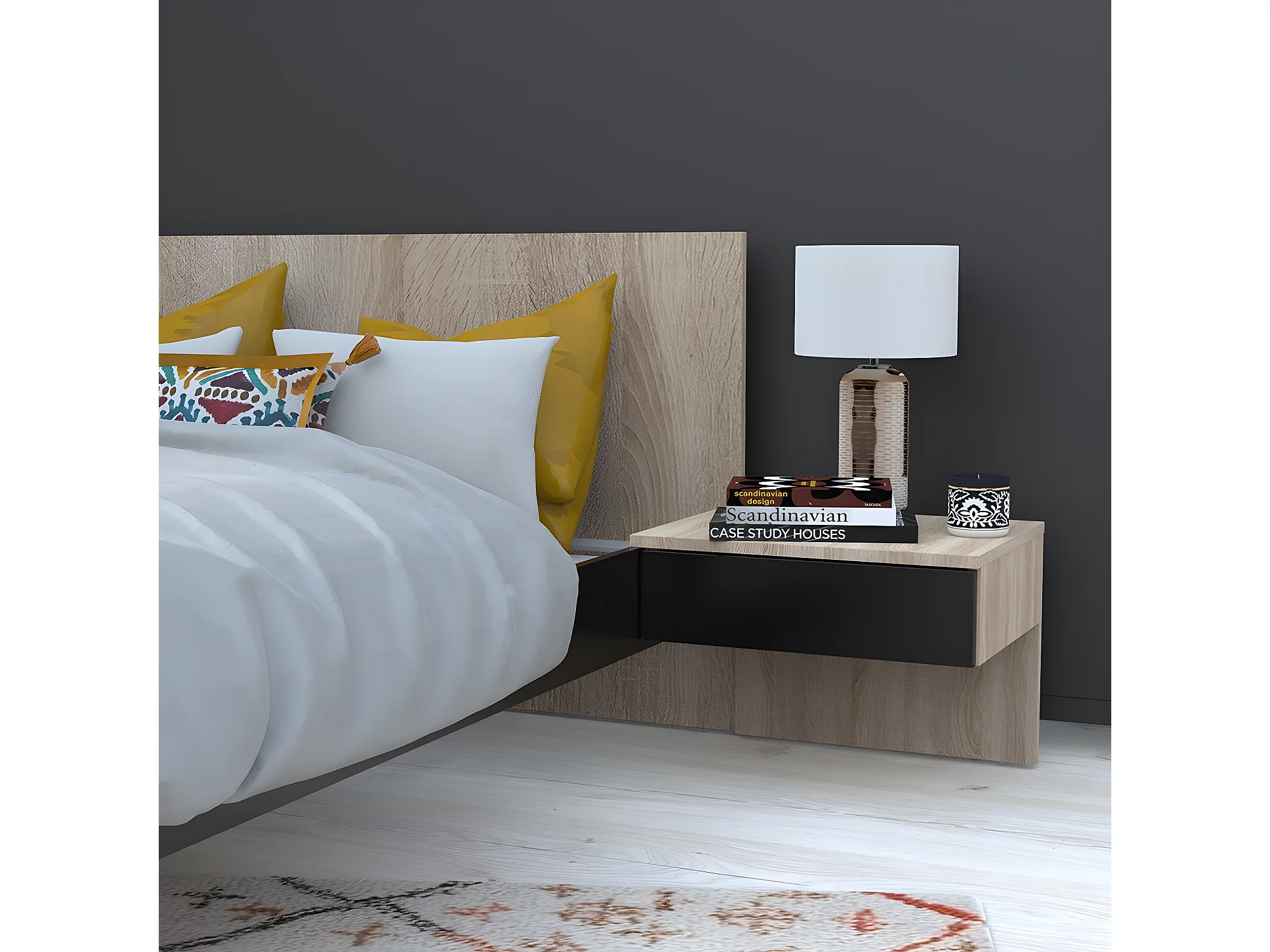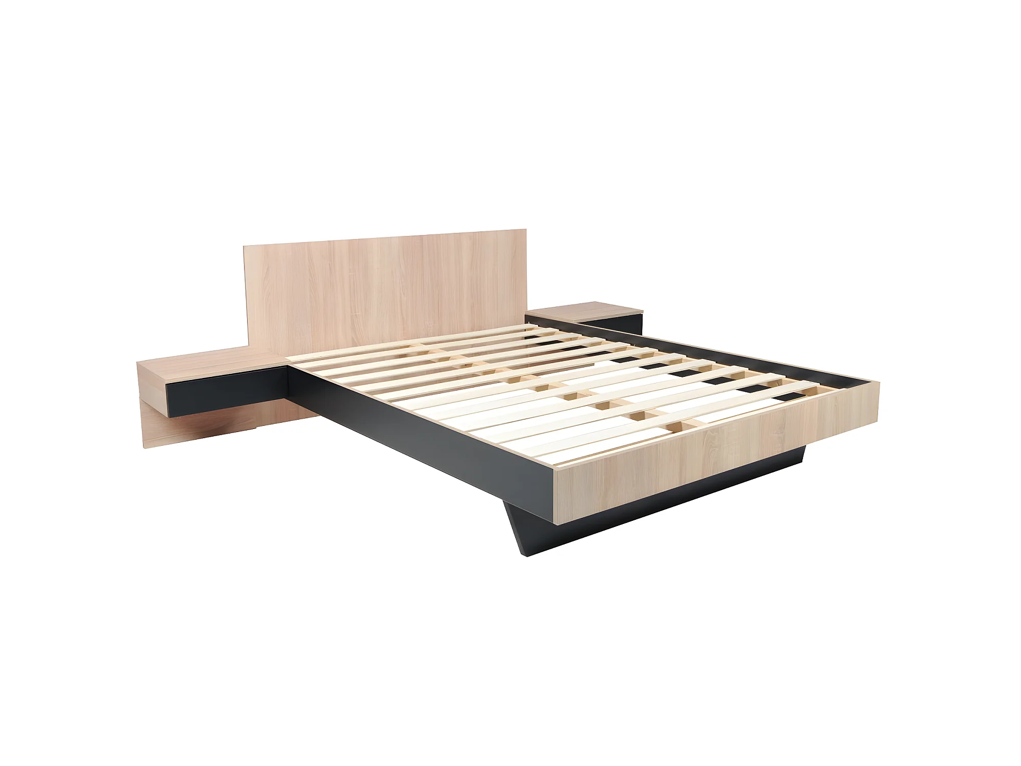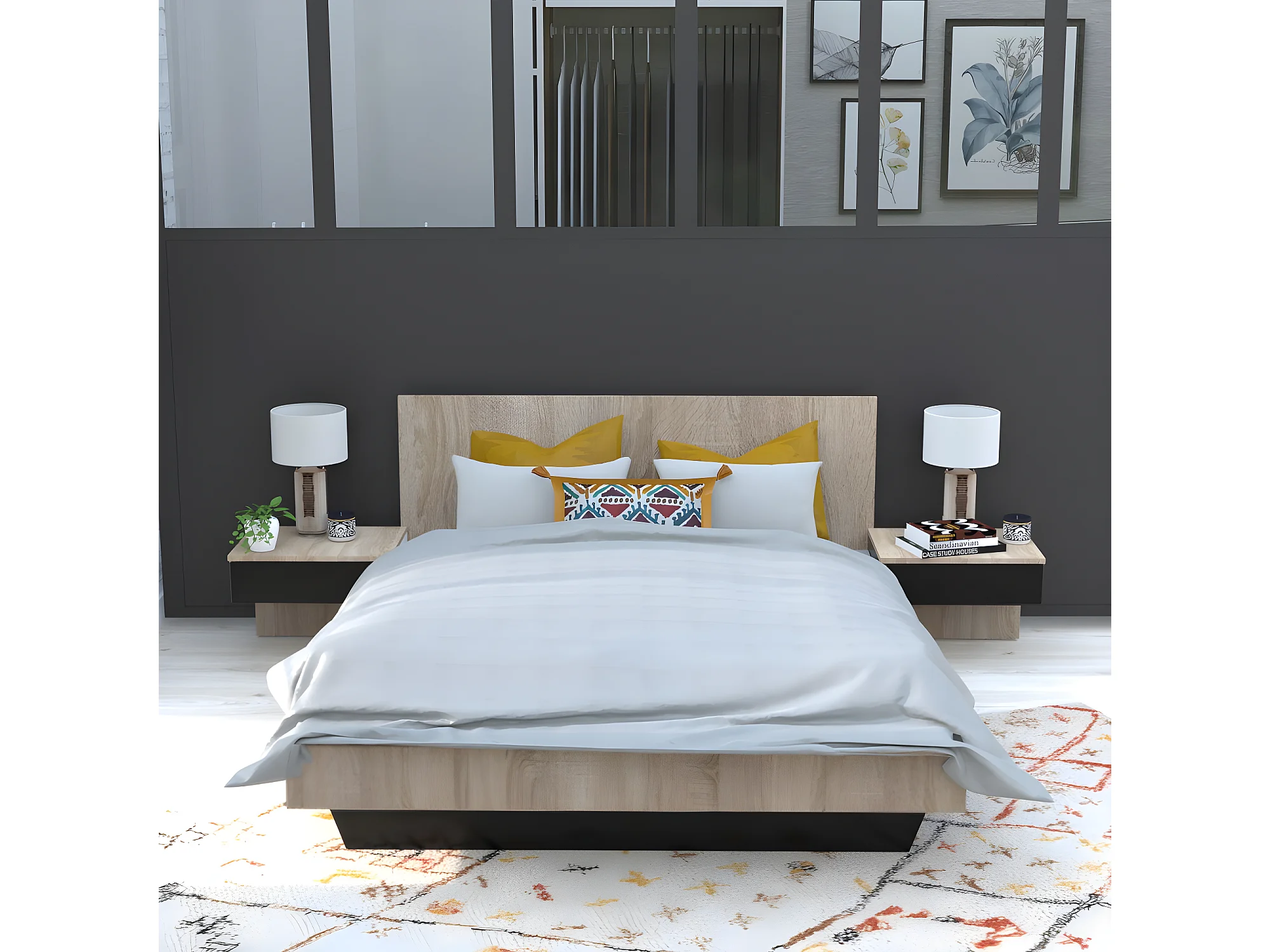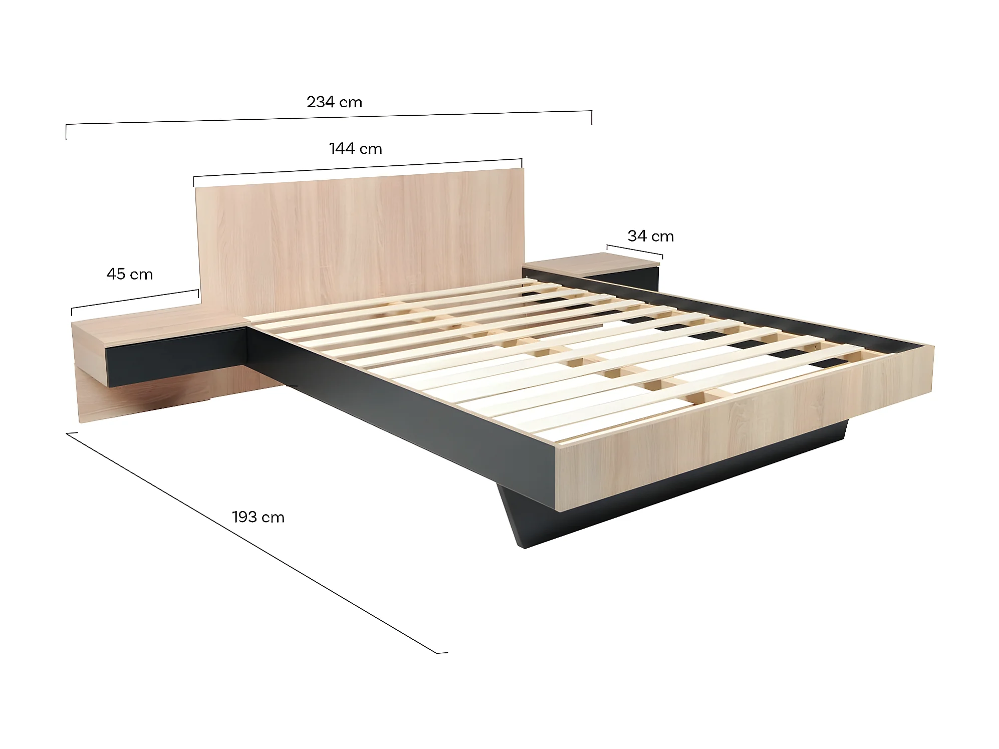 Lit COOL 140x190 cm + 2 chevets + sommier / Décor Chêne blanchi & noir
