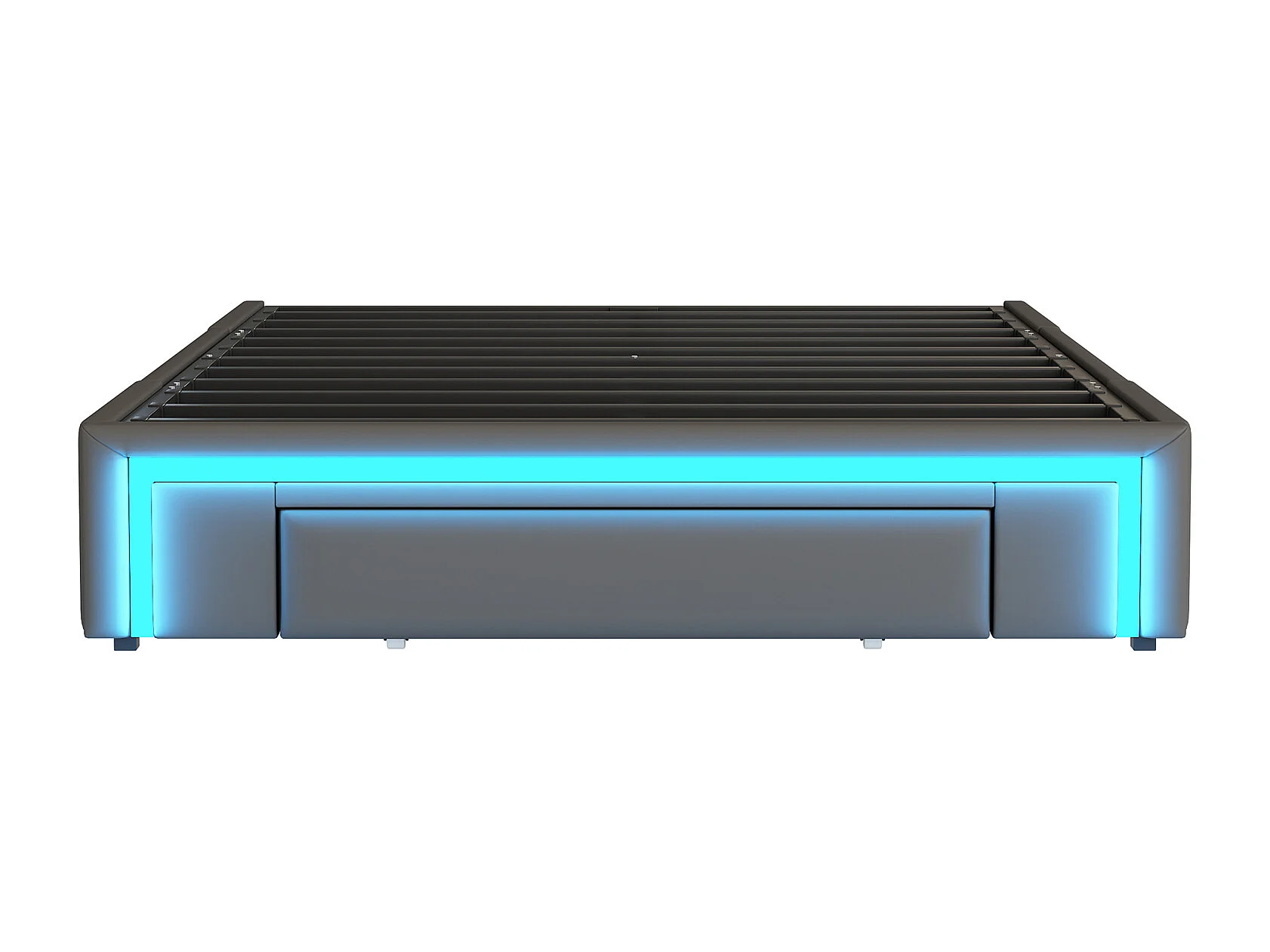 Lit 140×200 cm en simili cuir gris avec tiroirs et éclairage LED, cadre de lit moderne sans tête de lit