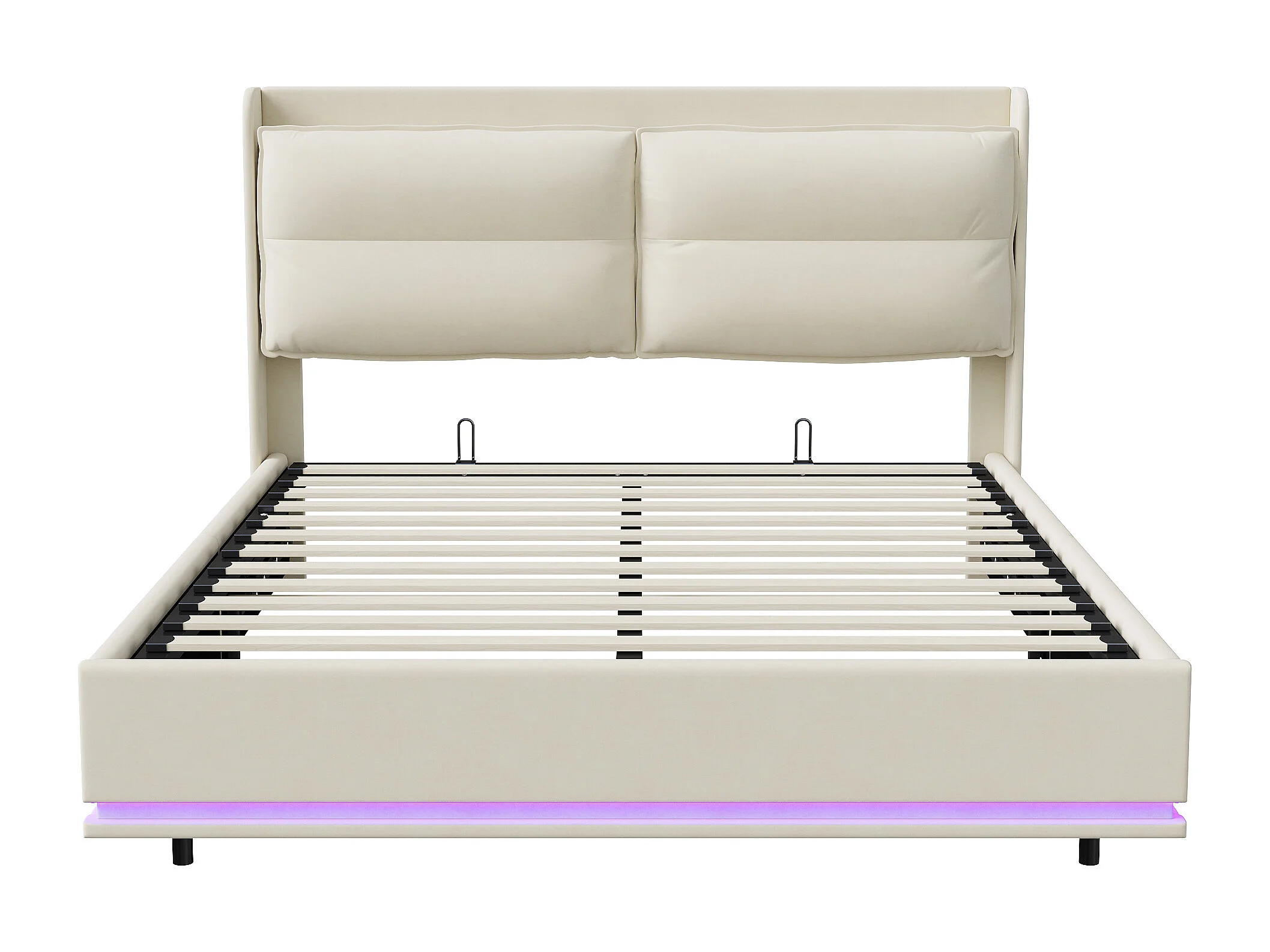 Lit 140x200 cm avec sommier à lattes - NEXU - LED - Chargement sans fil - lit adulte 140x200 cm tissu en Velours - cadre de lit coffre 140x200 cm - blanc cassé