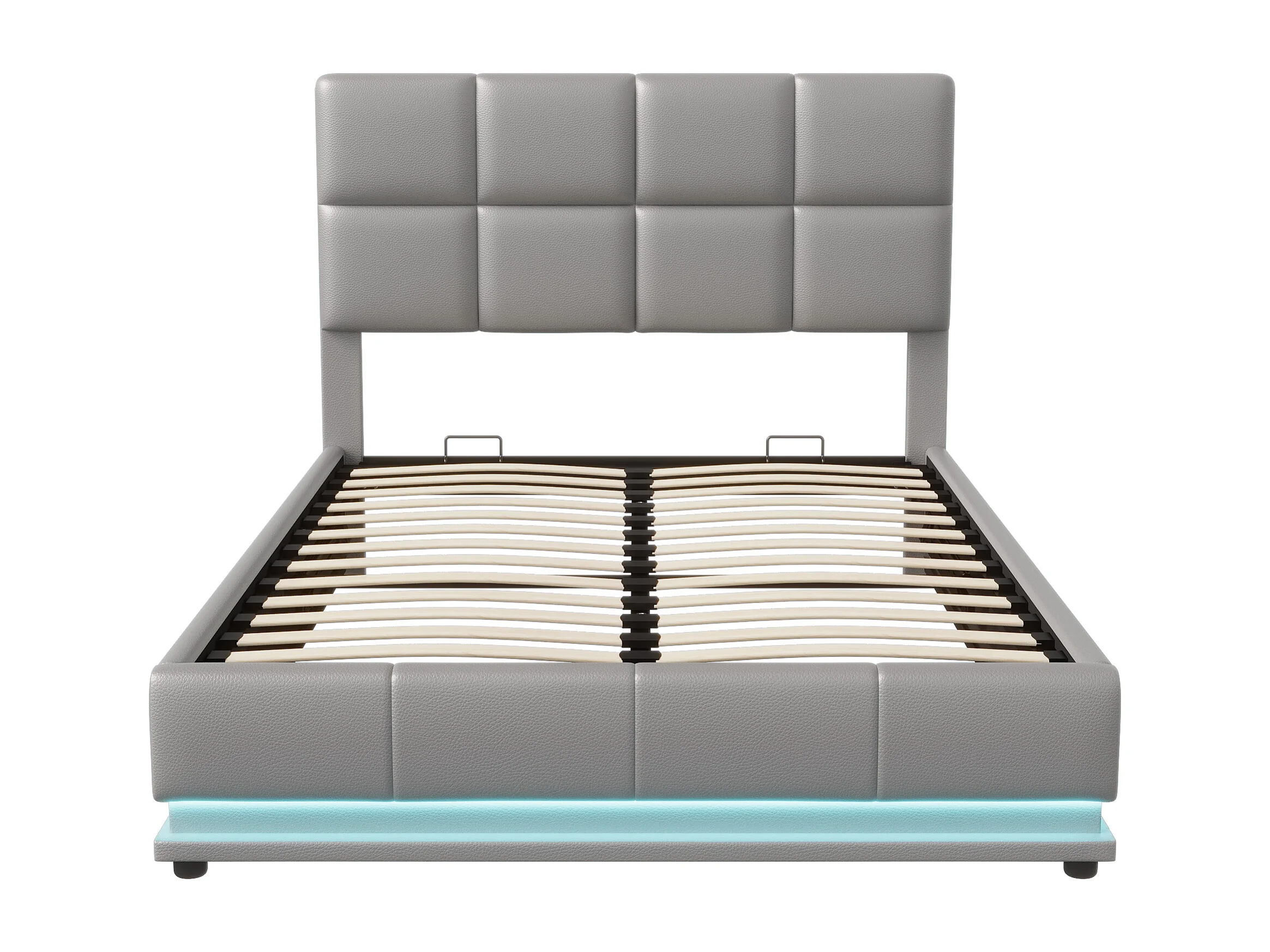 Lit adulte 140x200 cm - NEXU - LED - lit 140x200 cm avec sommier à lattes - tissu en pu - cadre de lit coffre 140x200 cm - gris