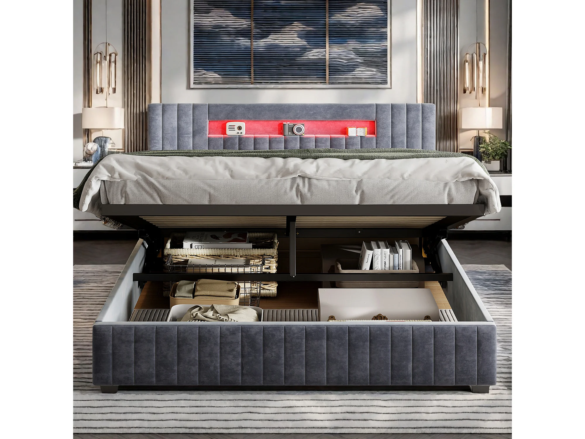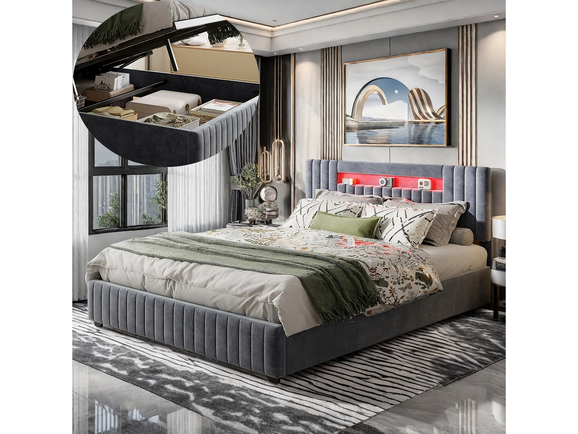 Lit 140x200 cm avec sommier à lattes - NEXU - lit 140x200 cm Capitonné avec LED RGB et coffre - lit adulte 140x200 cm tissu en velours - gris