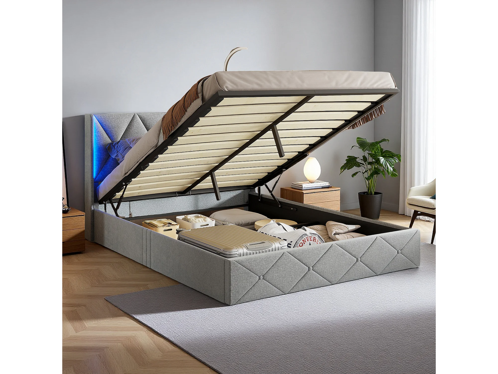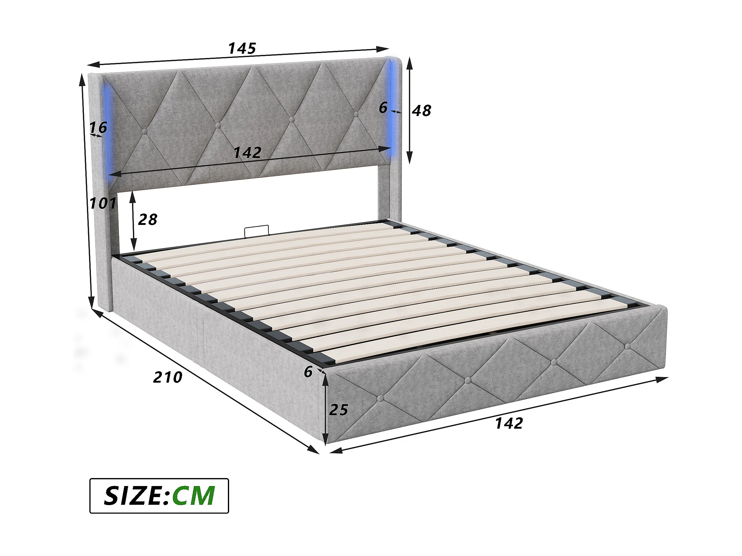 Lit 140x200 cm - NEXU - lit coffre 140x200 cm avec LED - cadre de lit double 140x200 cm avec sommier à lattes - tissu en velours - gris