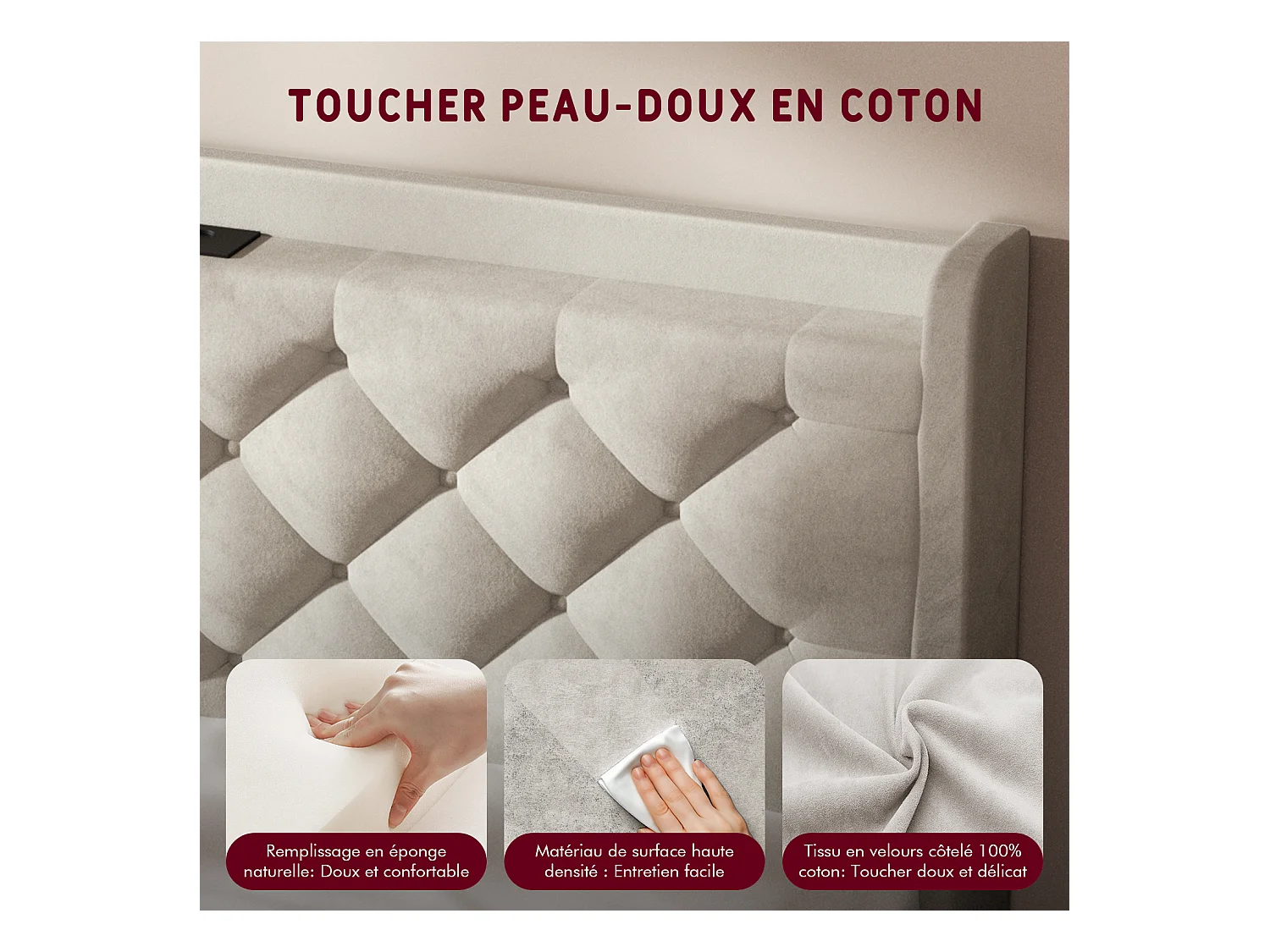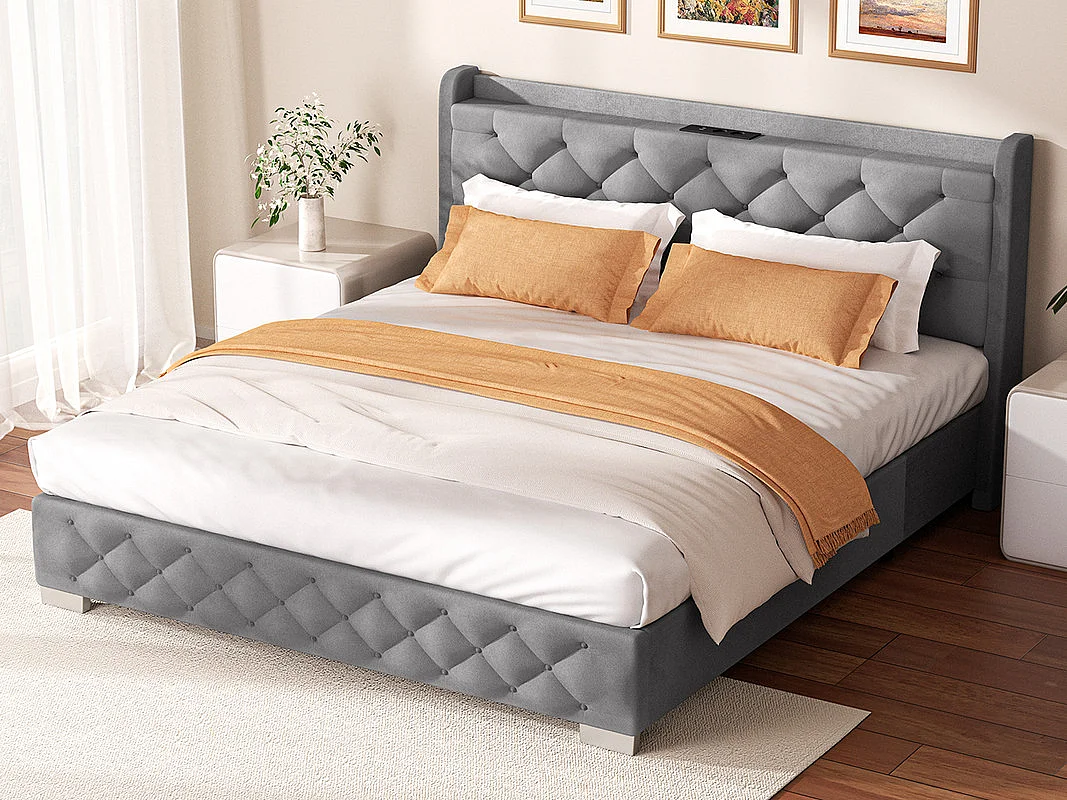 Lit 150 x 200 cm avec tête de lit capitonnée - Lit double avec tête de lit - Taupe
