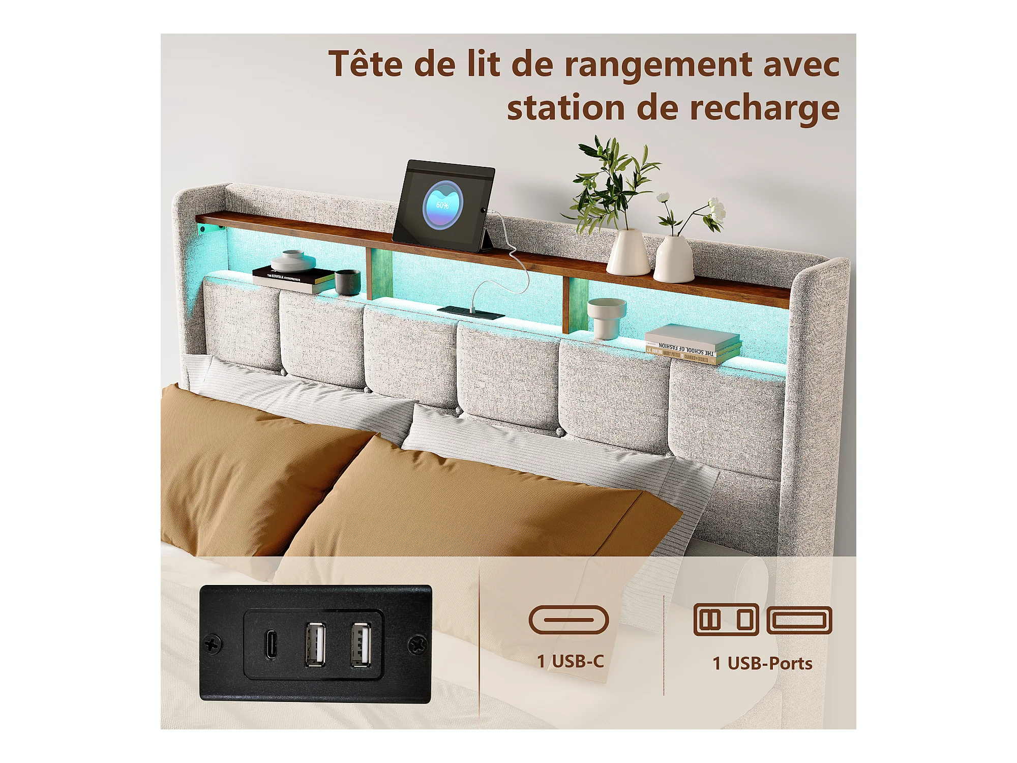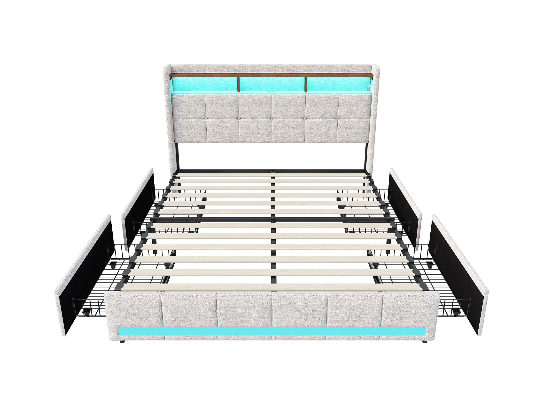 Lit 160x200 cm avec LED et USB, Coffre avec 4 Tiroirs et Grand Rangement, Double avec Lattes, Beige