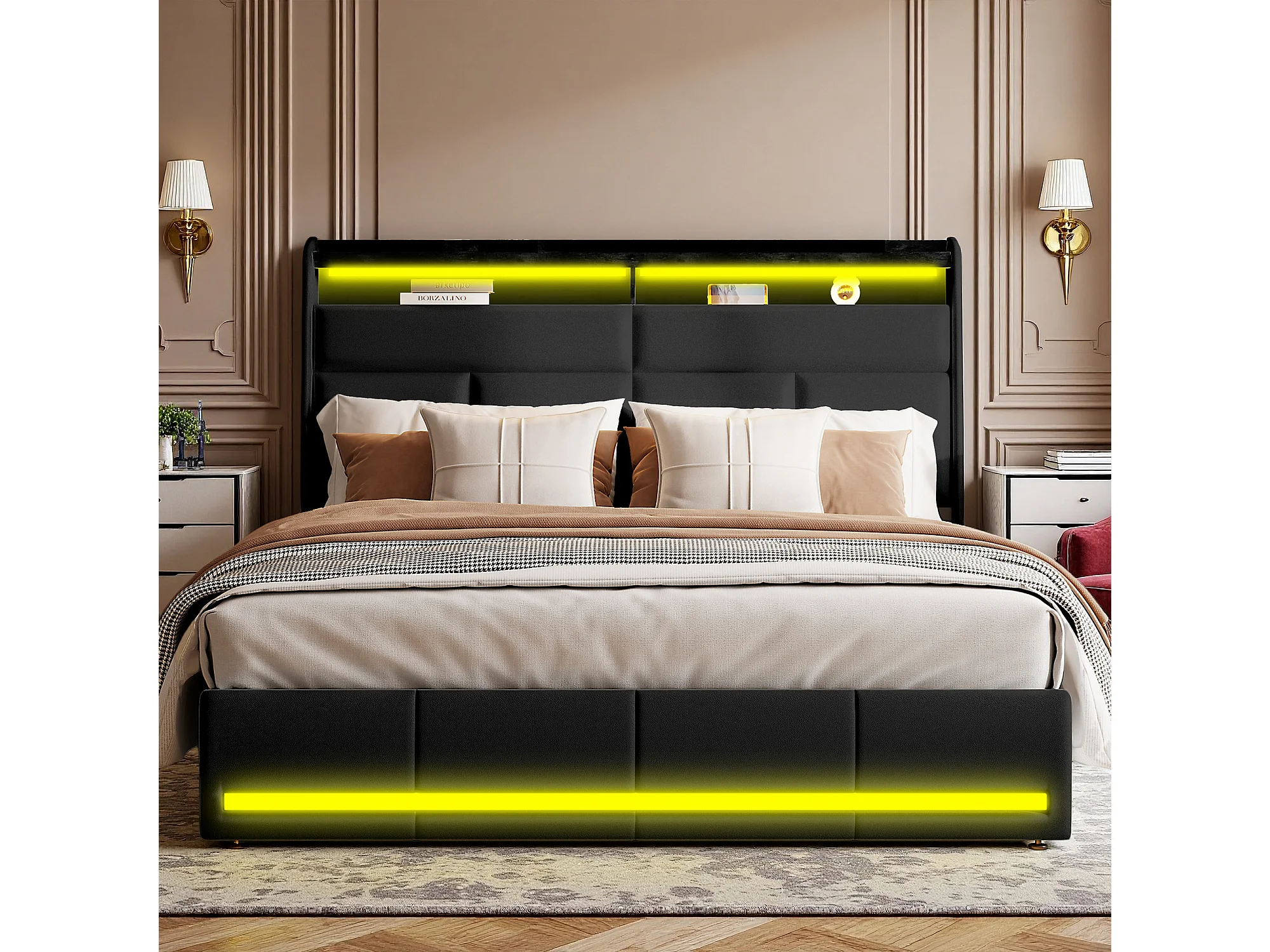 Lit 160x200 cm - NEXU - lit coffre 160x200 cm avec LED - lit adulte 160x200 cm avec sommier à lattes - tissu en PU - noir