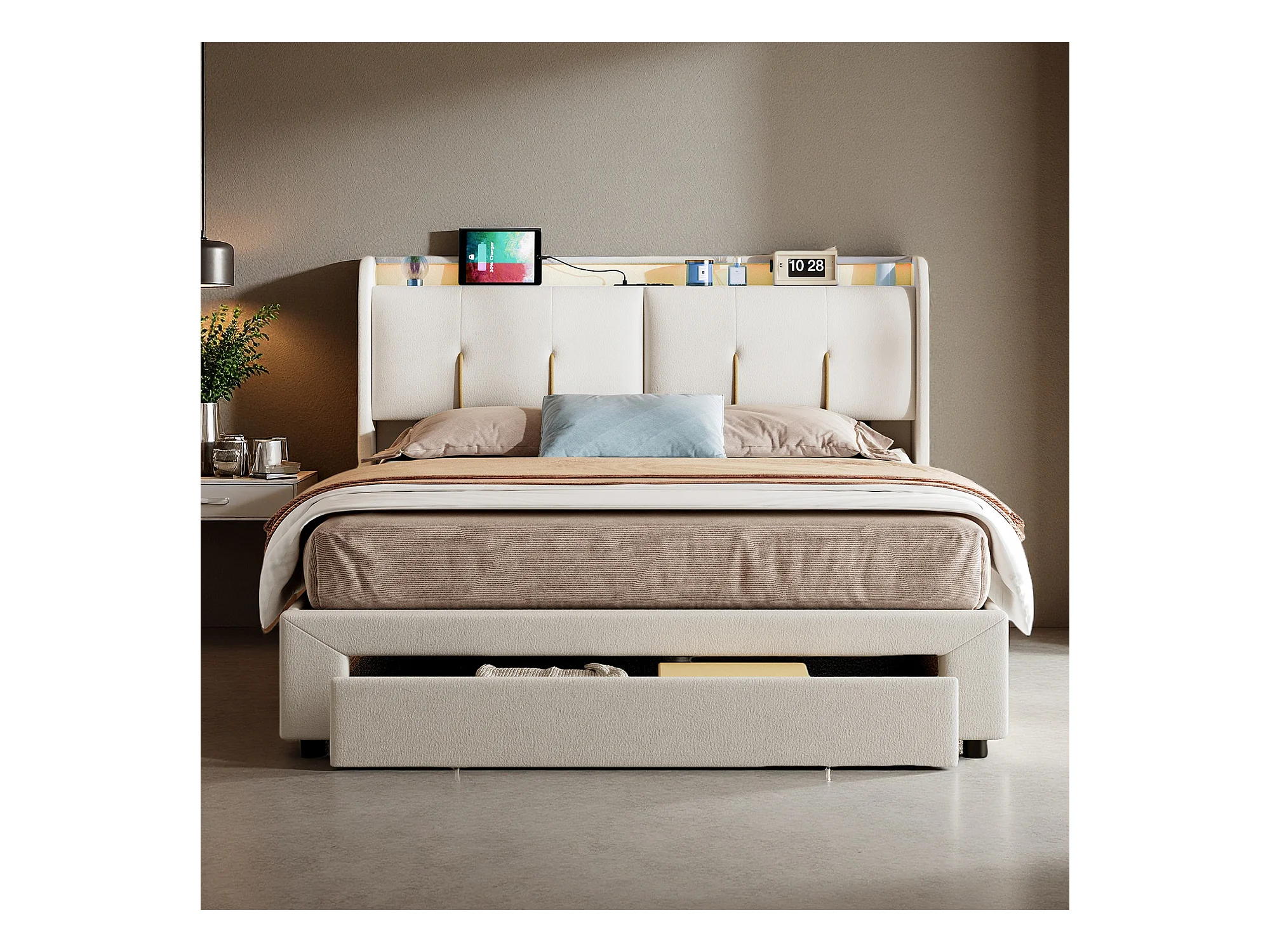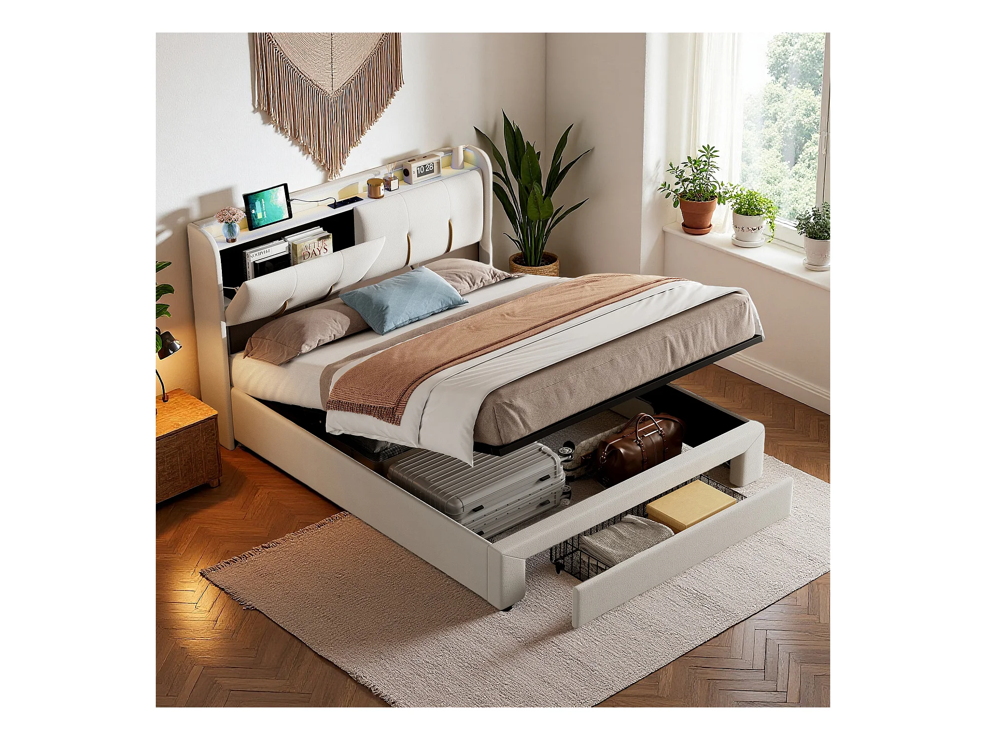 Lit 140x200 cm avec sommier à lattes - NEXU - lit coffre 140x200 cm avec tiroirs - cadre de lit adulte 140x200 cm avec USB et LED - tissu en velours - blanc cassé