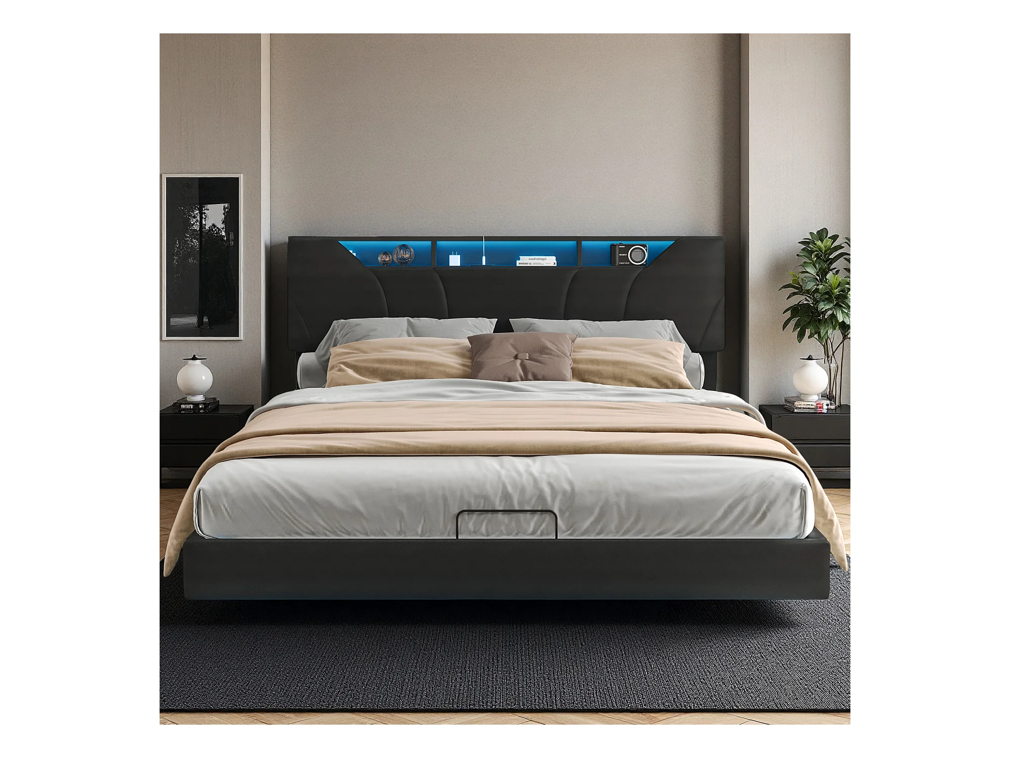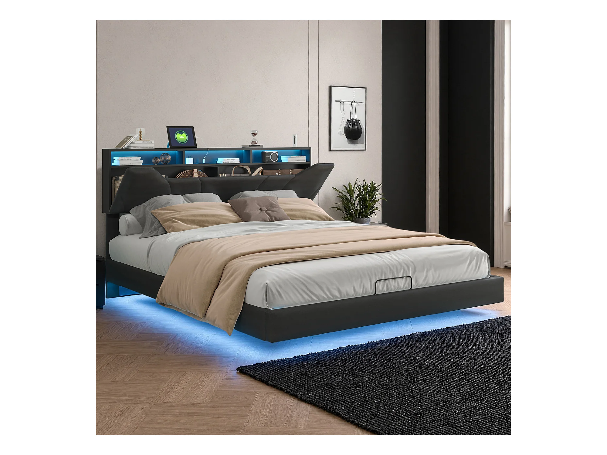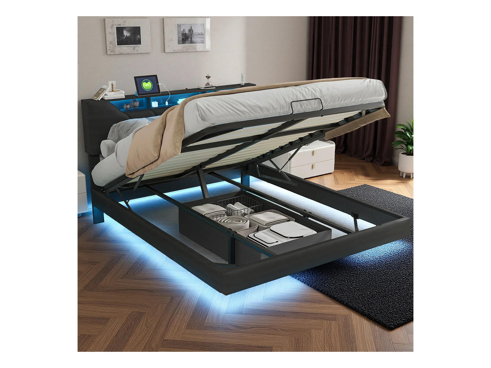 Lit adulte 160x200 cm - NEXU - lit flottant 160x200 cm avec LED et USB - cadre de lit double 160x200 cm avec coffre et sommier à lattes - tissu en PU - noir