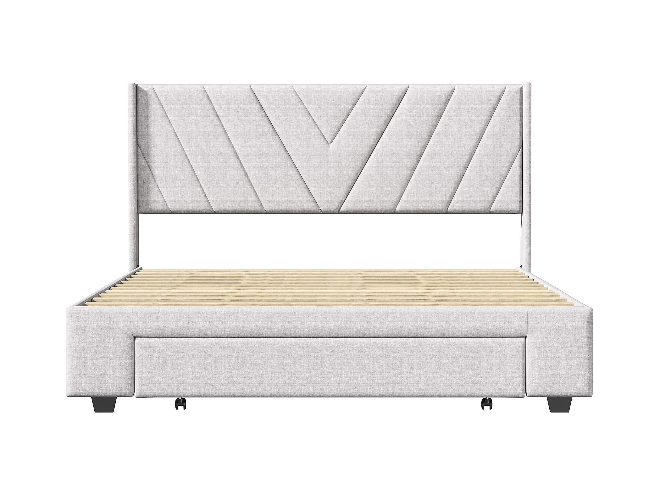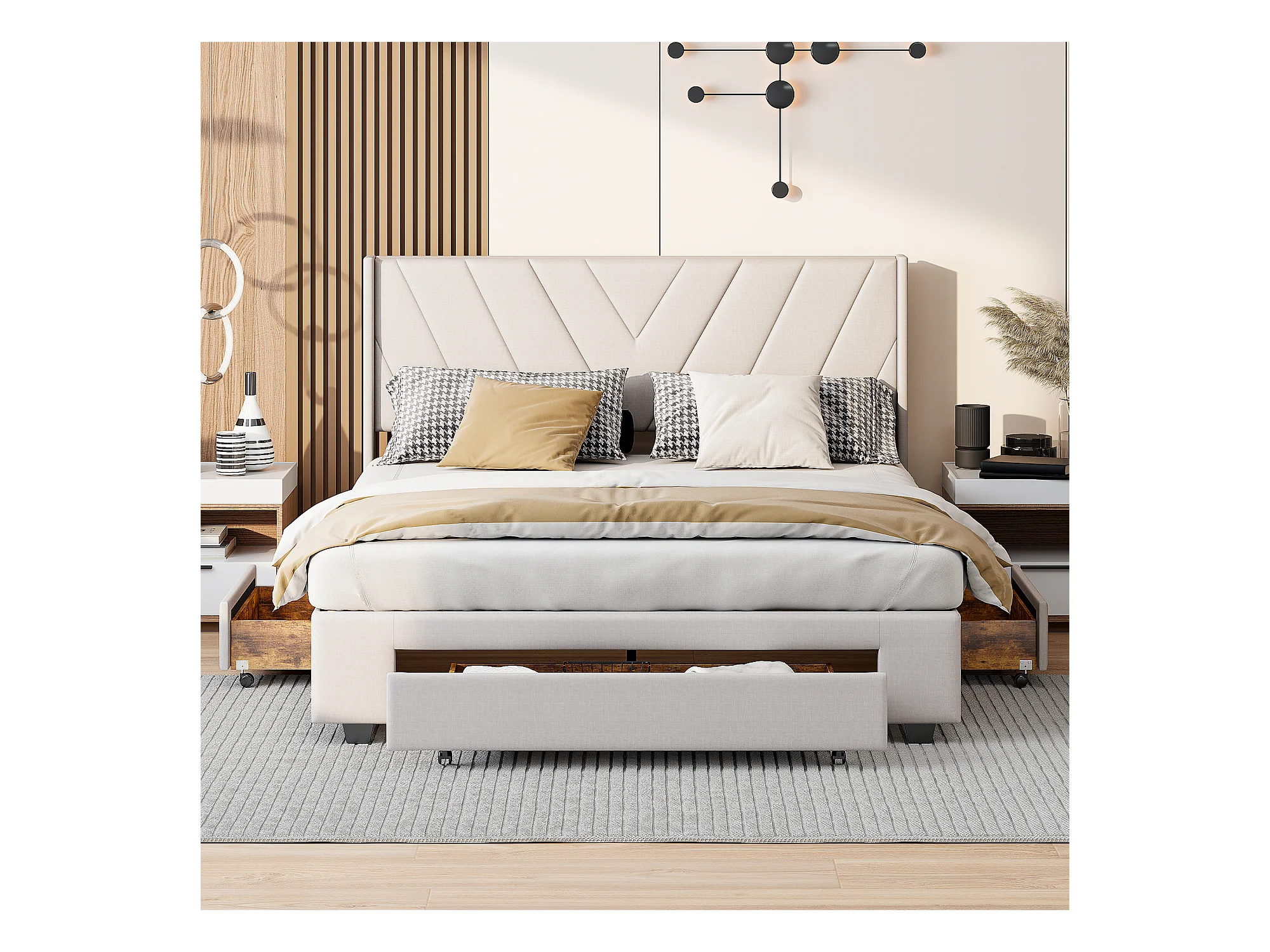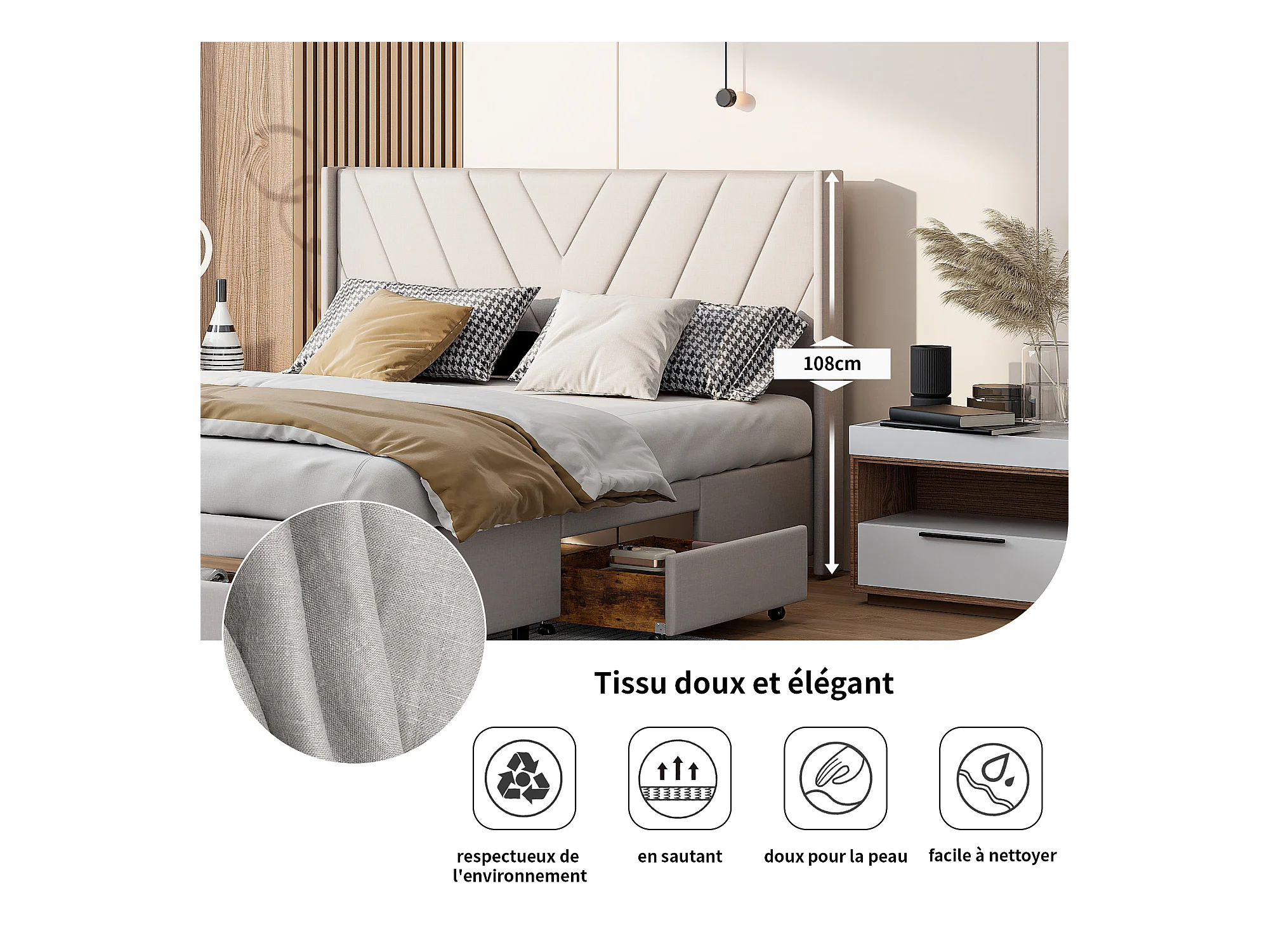 Lit 160x200cm Avec Tiroirs De Rangement, Lit Capitonné Avec Sommier à Lattes, Lin, Beige