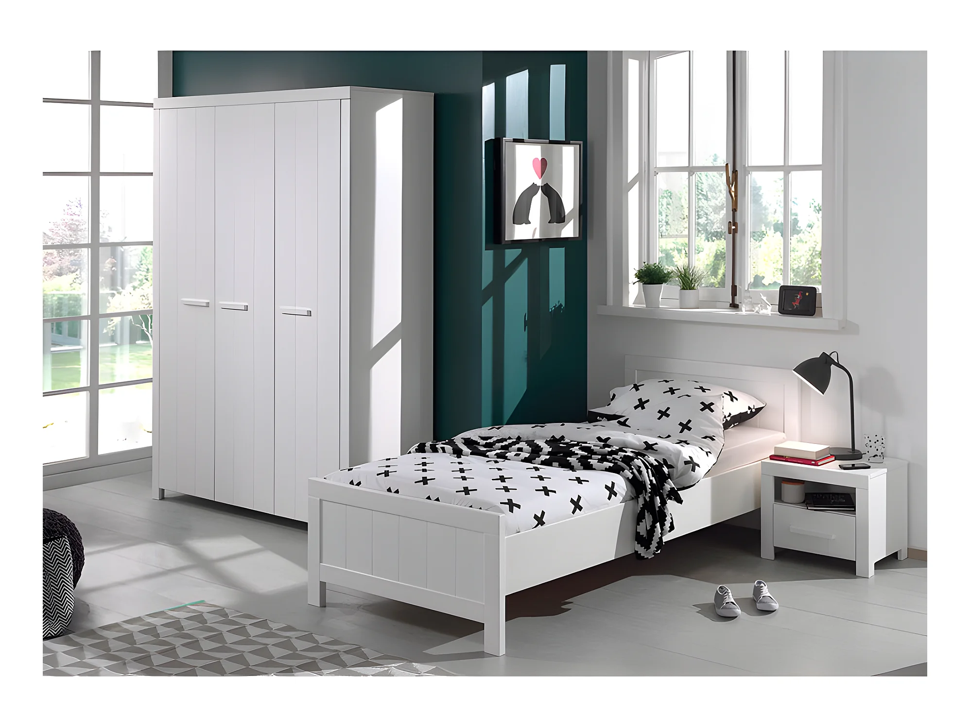 Pack - Lit Enfant, Sommier, Chevet & Armoire "Erik II" 90x200cm Blanc