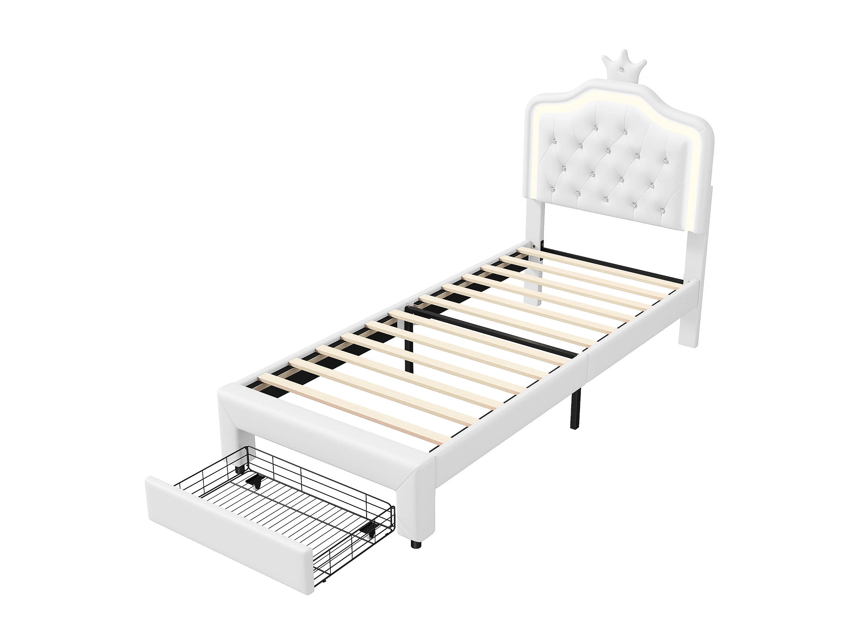 lit enfant 90x200 cm,lit simple capitonné 90 x 200 avec tiroir,LED réglable,lit princesse avec couronne,PU,blanc