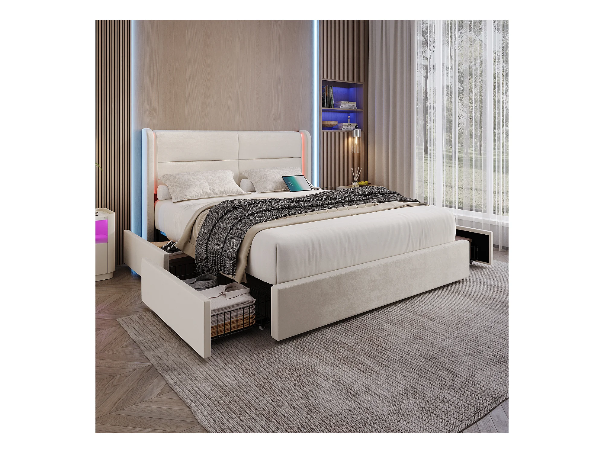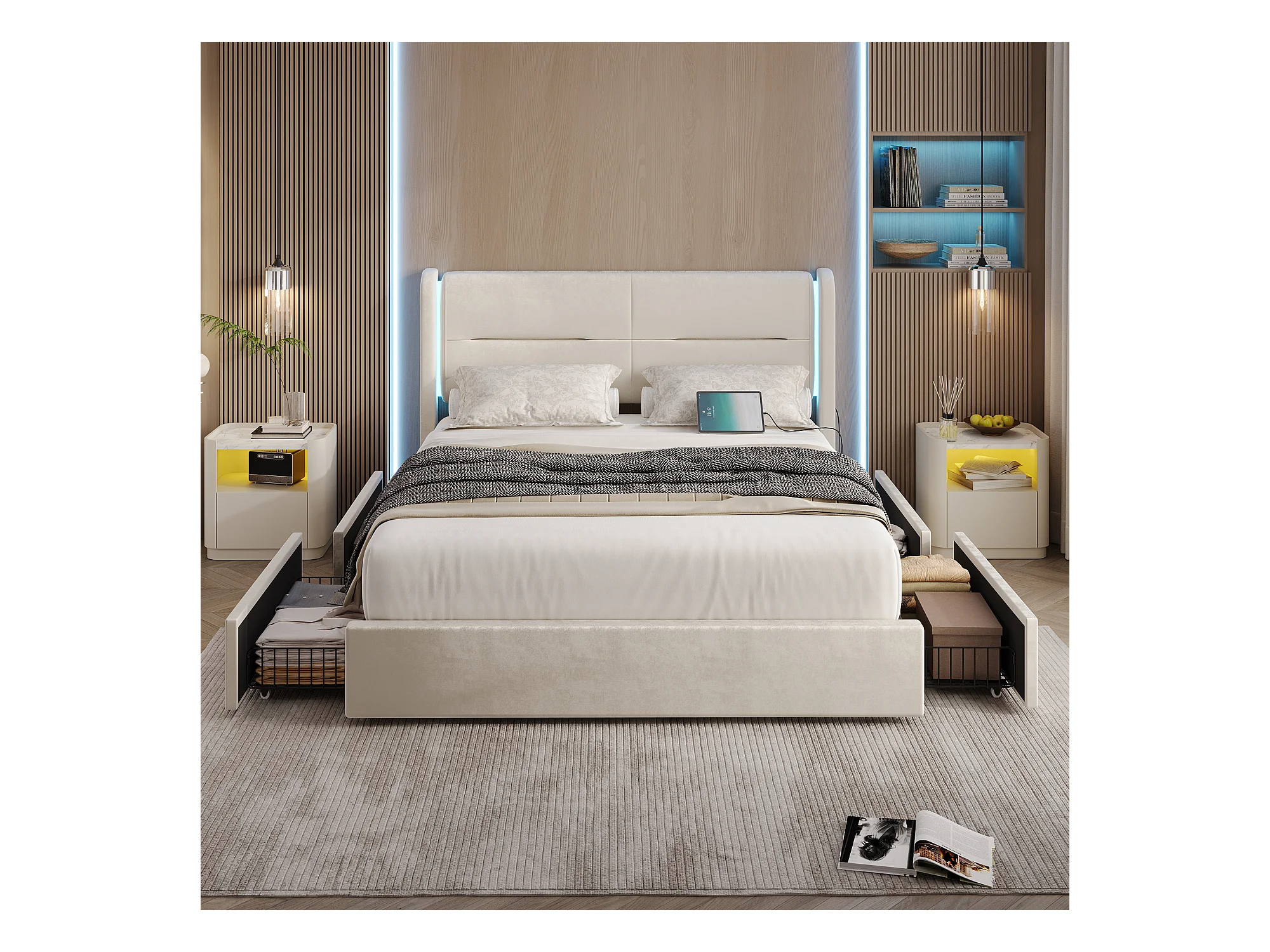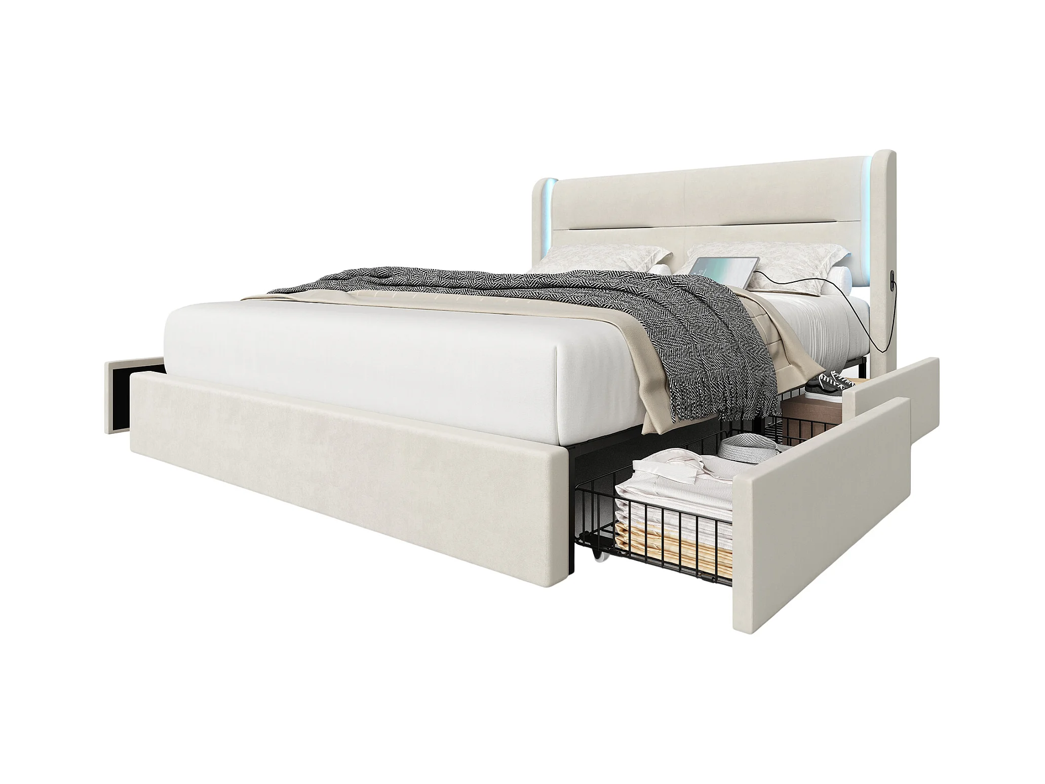 Lit adulte 140x200 cm - Lit double avec USB et éclairage LED - 4 tiroirs - velours beige - sans matelas
