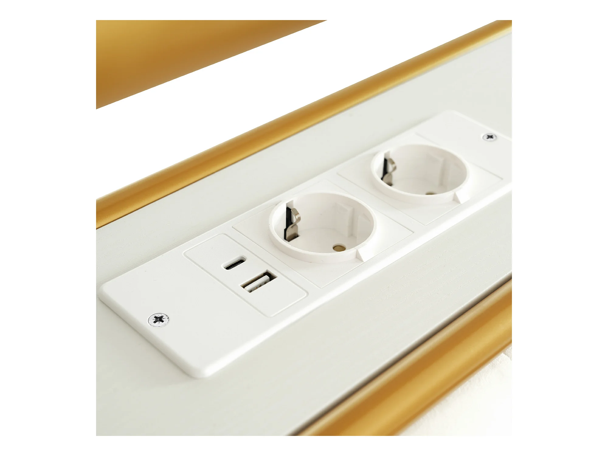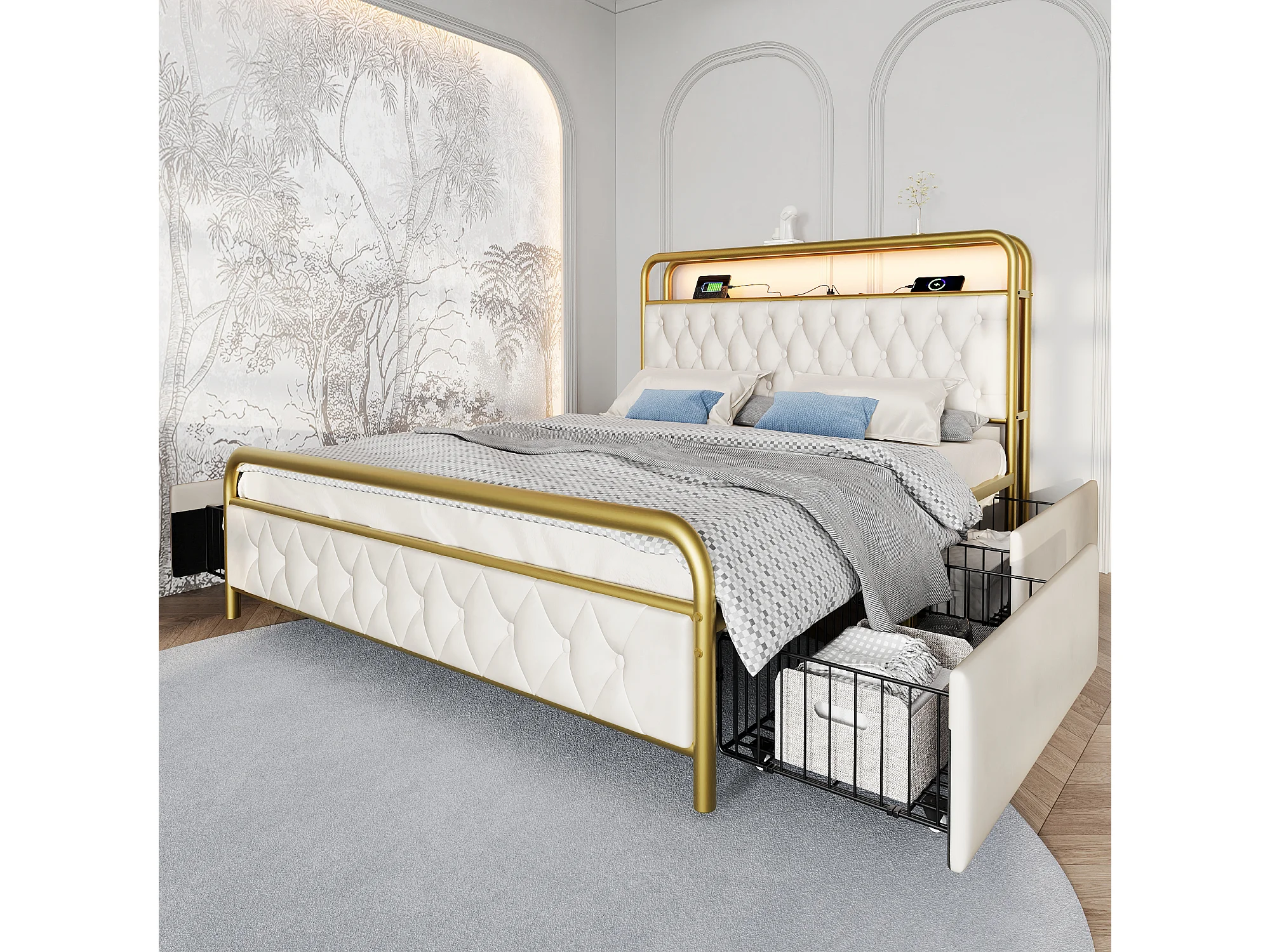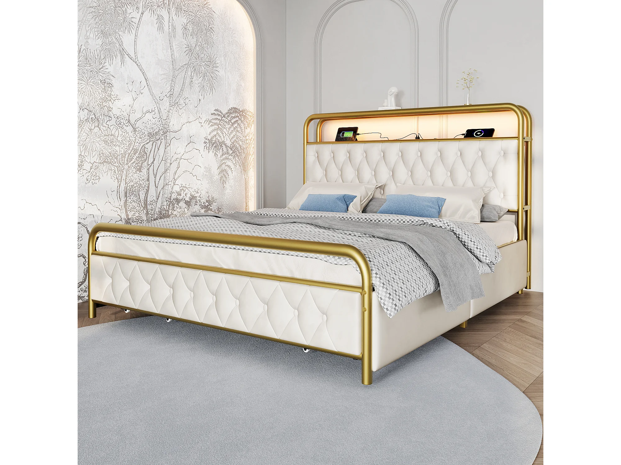 Lit adulte 160x200 cm - Lit double avec USB et éclairage LED - 4 tiroirs - velours blanc - sans matelas