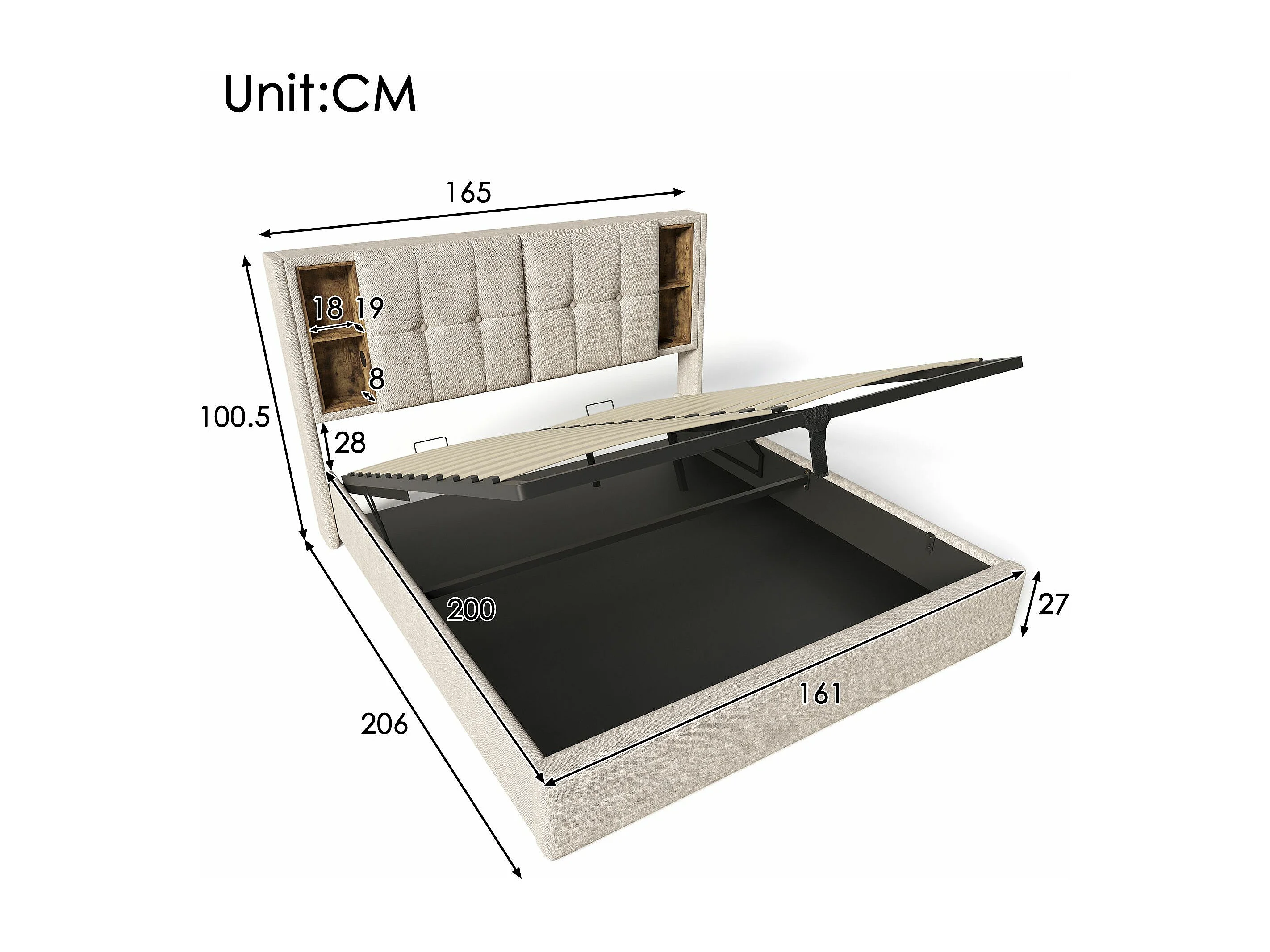 Lit adulte, 160x200 cm cadre de lit double capitonné avec espace de rangement et recharge sans fil USB C, cadre de lit en bois et lin naturel