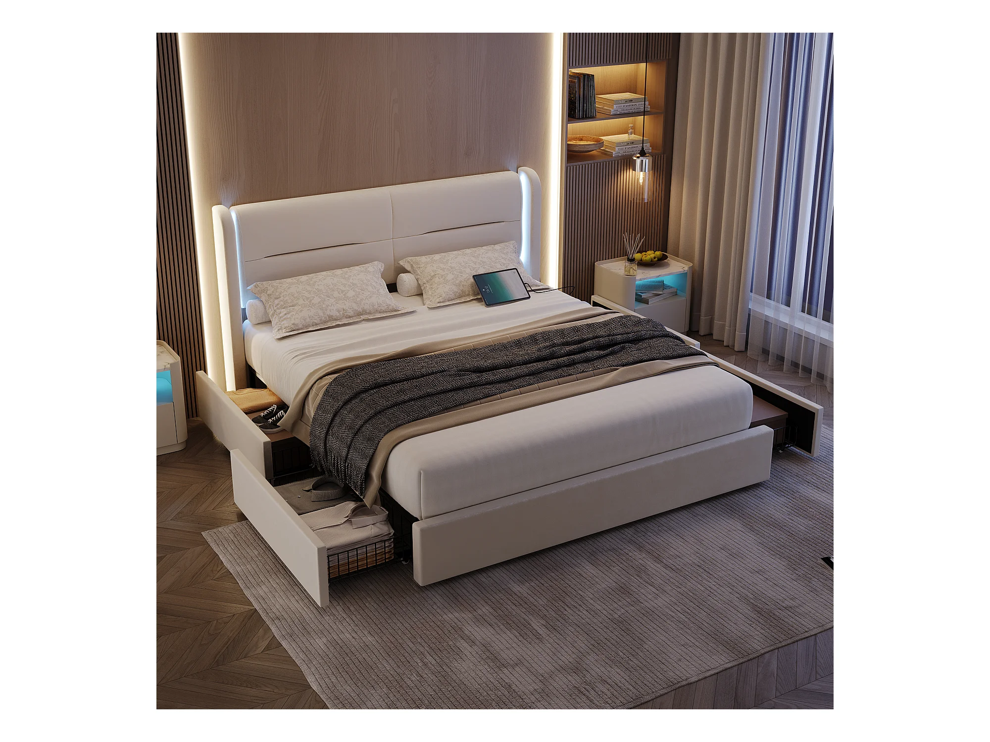 Lit adulte 160x200 cm - Lit double avec USB et éclairage LED - 4 tiroirs - velours beige - sans matelas