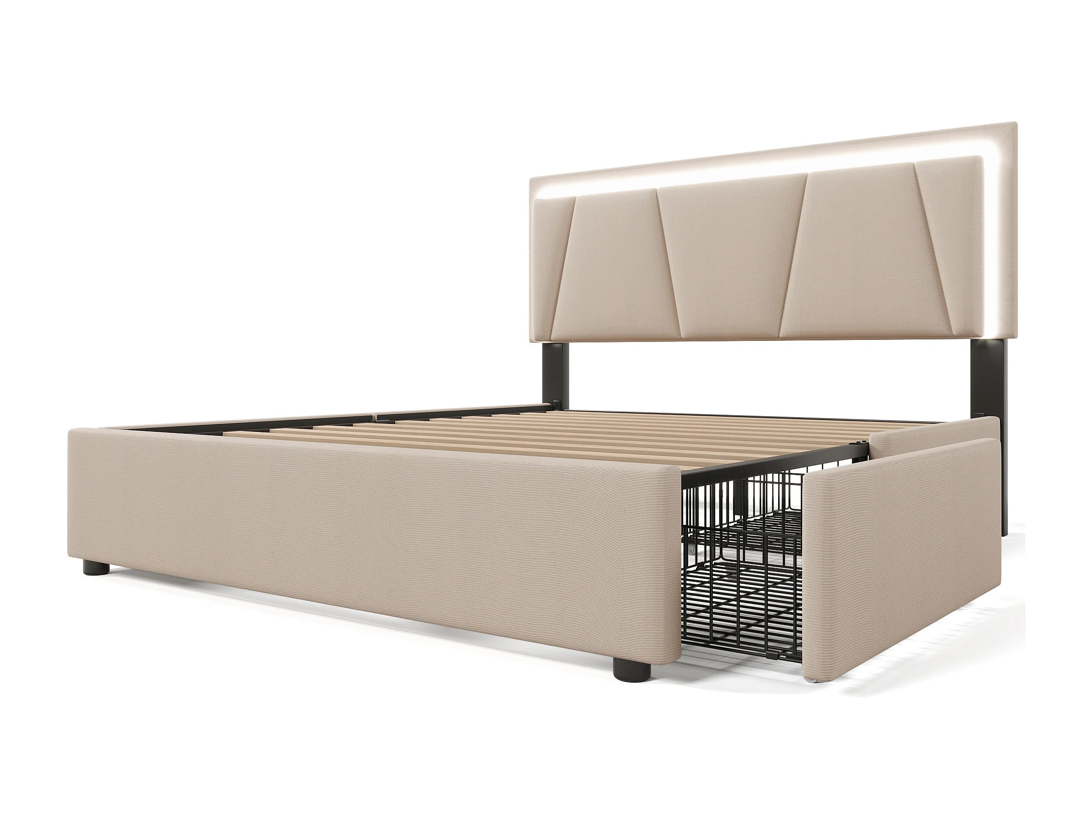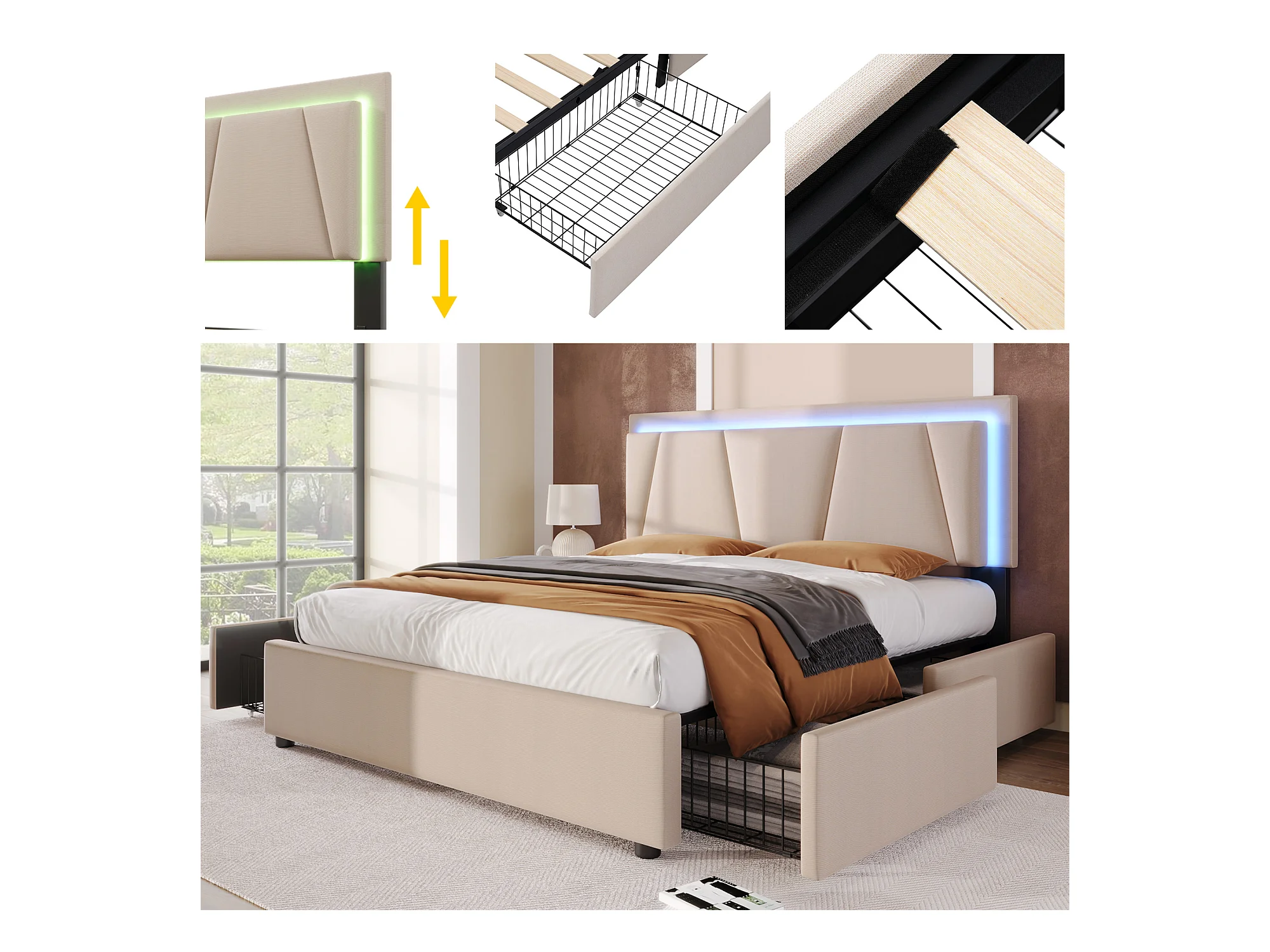 Lit adulte 160x200cm avec 4 tiroirs et LED, tête de lit réglable en hauteur, lin beige, sans matelas