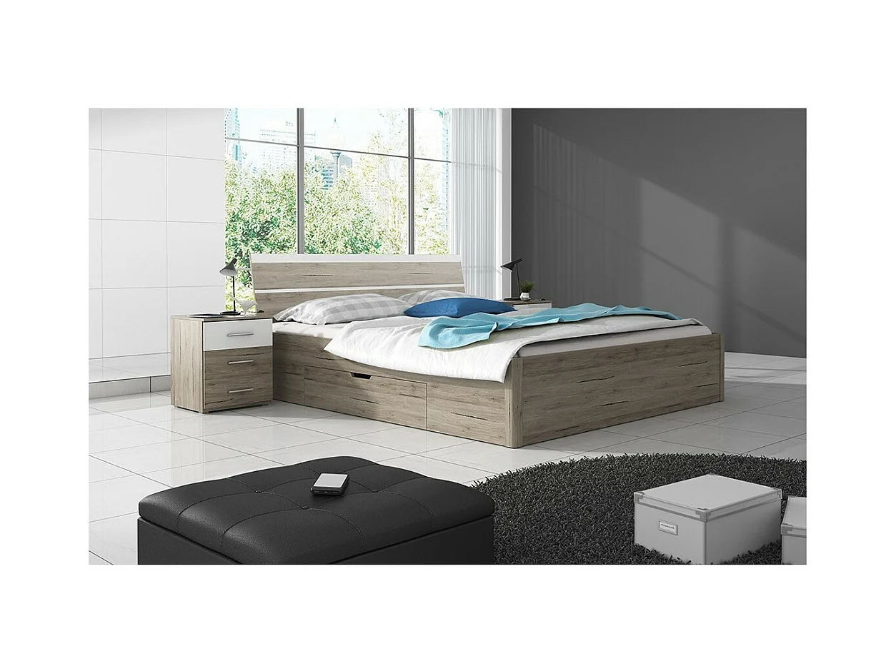 Lit adulte 180x200 avec tiroirs intégrés - Collection EOS. Coloris chêne clair et blanc