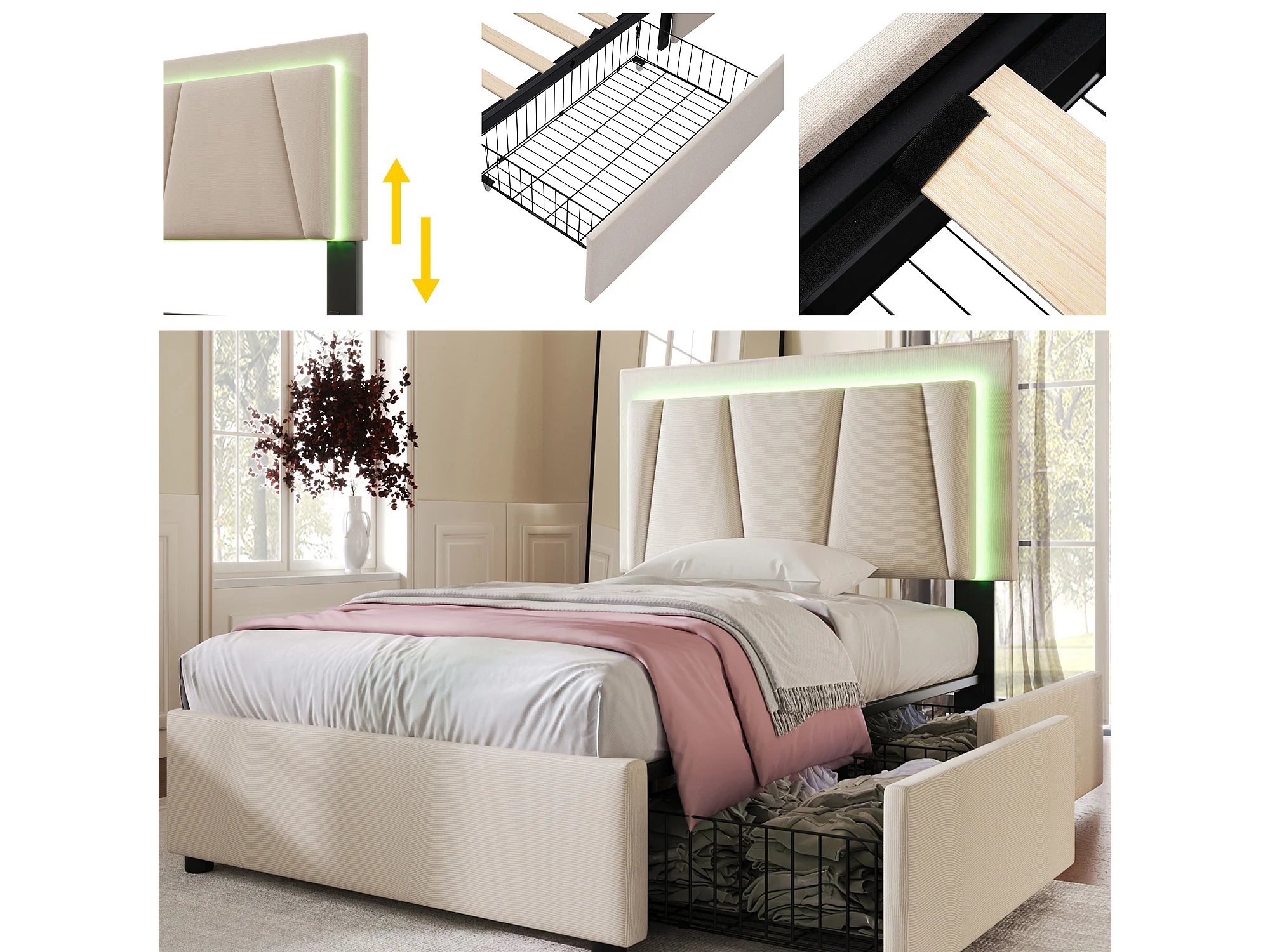 Lit adulte 90x200cm avec 2 tiroirs et LED, tête de lit réglable en hauteur, lin beige, sans matelas