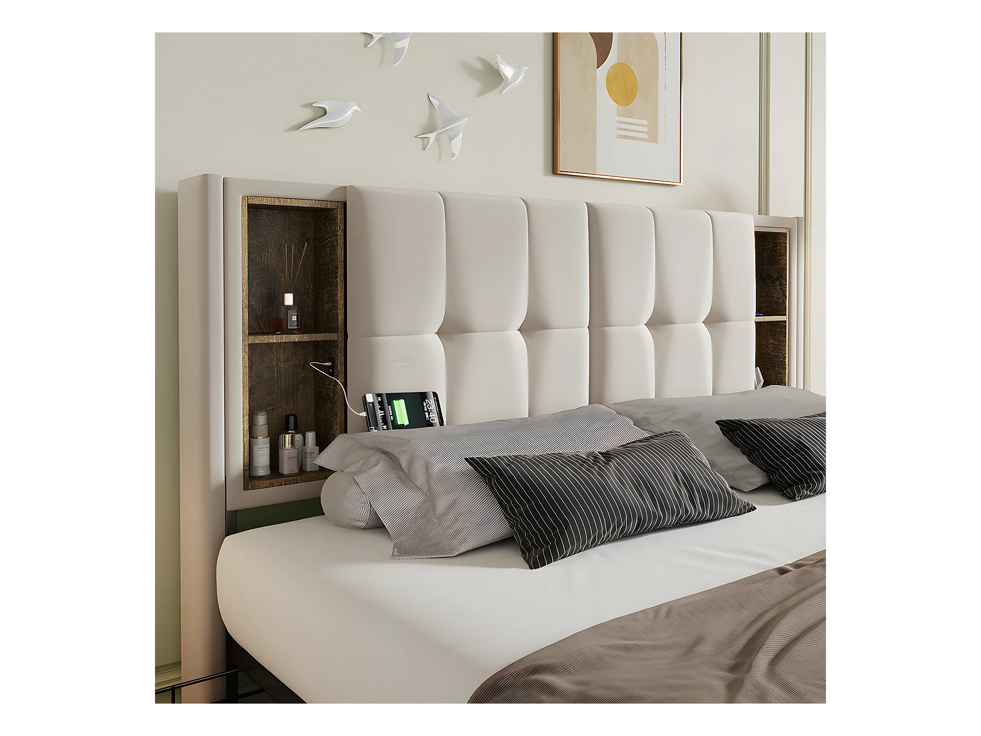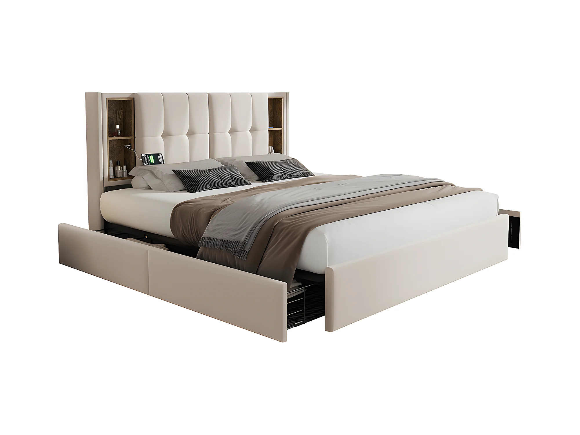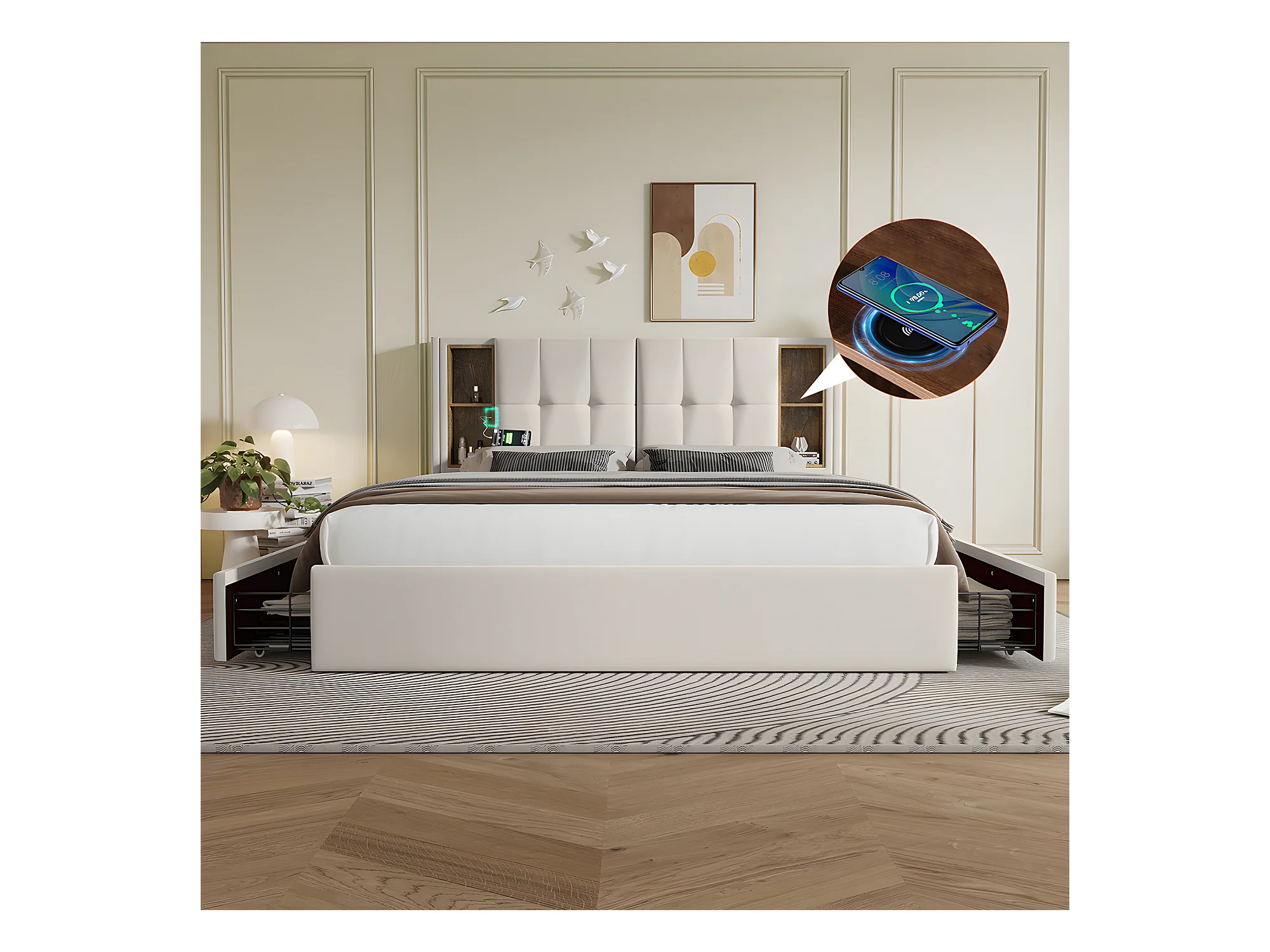 Lit adulte avec chargement sans fil USB C& 4 tiroirs , lit rembourré cadre de lit 160x200cm,sommier à lattes en bois beige velours (sans matelas)