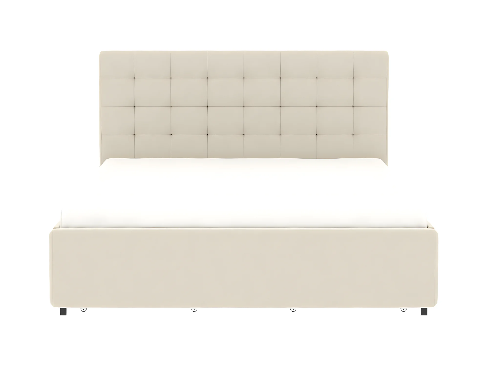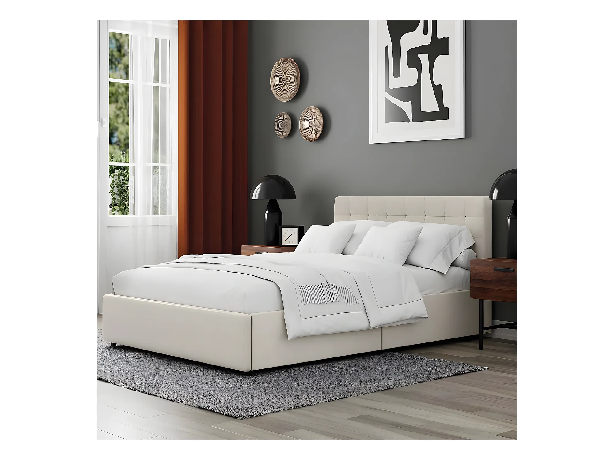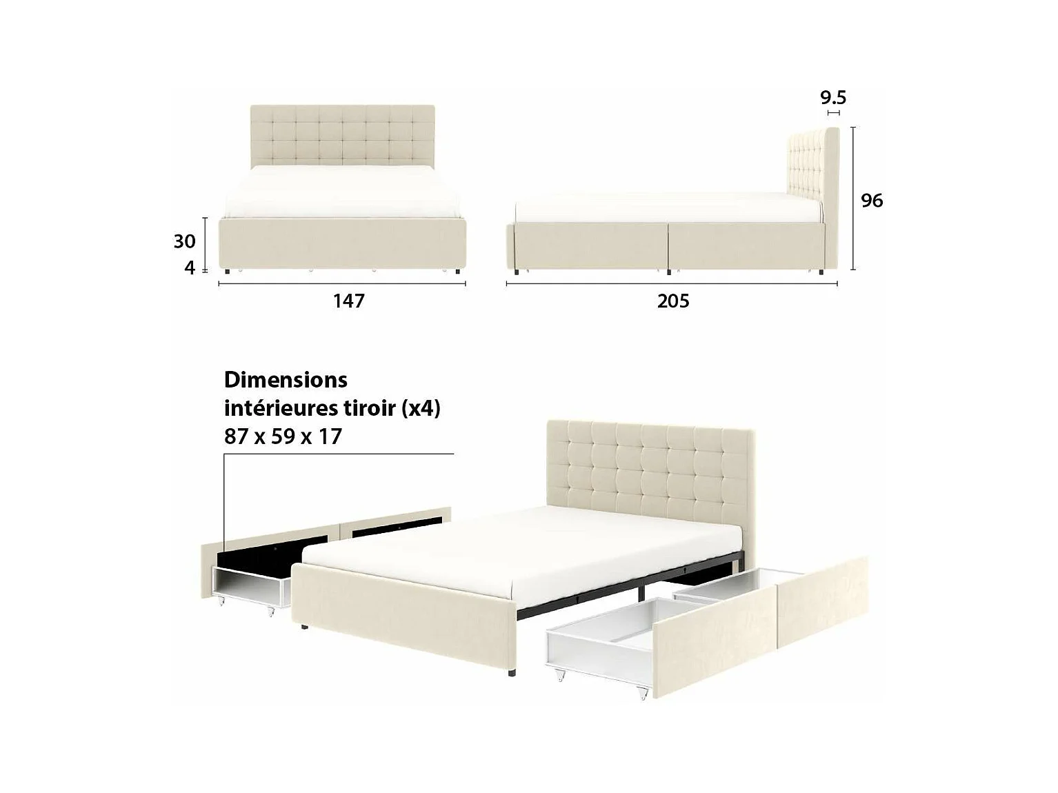 Lit tiroirs tête de lit capitonnée – couchage 140x190 cm – velours beige - sommier inclus - ELLIE