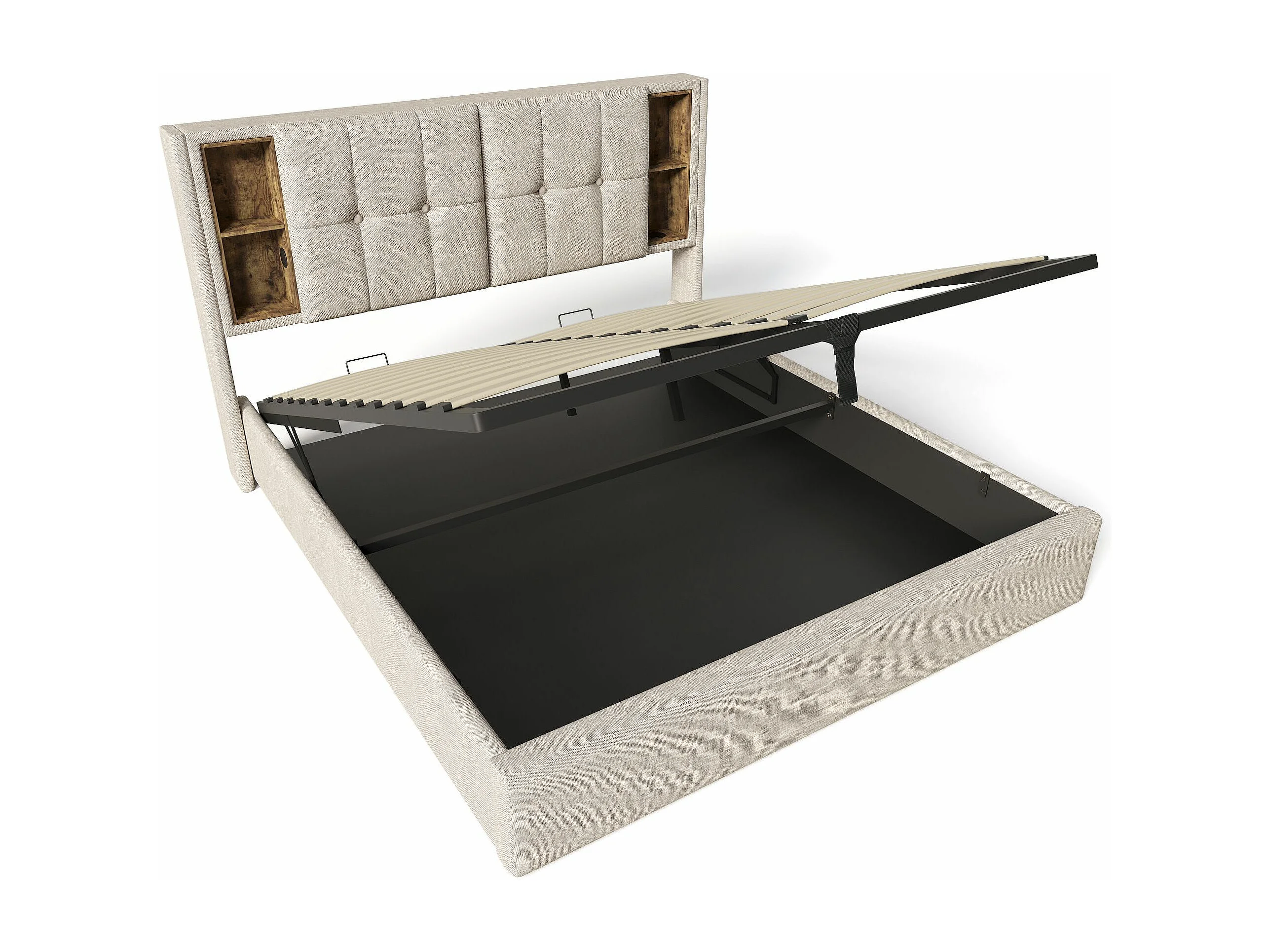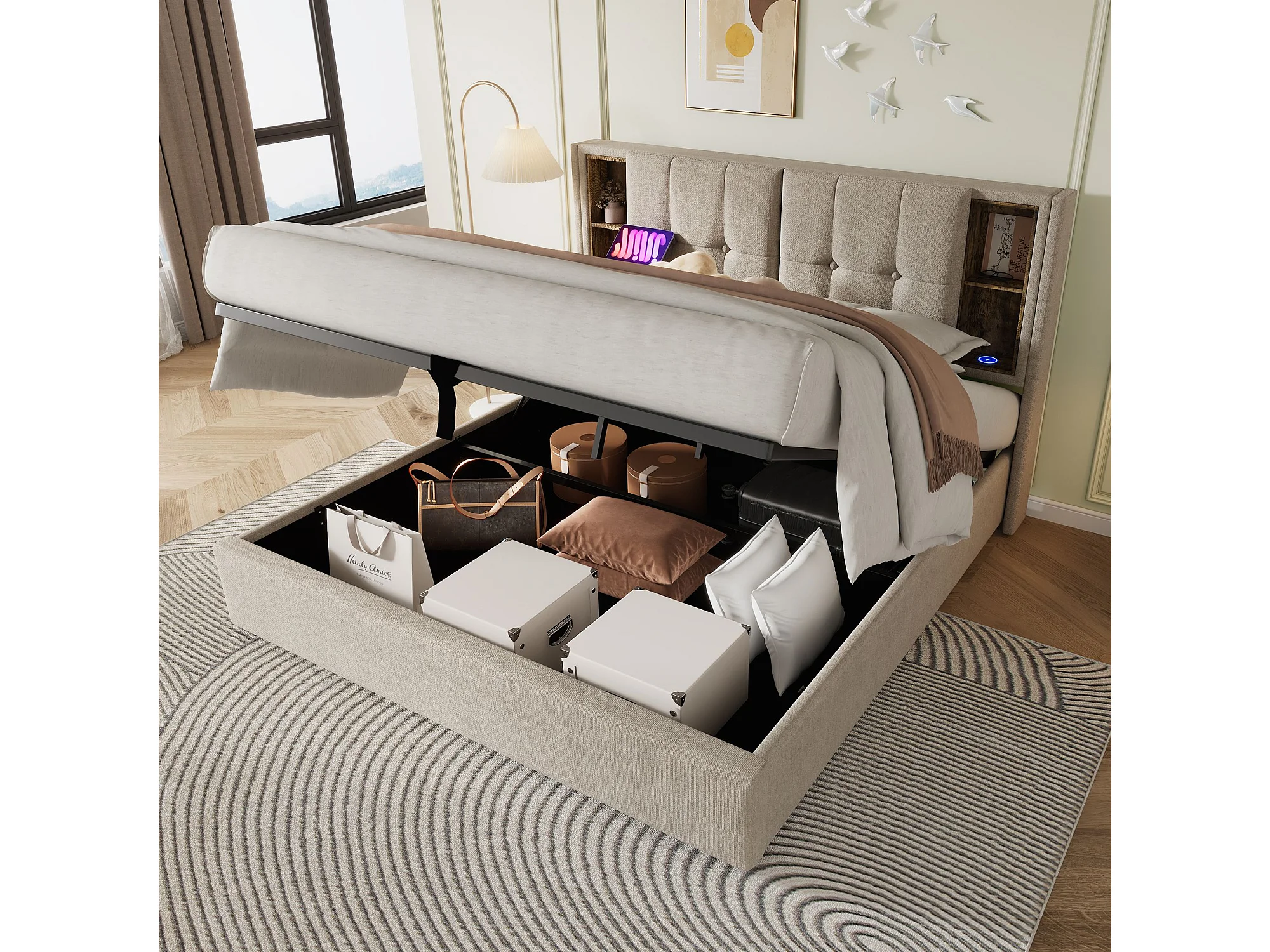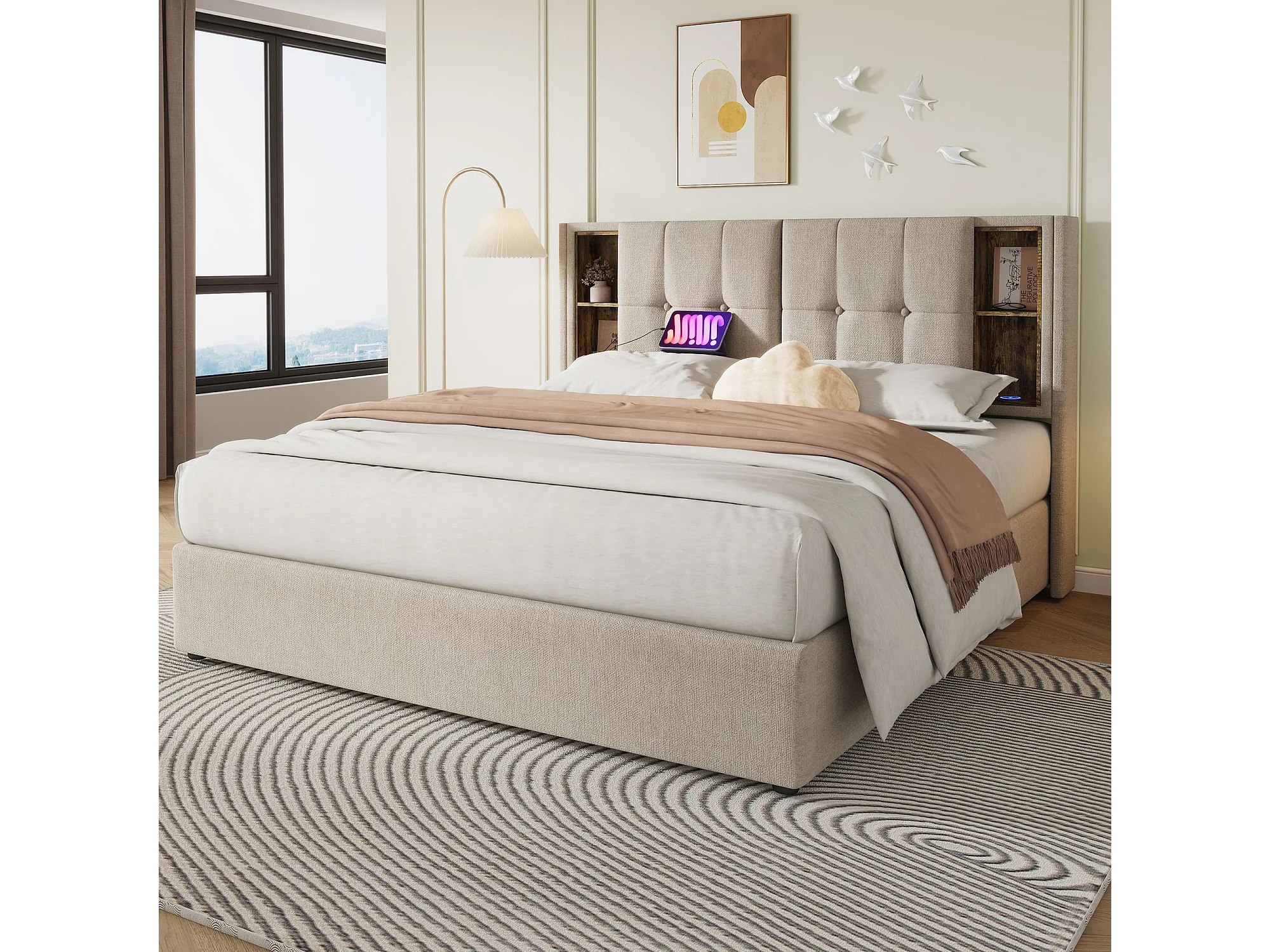 Lit adulte, cadre de lit double rembourré 180x200 cm, avec espace de rangement et recharge sans fil USB C, cadre de lit en bois et lin naturel