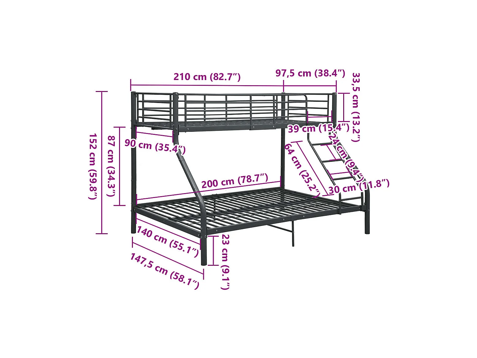 Lit adulte-Cadre de lit superposé sans matelas noir 140x200 cm/90x200 cm