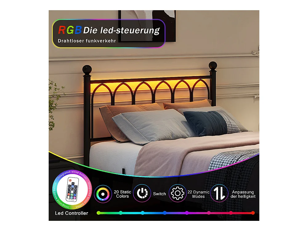 Lit adulte cadre en métal 120x200 cm avec tête et pied vintage station USB éclairage LED lattes acier rangement sous lit noir