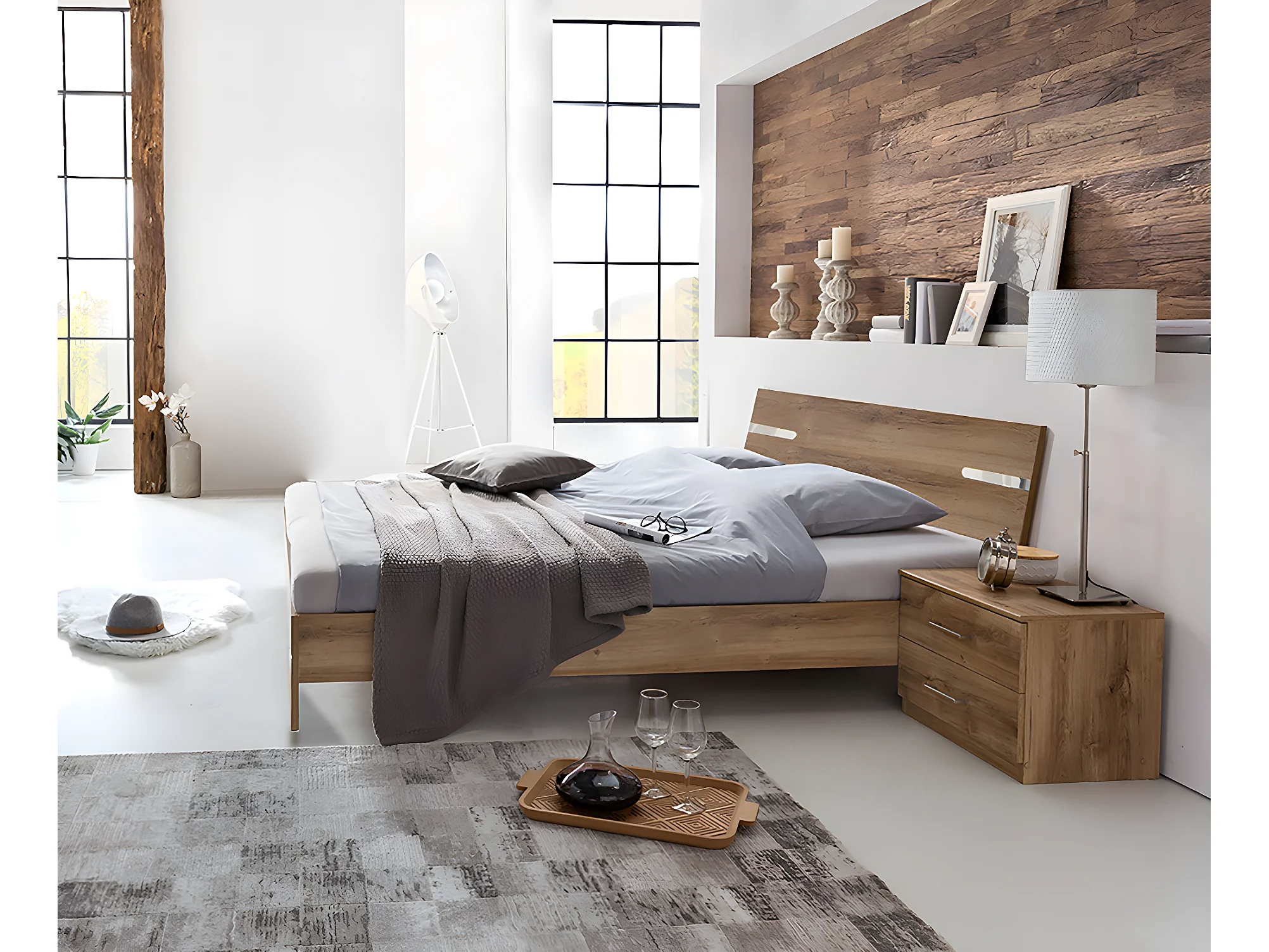 Lit adulte double 140 x 200cm + 2 chevets coloris imitation chêne poutre/chrome brillant