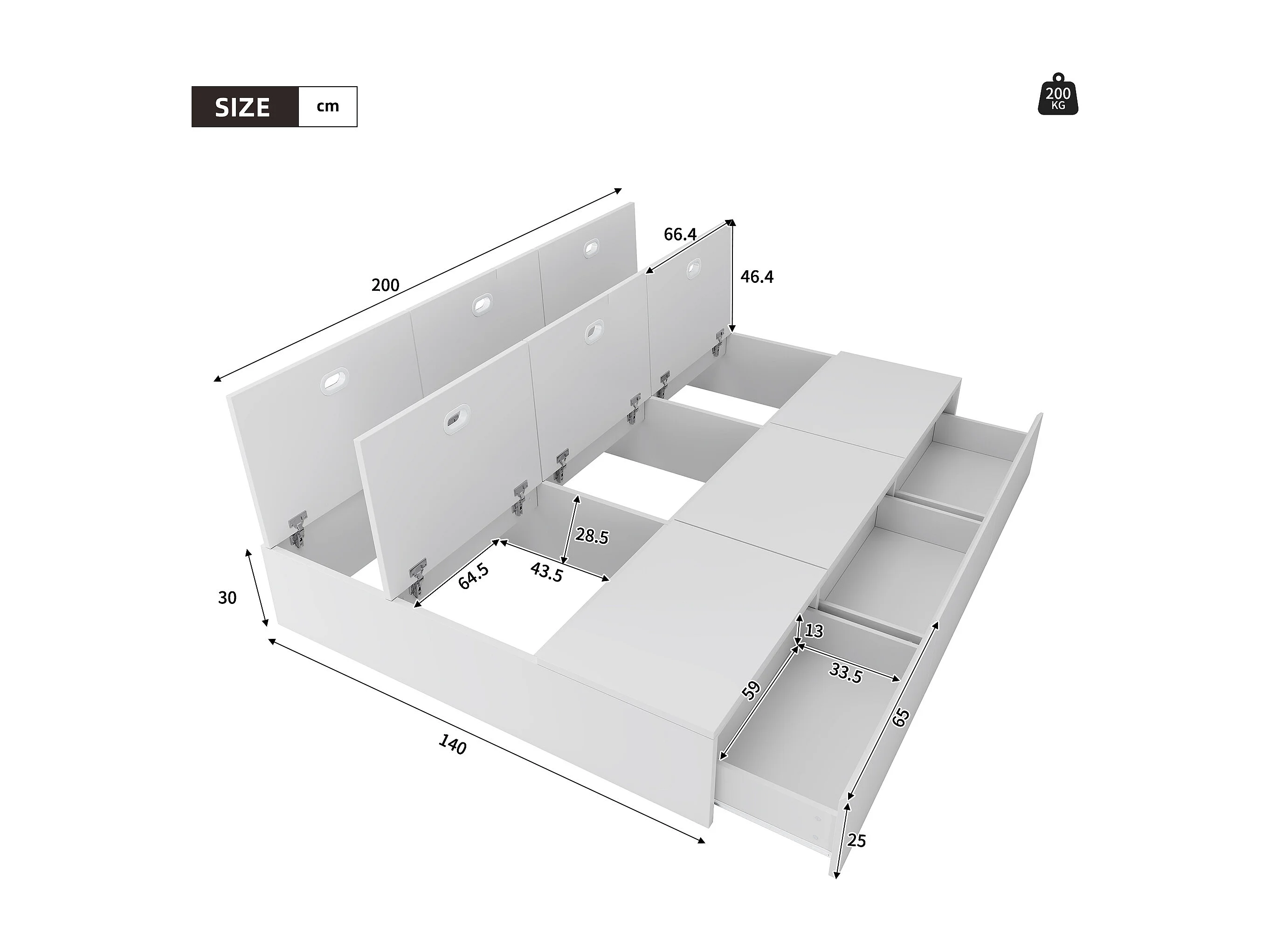 Lit adulte 140x200 cm - 3 tiroirs et coffre de rangement - en bois - blanc (sans tête de lit ni matelas)