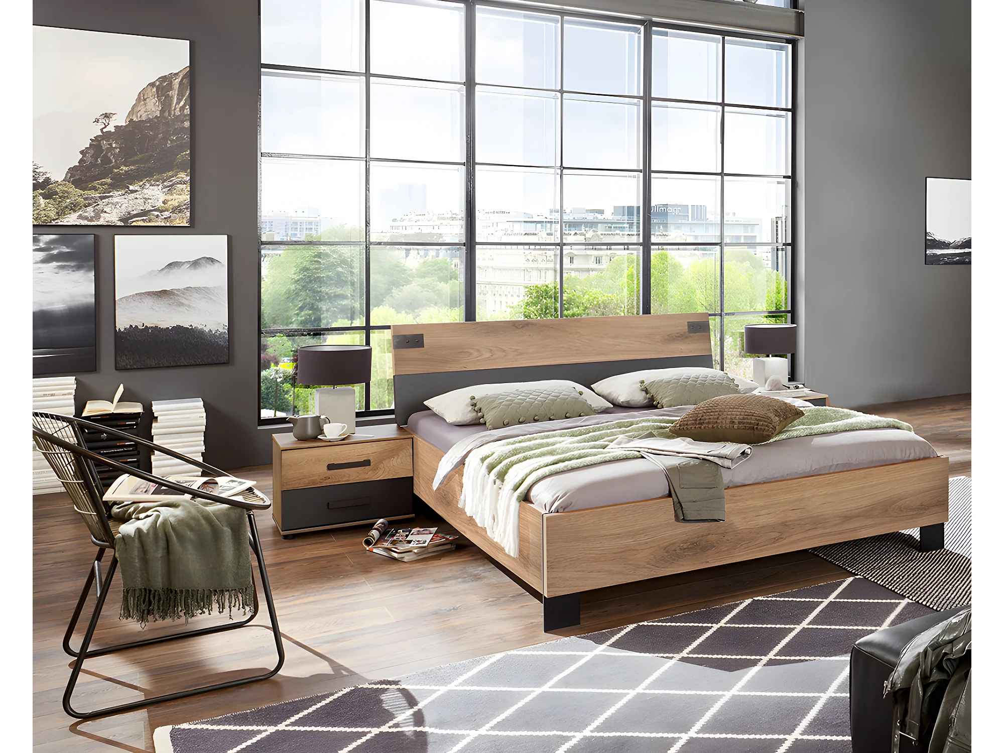 Lit adulte double + chevets coloris chêne foncé - L. 168 x P. 210 x H. 94 cm