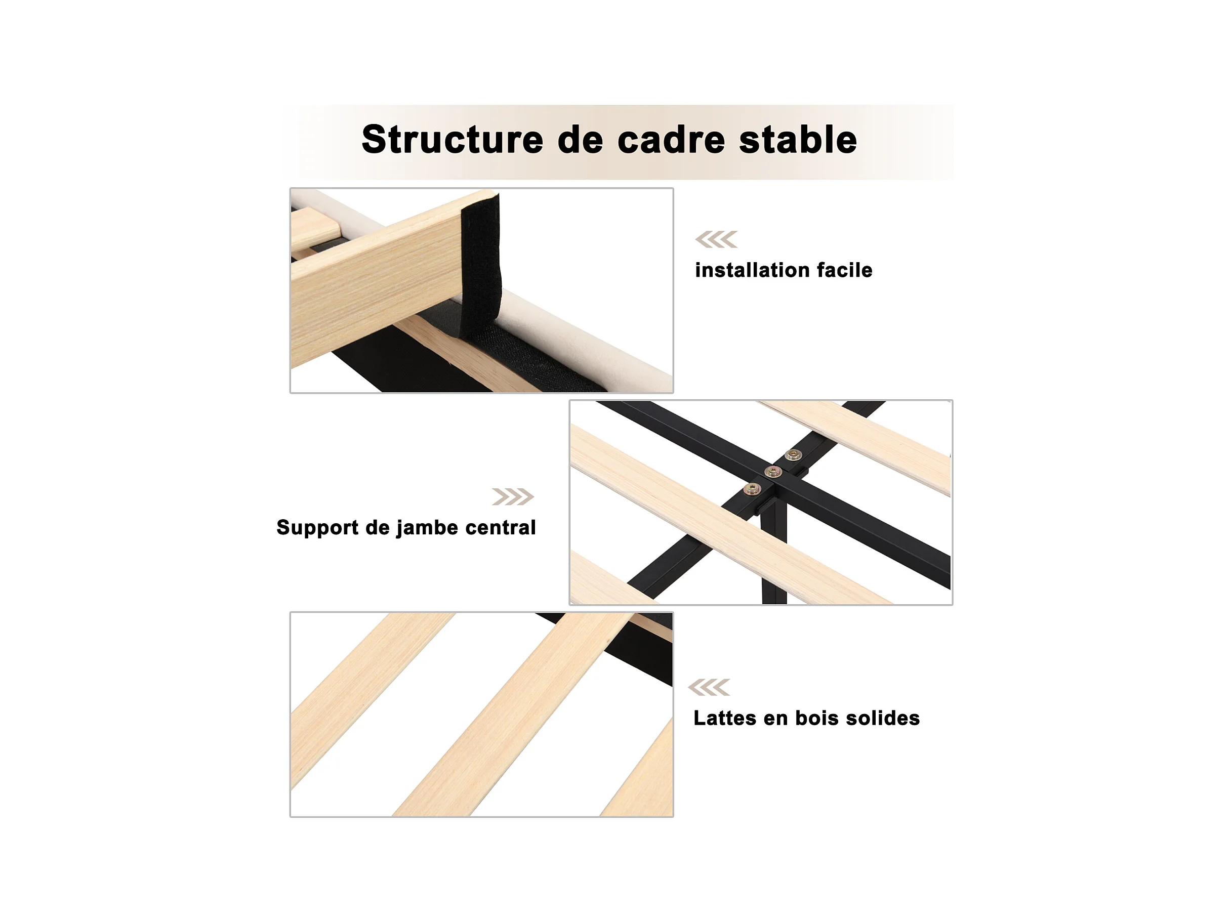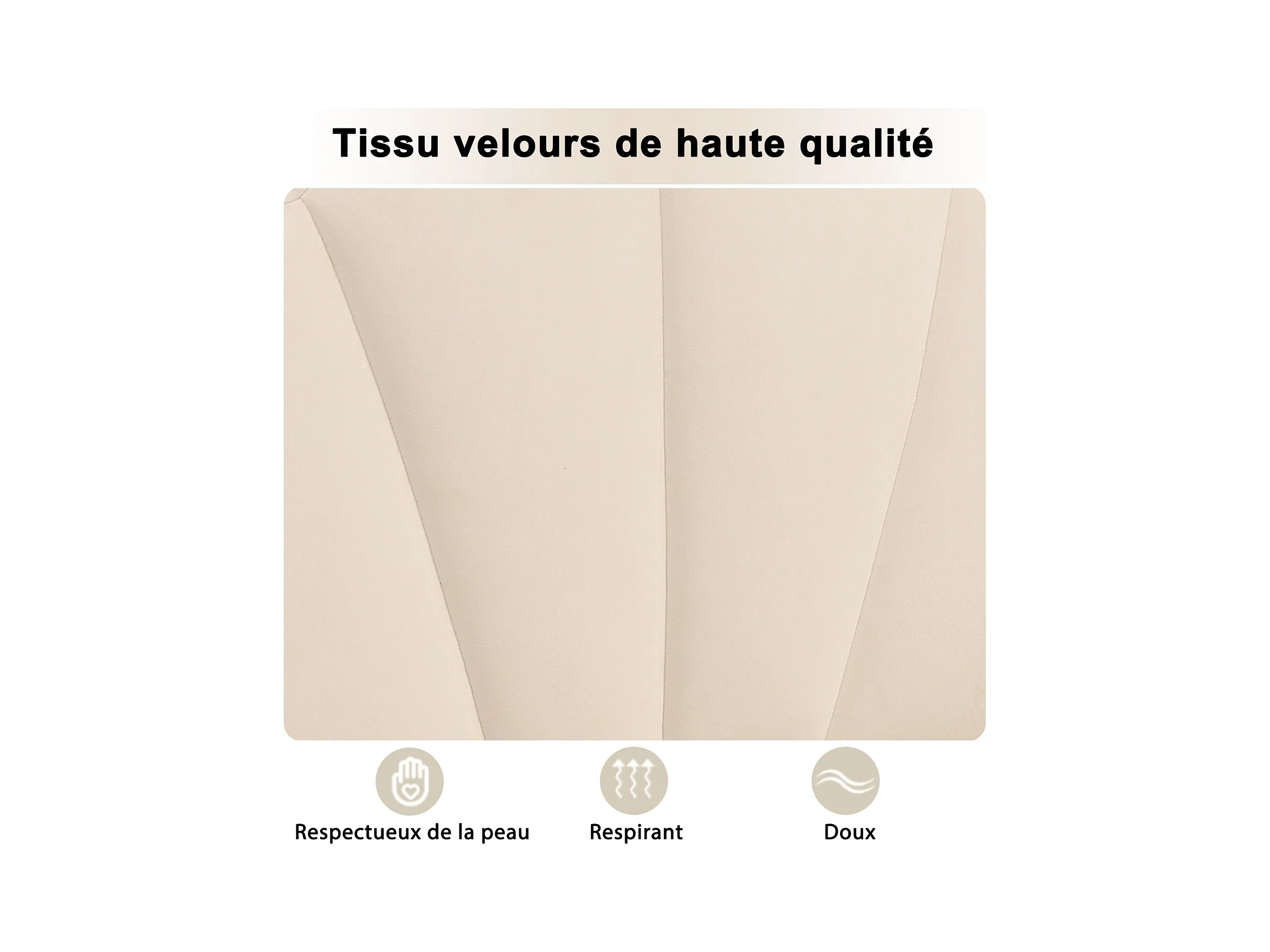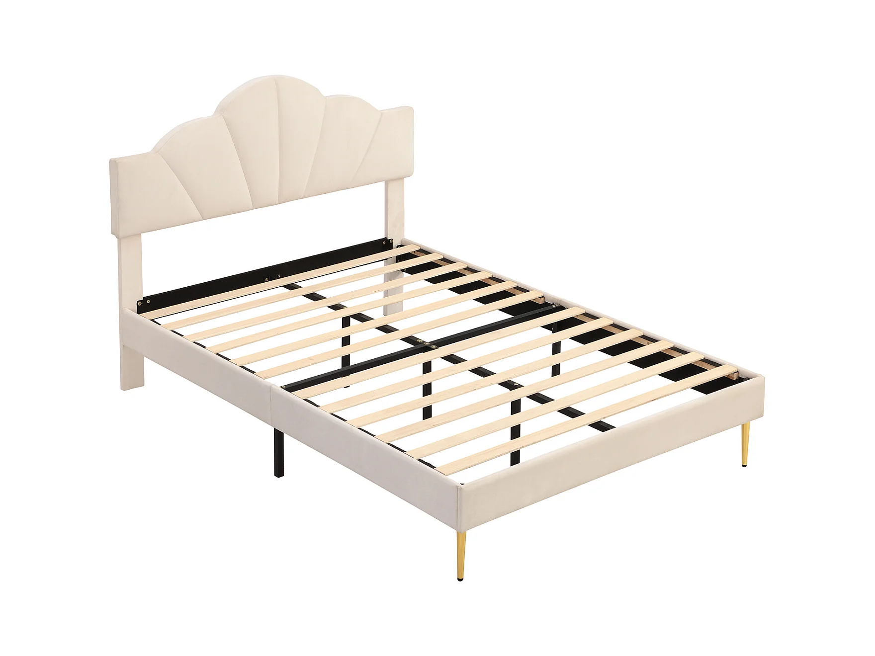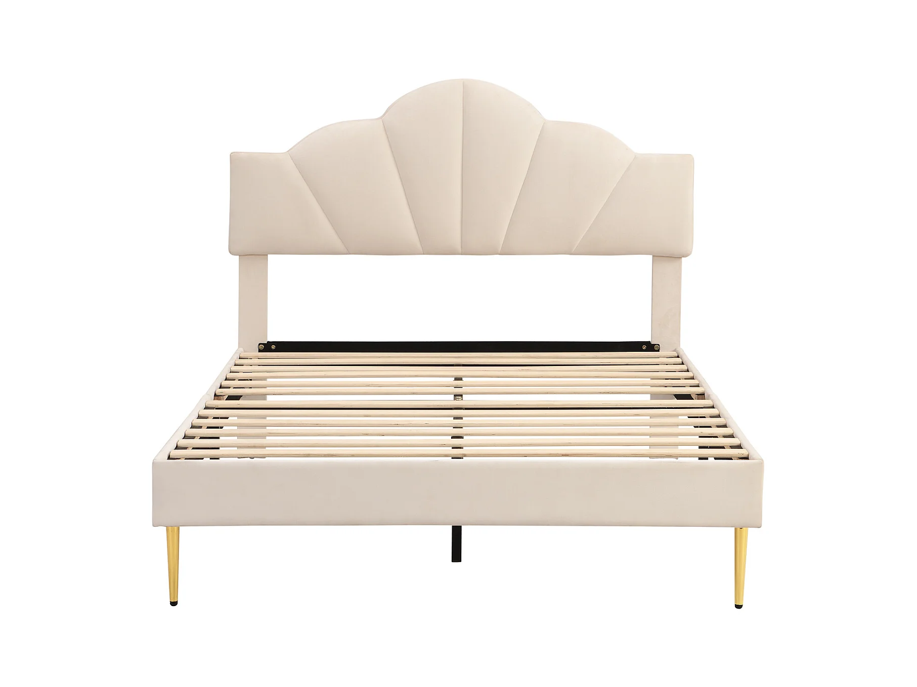 Lit adulte double rembourré en velours, avec sommier à lattes en bois, tête de lit réglable en forme de coquille, pieds en fer doré, 140x200cm beige
