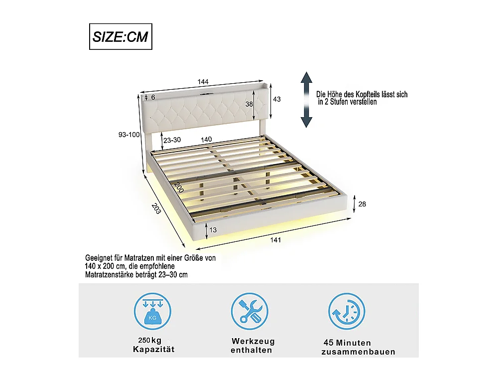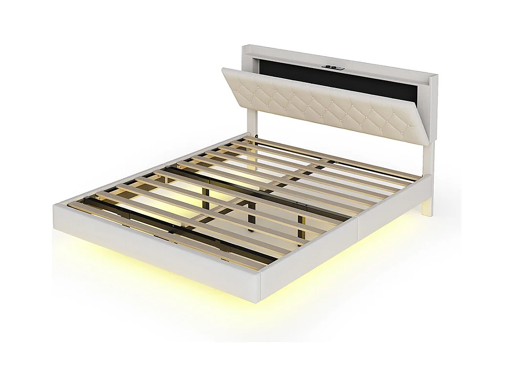 Lit adulte Lit avec rangement 140 x 200 Avec prise de charge USB et bande lumineuse LED lin Beige