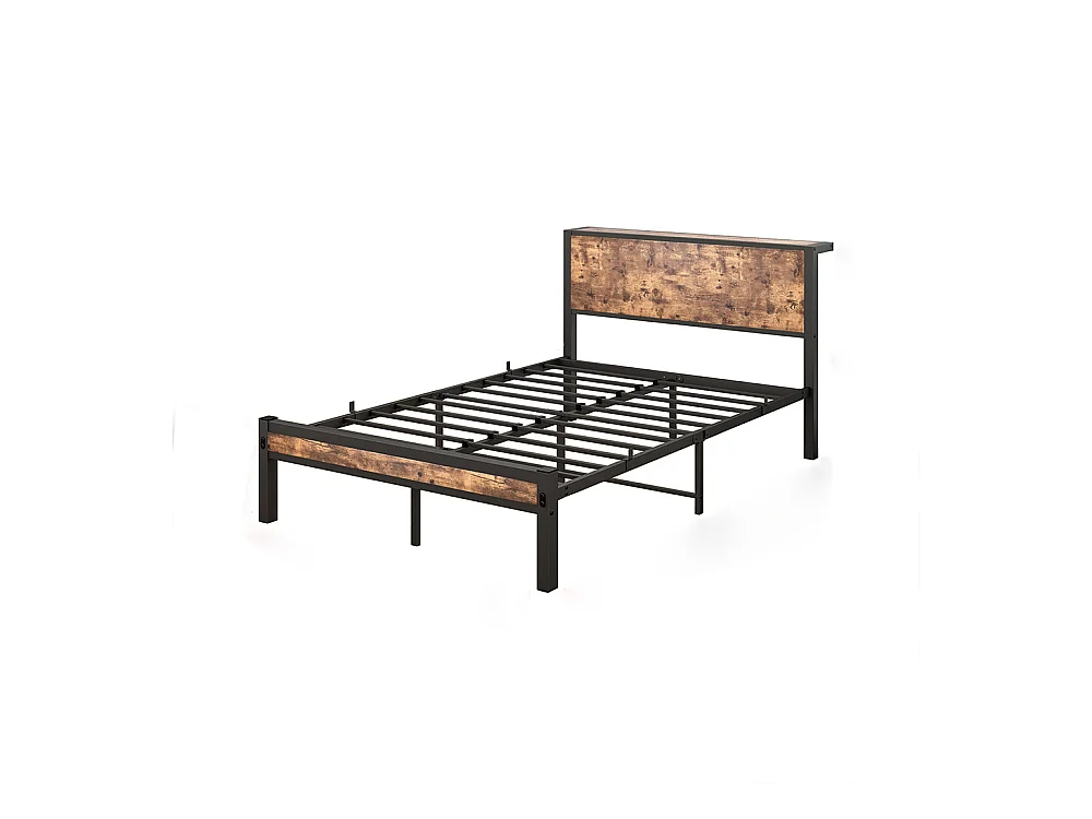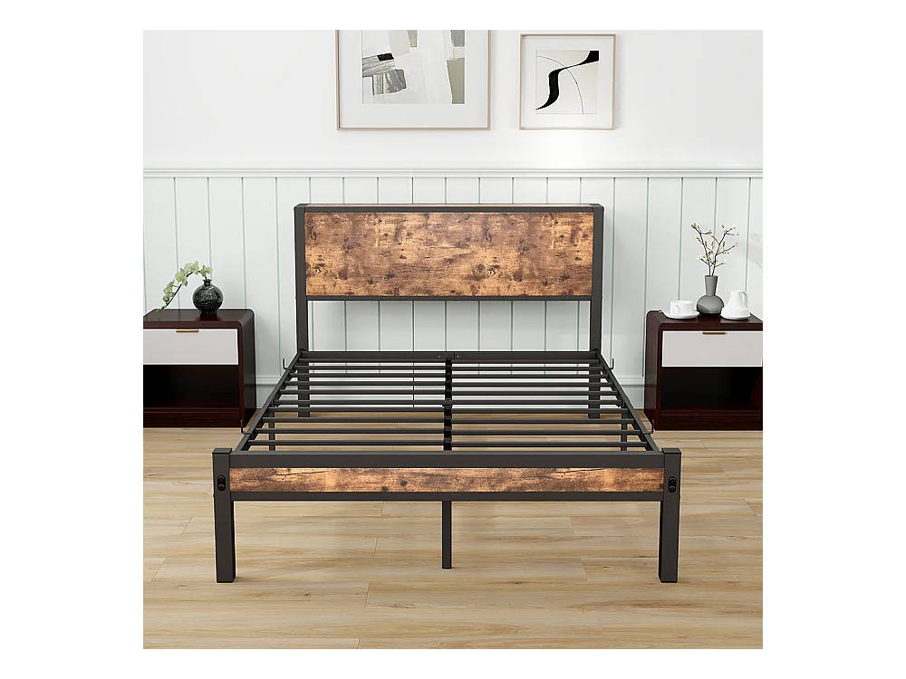 Lit adulte métallique 120x200 cm avec tête de lit et rangement sommier plateforme simple silencieux sans sommier tapissier vintage marron