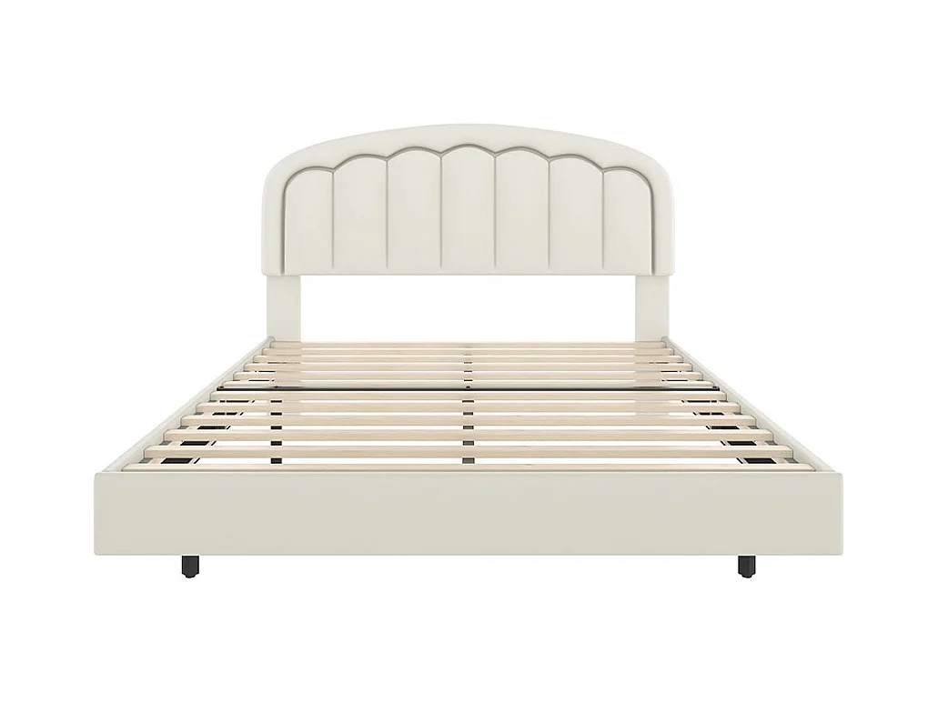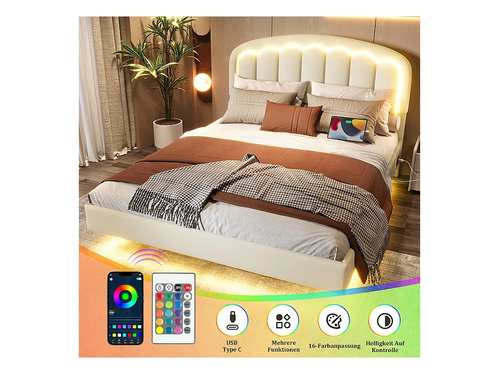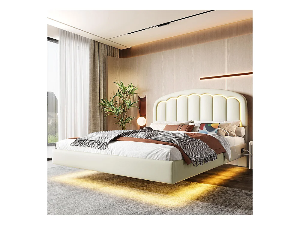 Lit adulte moderne 140x200 avec tête de lit en forme de pétales design suspendu et bande lumineuse LED structure métallique robuste blanc