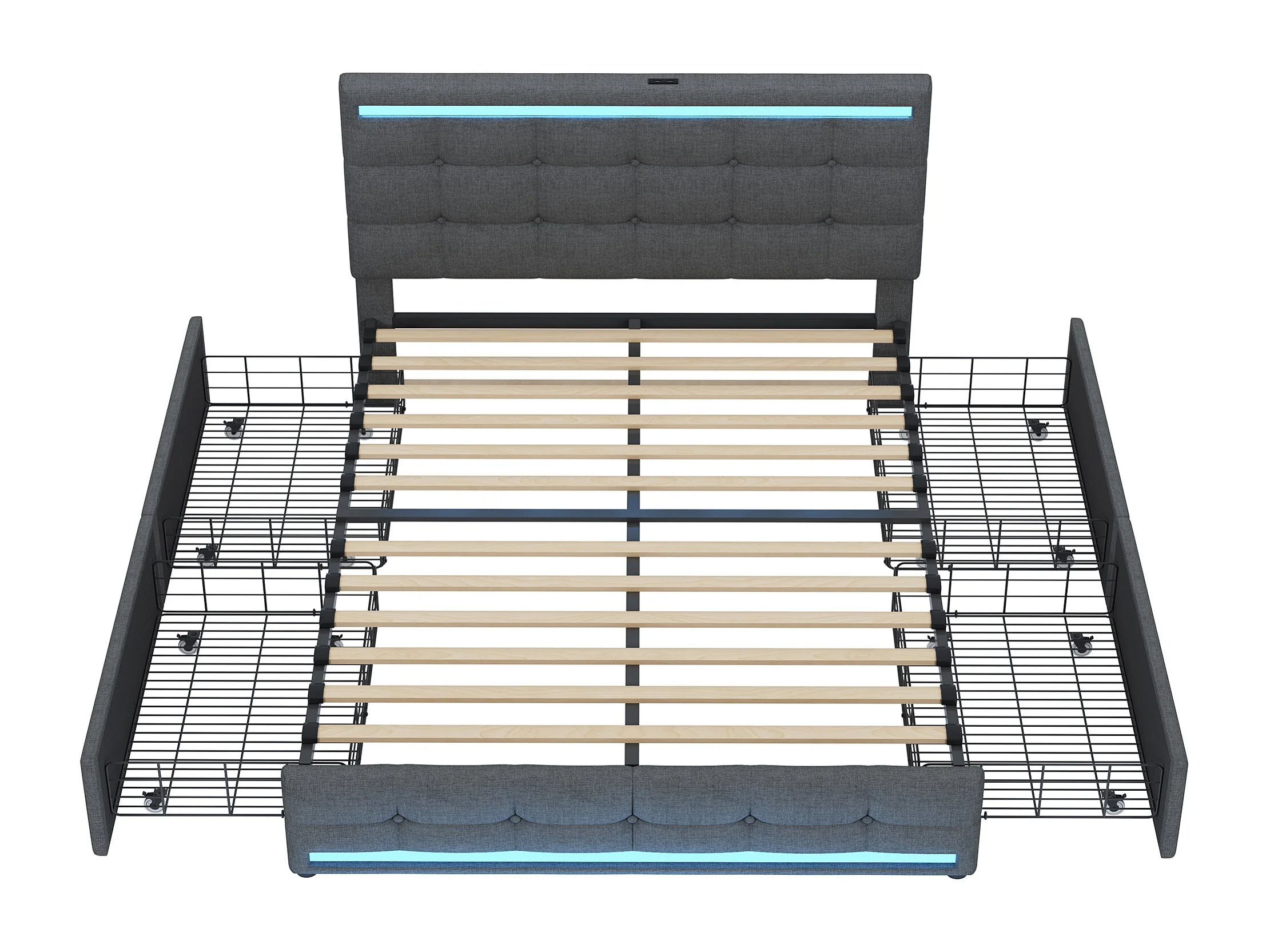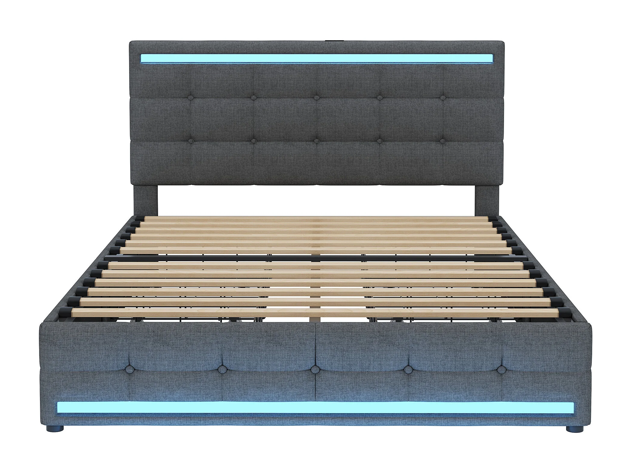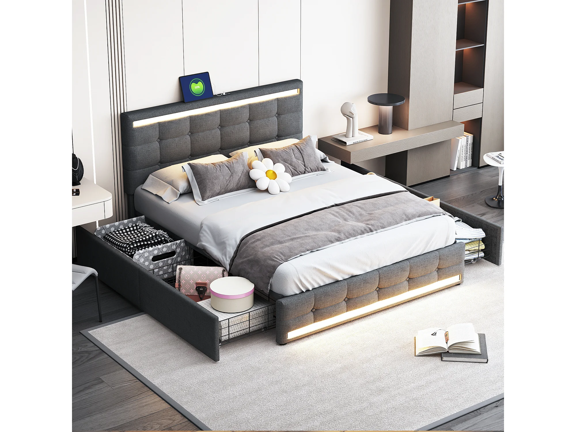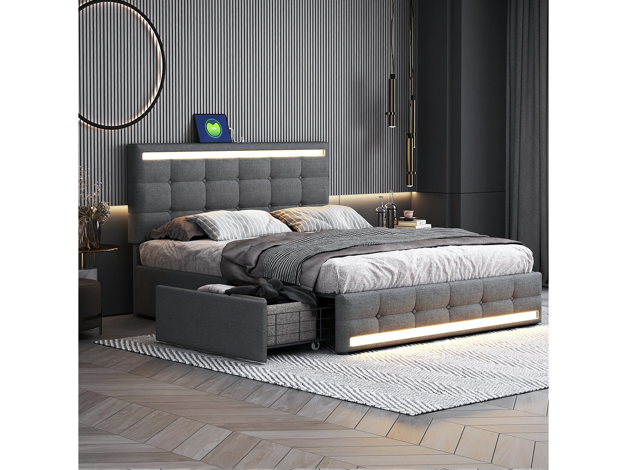 Lit capitonné en lin avec 4 tiroirs + LED et 2 ports USB + sommier à lattes - 140x200cm - lin - gris