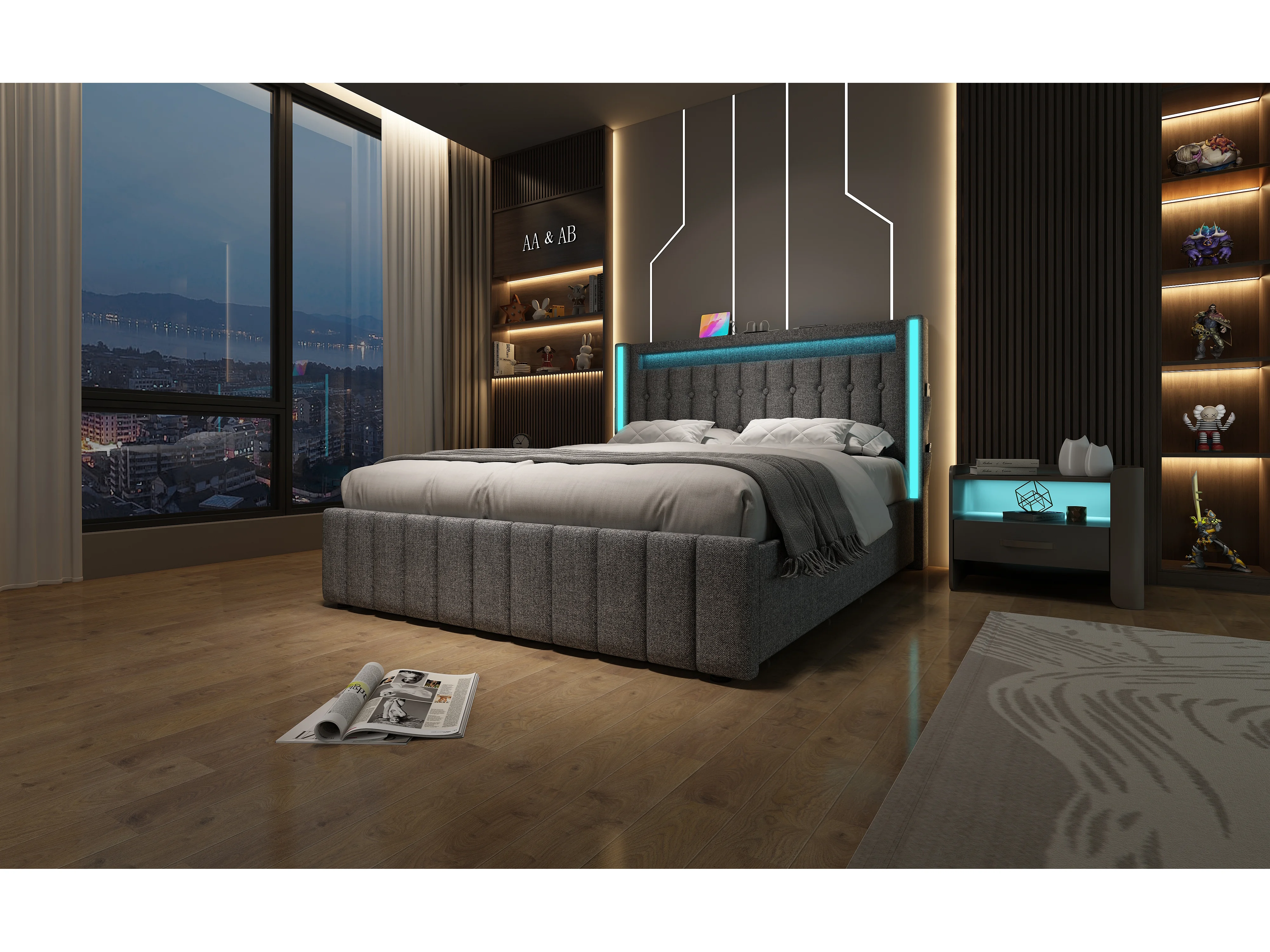 Lit avec fonction de chargement USB, éclairage LED et 4 tiroirs, 160x200 cm, gris, avec tête de lit en lin