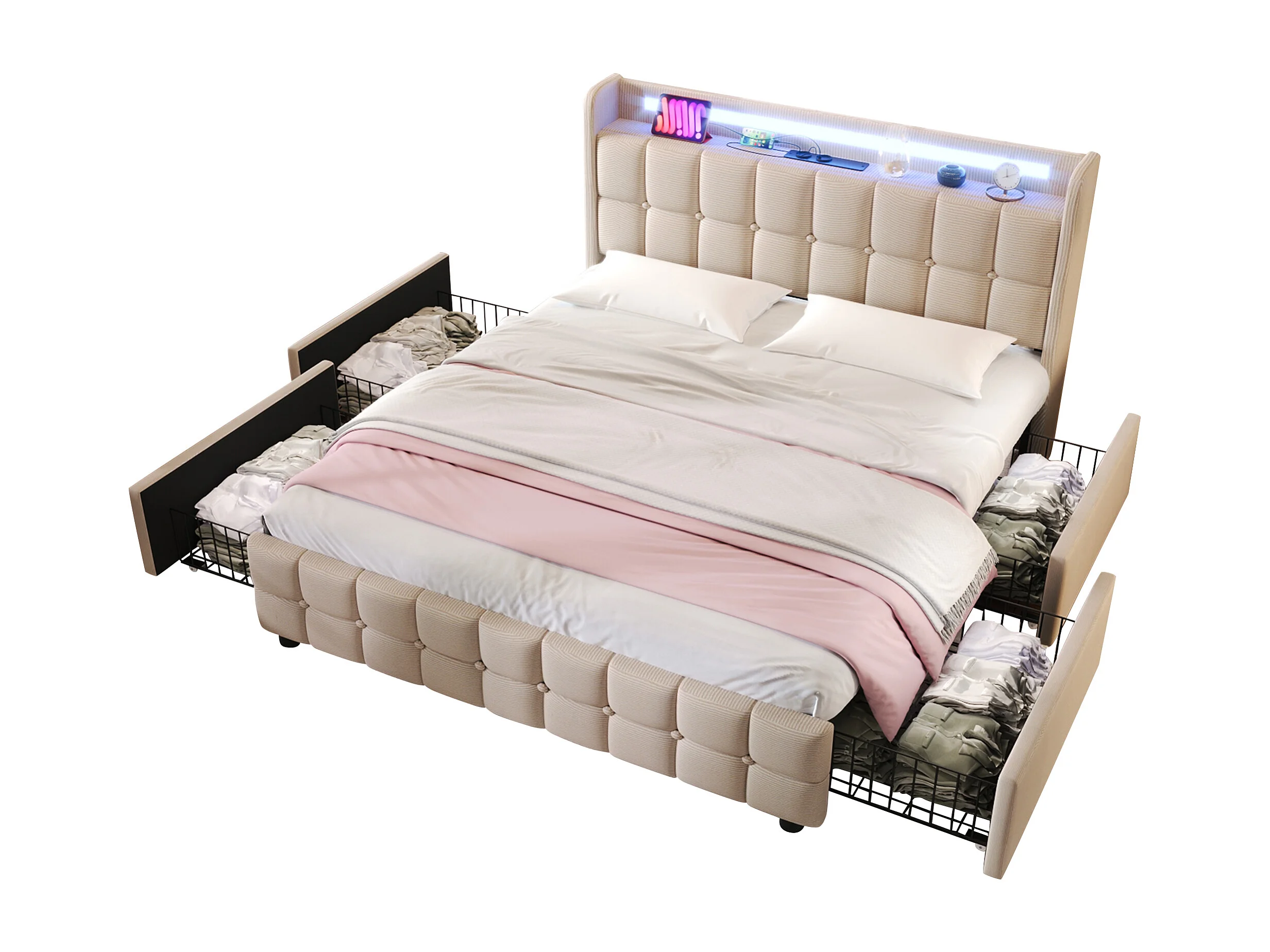 Lit avec fonction de chargement USB, éclairage LED et 4 tiroirs, 180x200 cm, beige, design moderne