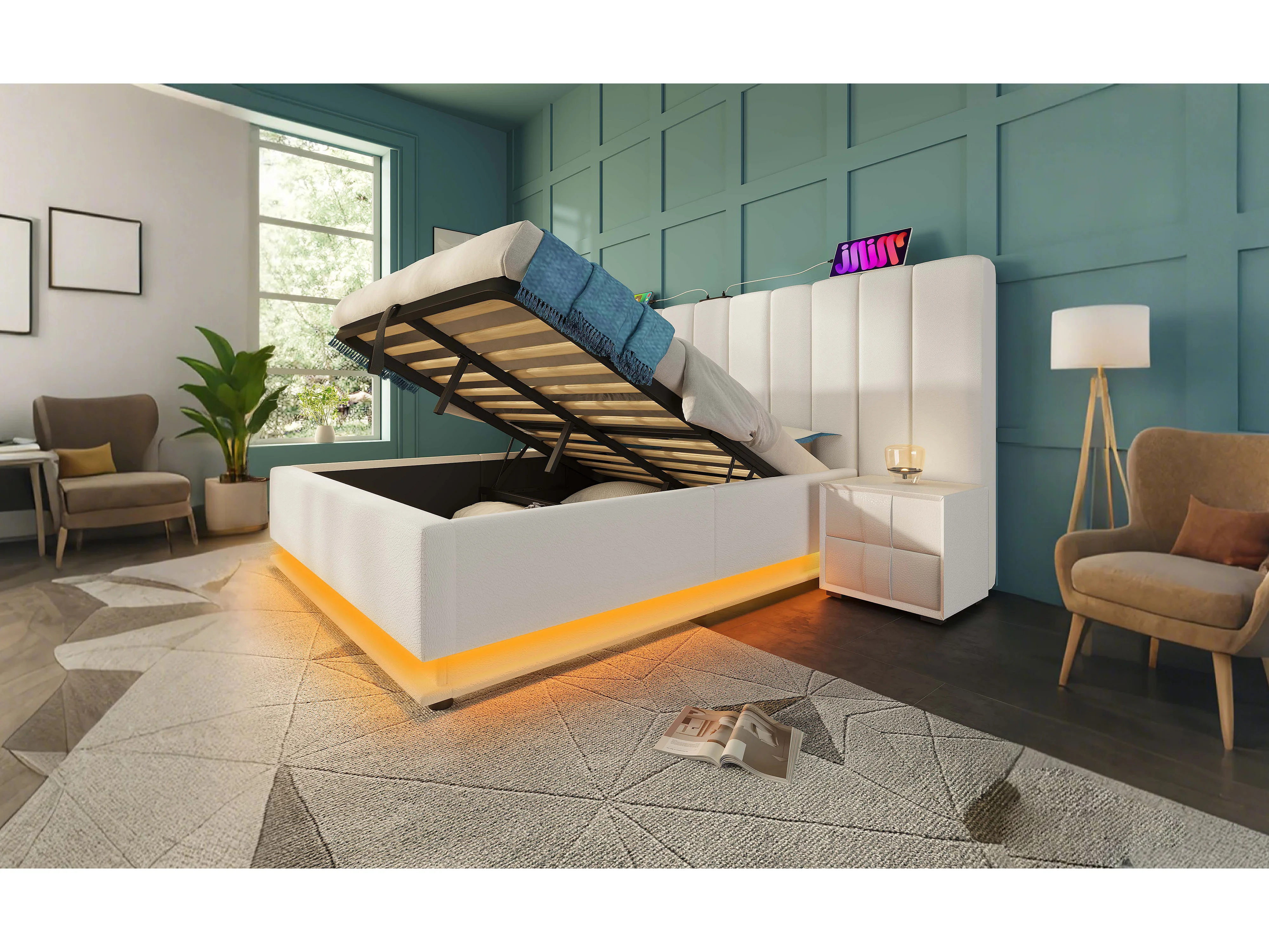 Lit avec rangement hydraulique 160×200 cm, éclairage LED contrôlé par application, blanc, sans matelas