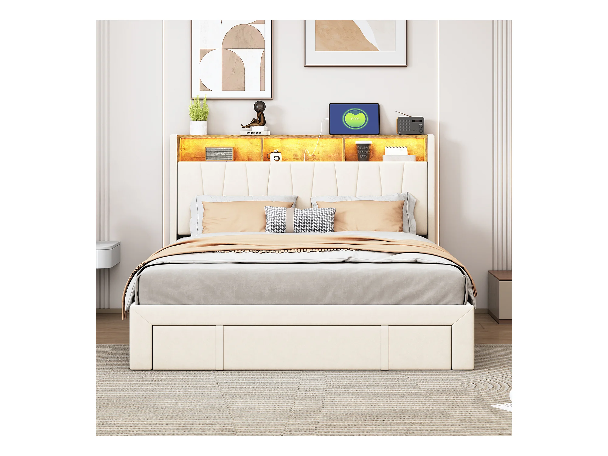 Lit avec rangements 160x200cm - Lit double avec tête de lit, éclairage LED, recharge USB et Type-C - 3 tiroirs - Tissu velours - Beige